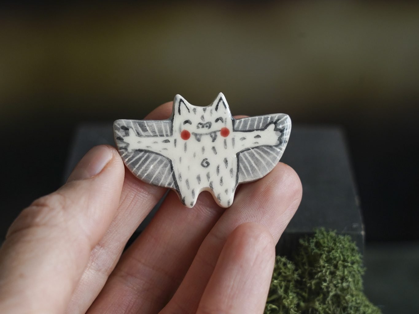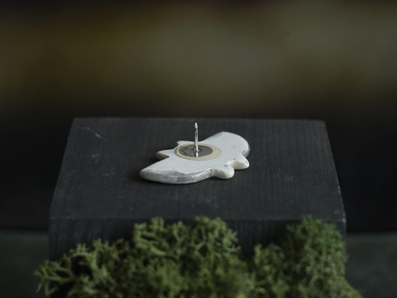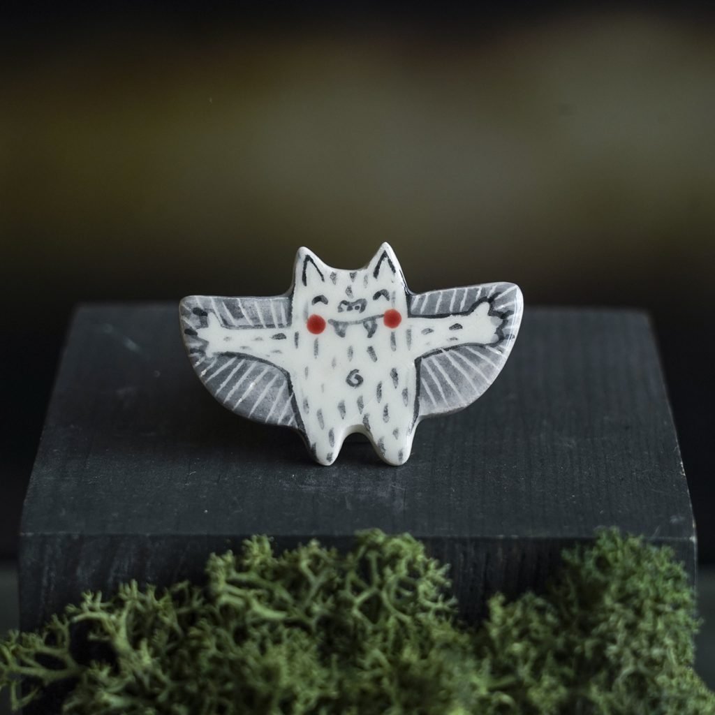 Ceramic parts are made from earthenware clay, fired at approx 1000 C, then hand-painted, glazed bright and fired again. Metal part of the pin is made from stainless steel.