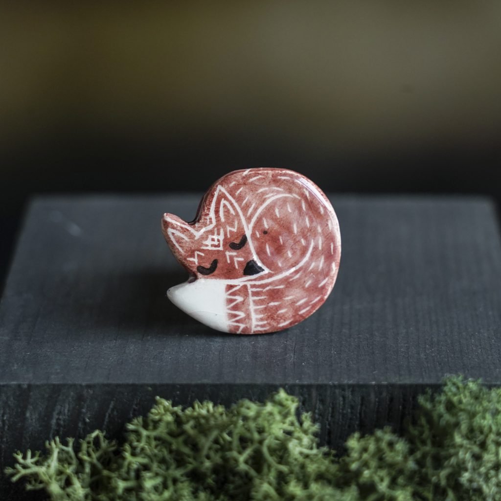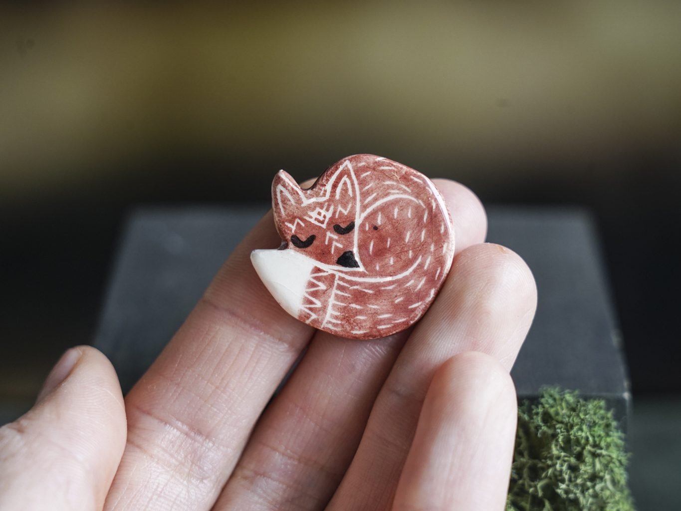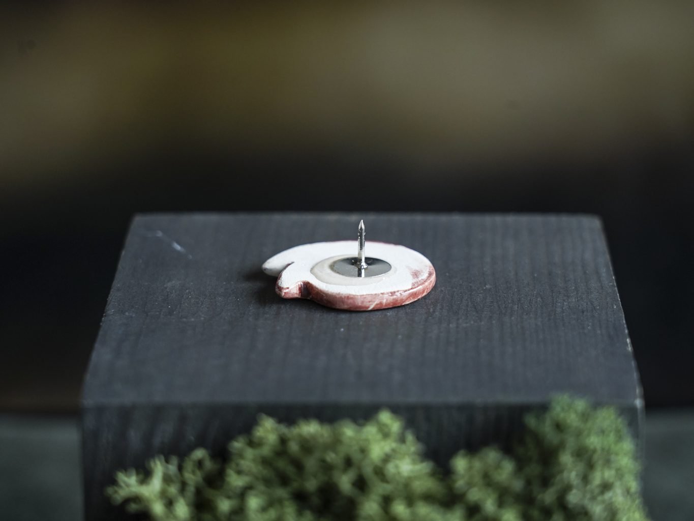 Ceramic parts are made from earthenware clay, fired at approx 1000 C, then hand-painted, glazed bright and fired again. Metal part of the pin is made from stainless steel.