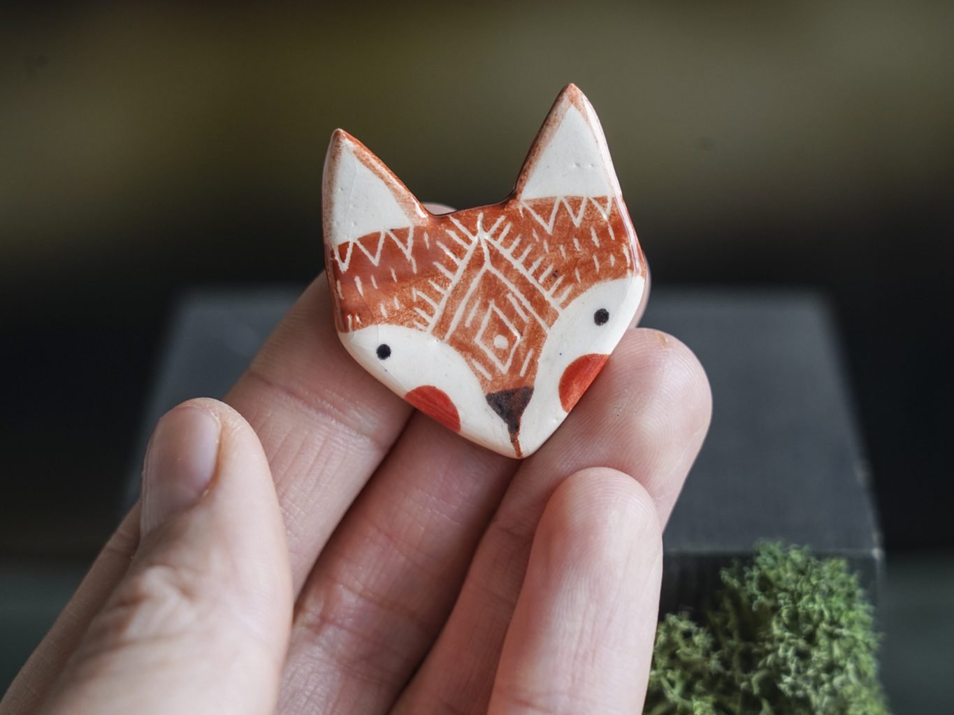 Ceramic parts are made from earthenware clay, fired at approx 1000 C, then hand-painted, glazed bright and fired again. Metal part of the pin is made from stainless steel.