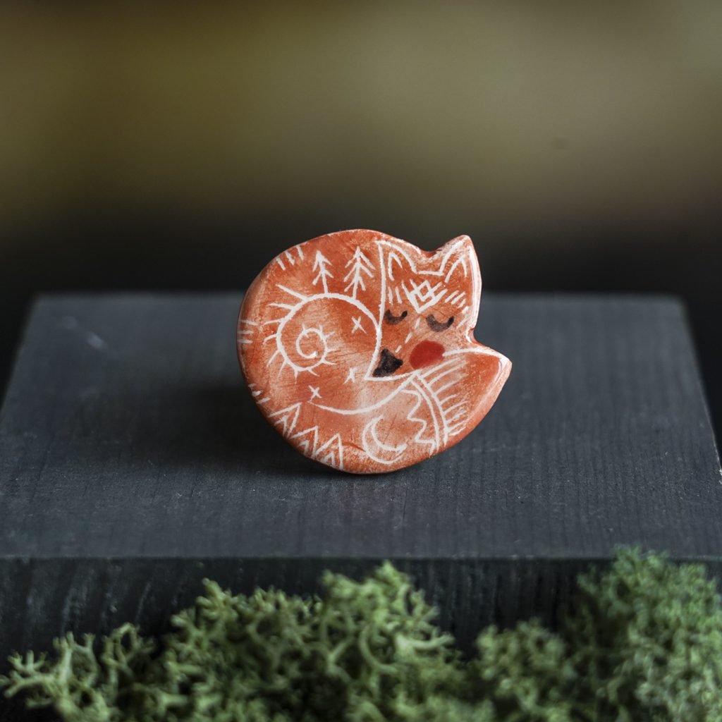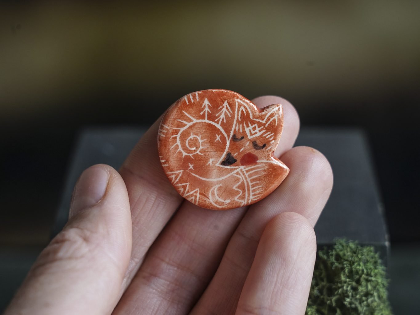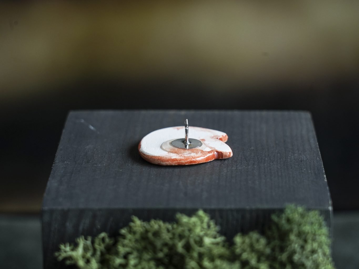 Ceramic parts are made from earthenware clay, fired at approx 1000 C, then hand-painted, glazed bright and fired again. Metal part of the pin is made from stainless steel.