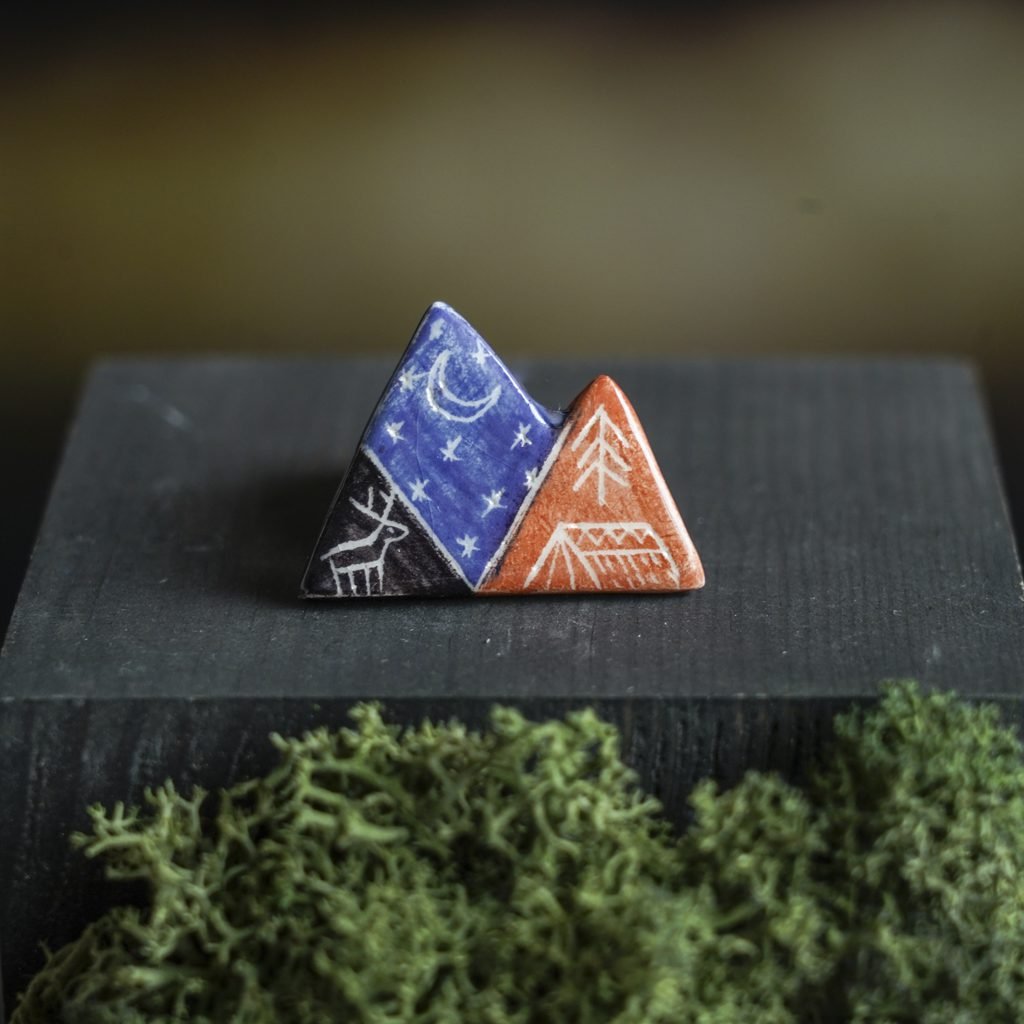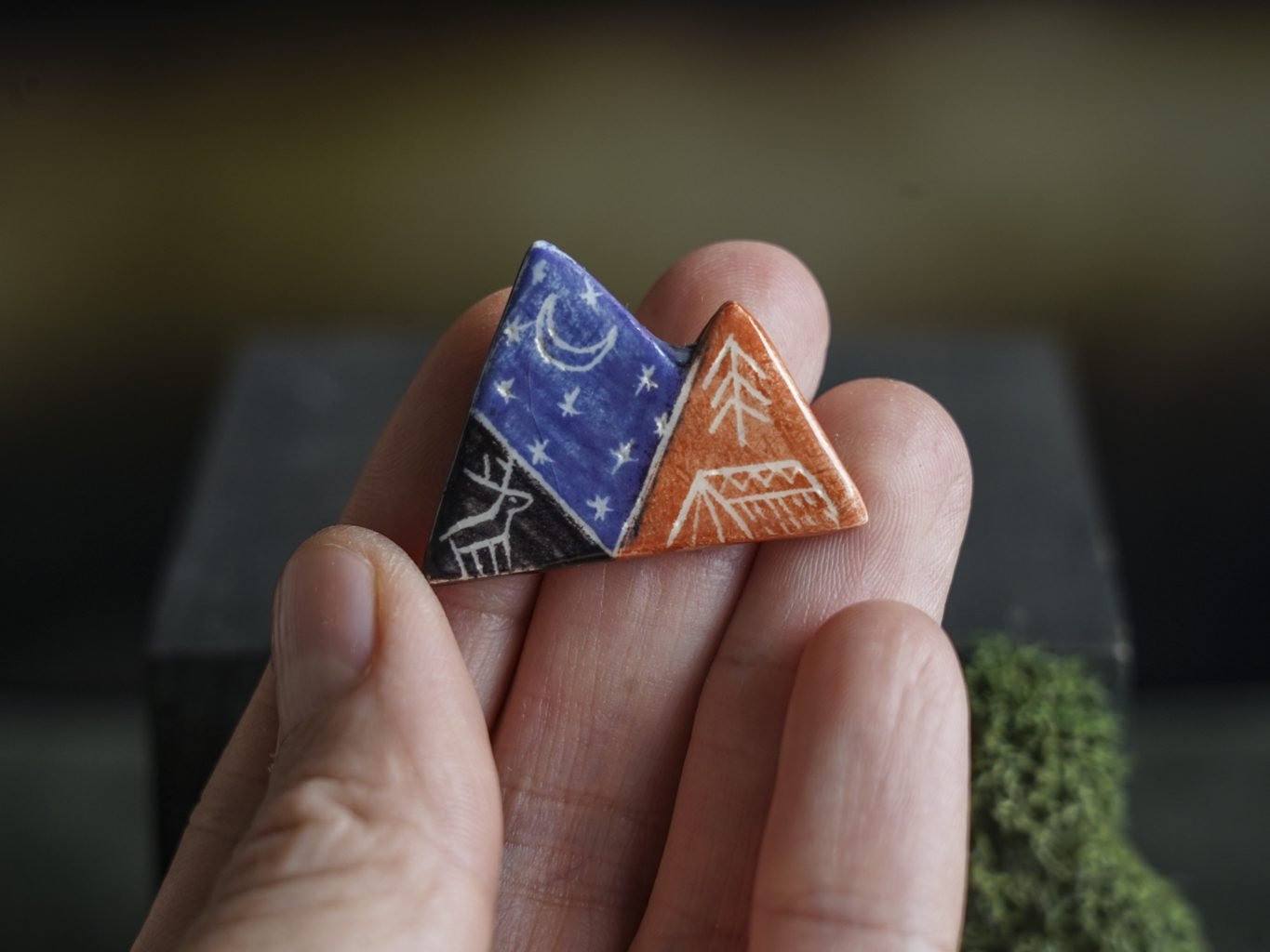 Ceramic parts are made from earthenware clay, fired at approx 1000 C, then hand-painted, glazed bright and fired again. Metal part of the pin is made from stainless steel.