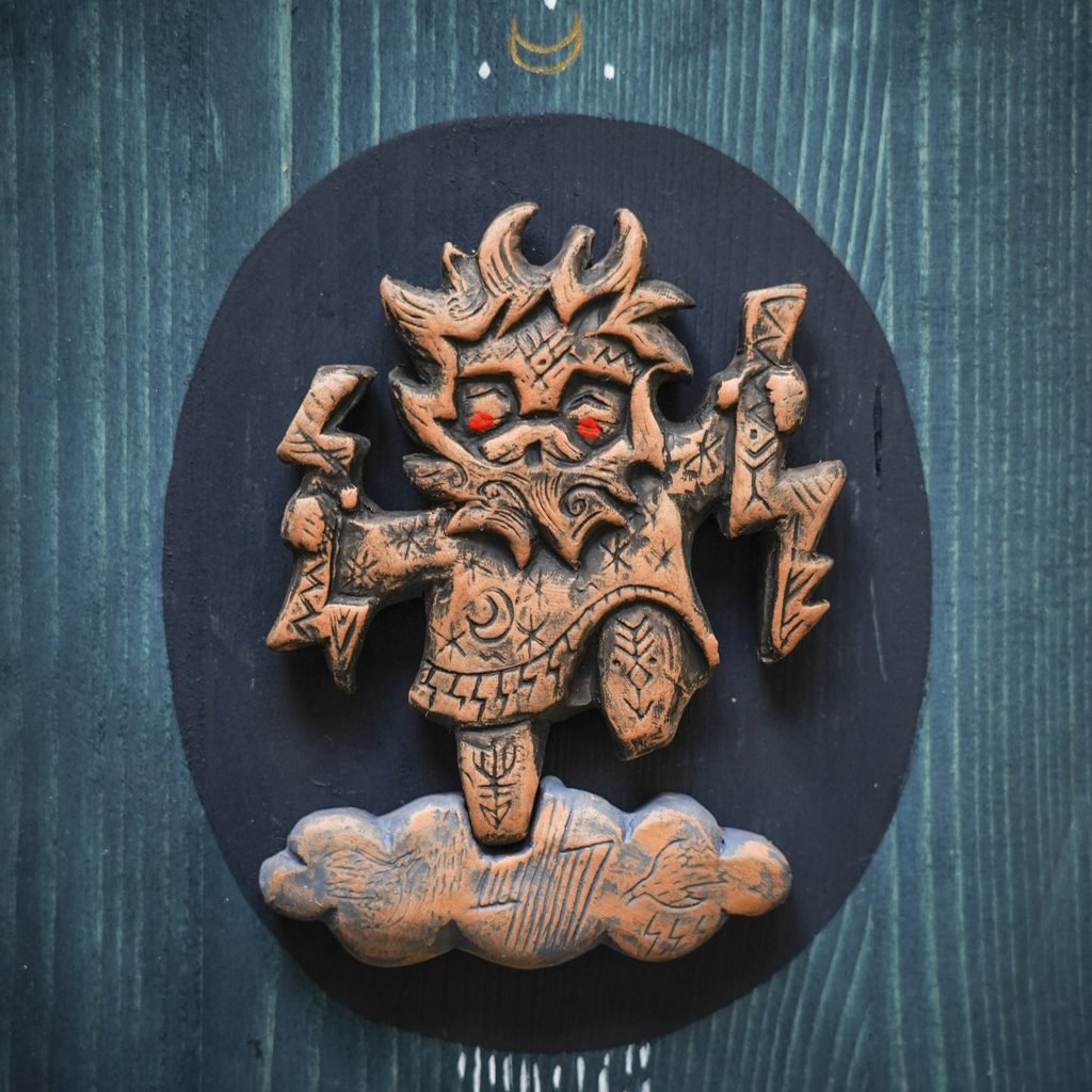Šio paveikslėlio idėja – žaismingas ir pašėlęs baltų dievybės Perkūno pavaizdavimas. Pasišiaušęs nuo vėjo, trypiantis kojomis debesis, griaudžia Dundulis. Debesyse skrajoja Perkūno oželiai, kol Perkūnas dainuoja mums lietaus sakmes. Tegul dunda dundulis linksmai ir tegul lietus atneša gyvybę ir augina.