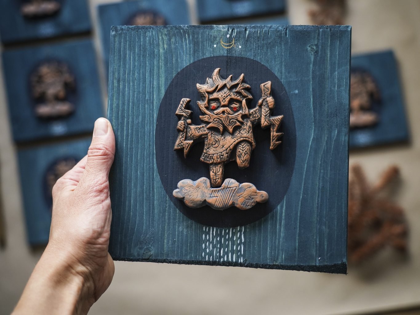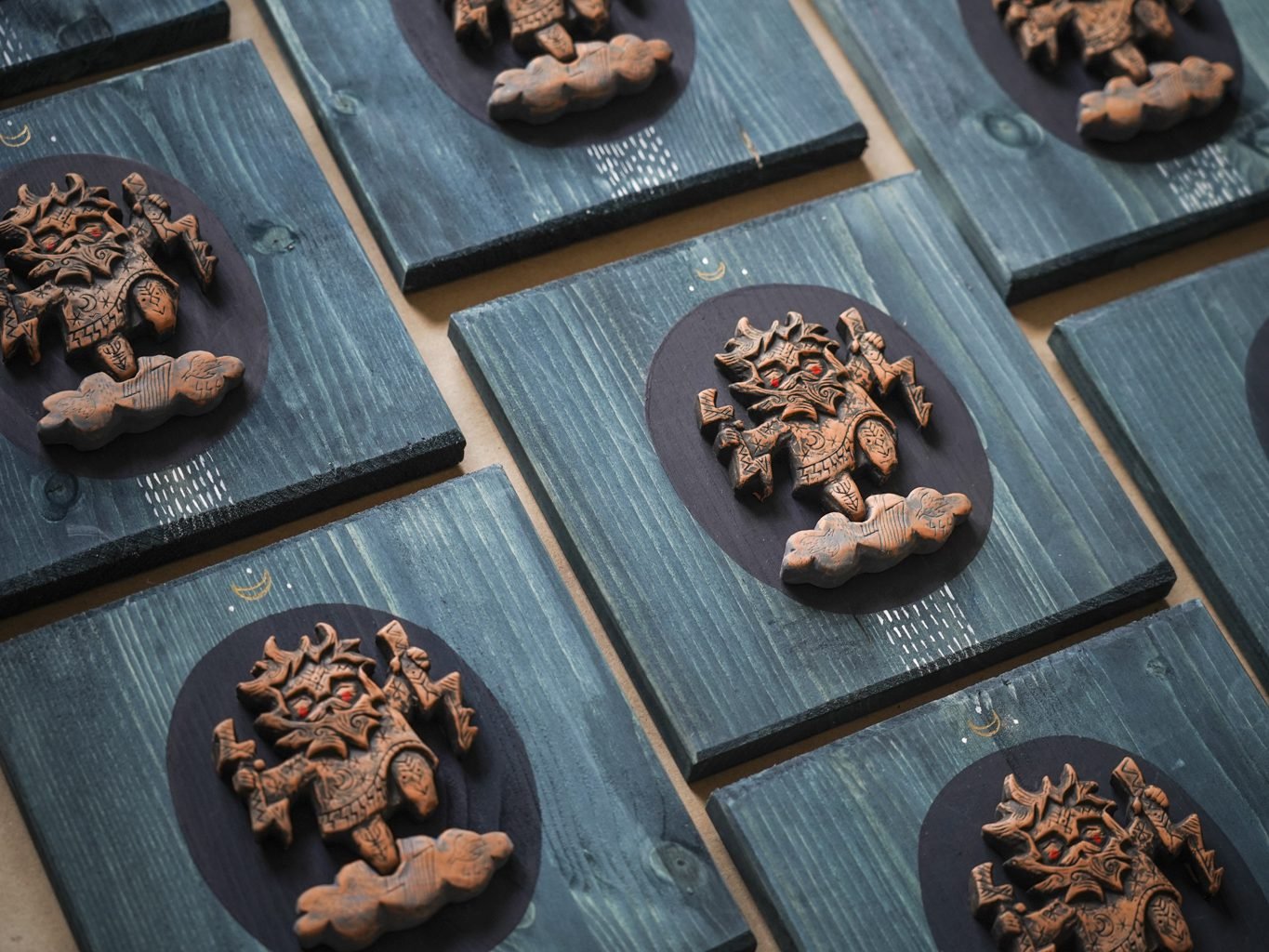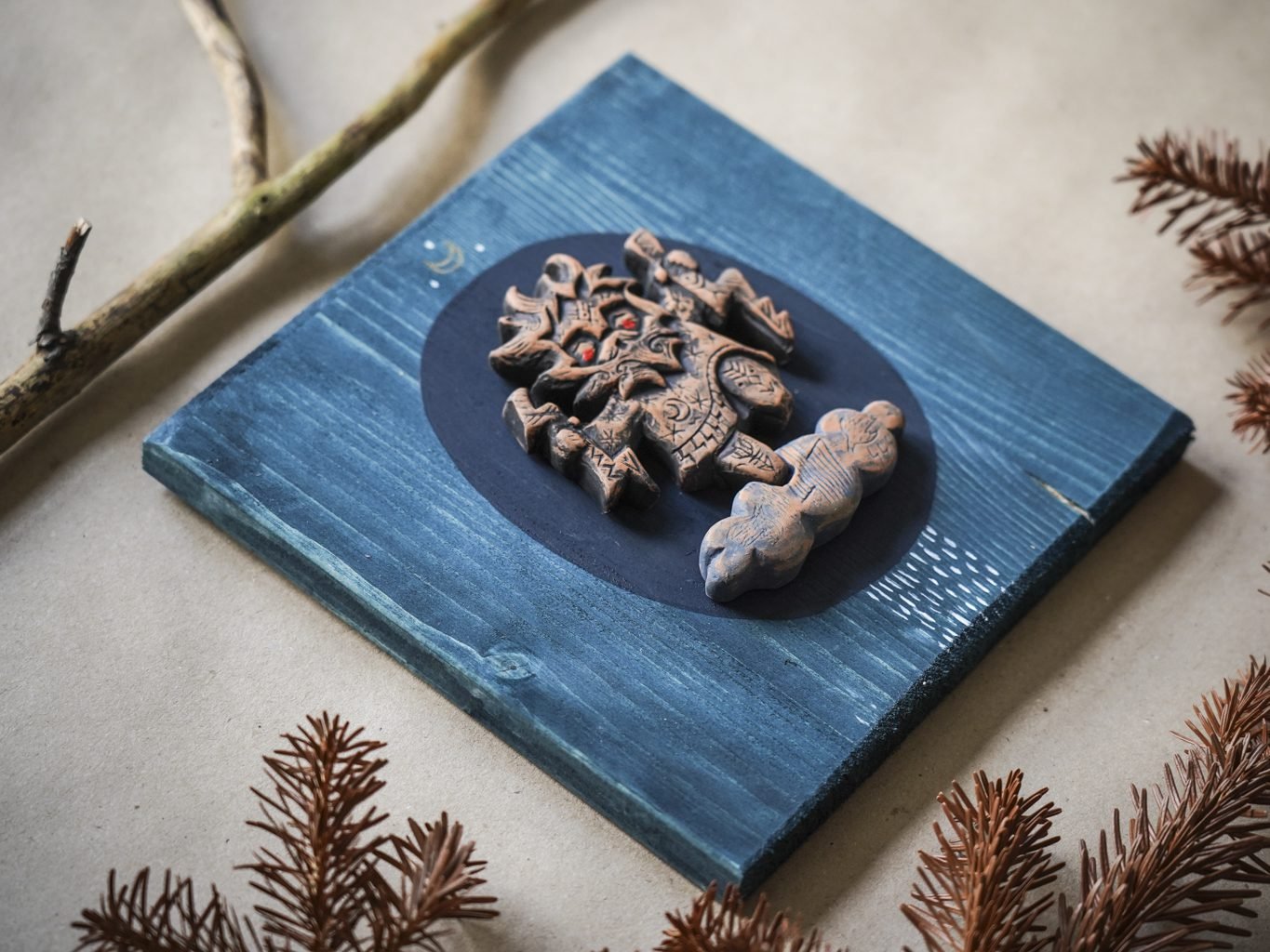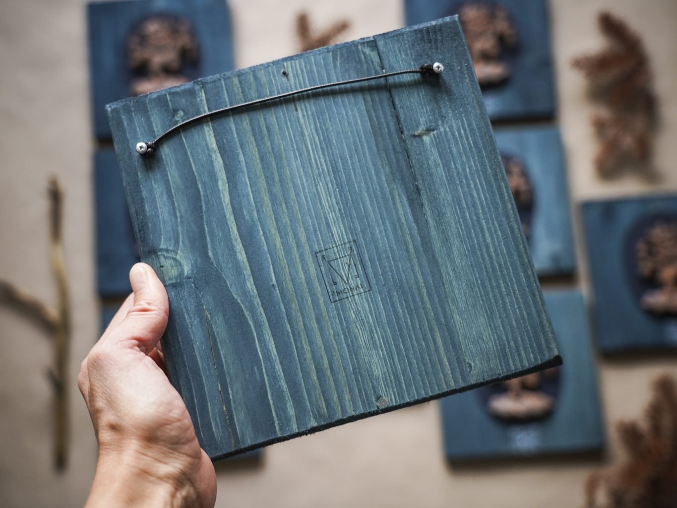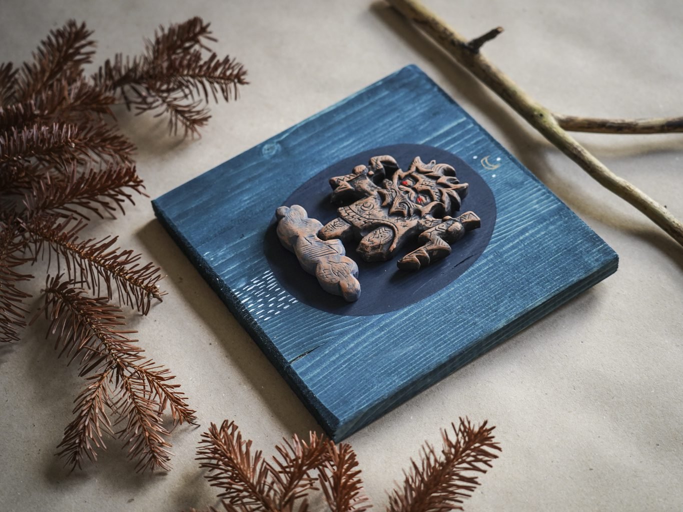 Šių paveikslėlių serija sukurta naudojant autorines rankų darbo formeles. Dėl kūrimo proceso, kiekvienas paveikslėlis savitas ir šiek tiek skirtingas. Keramikos detalė priklijuota ant padekoruotos spygliuočio lentelės.