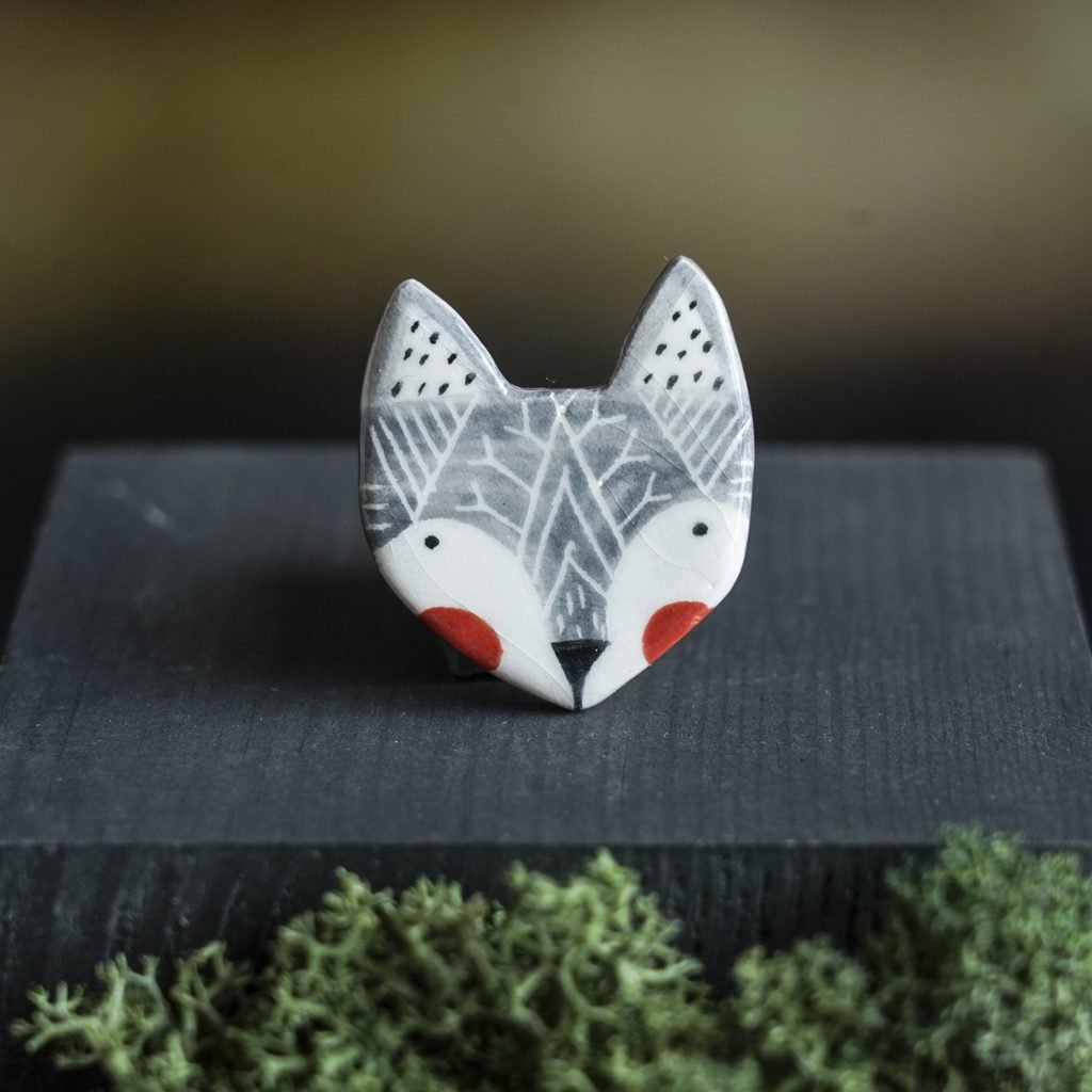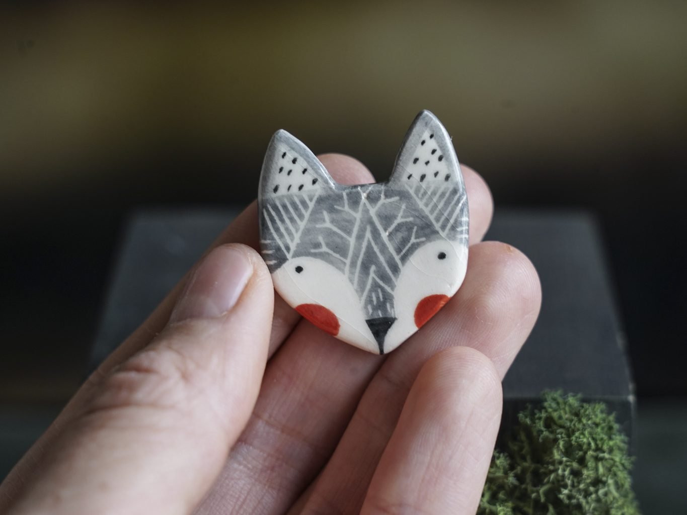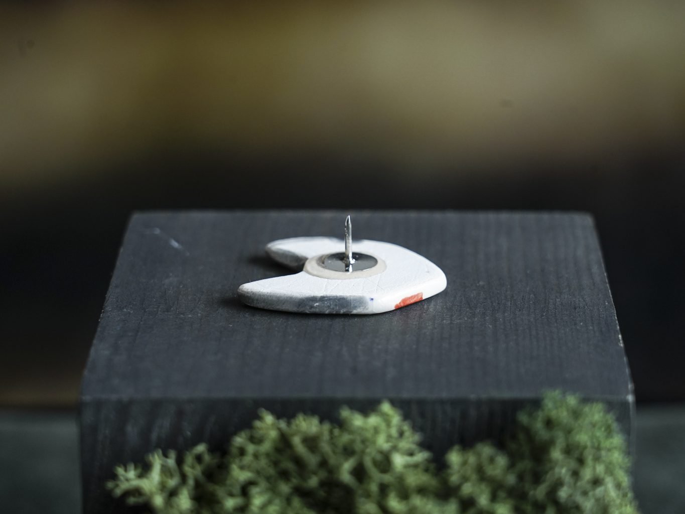 Ceramic parts are made from earthenware clay, fired at approx 1000 C, then hand-painted, glazed bright and fired again. Metal part of the pin is made from stainless steel.