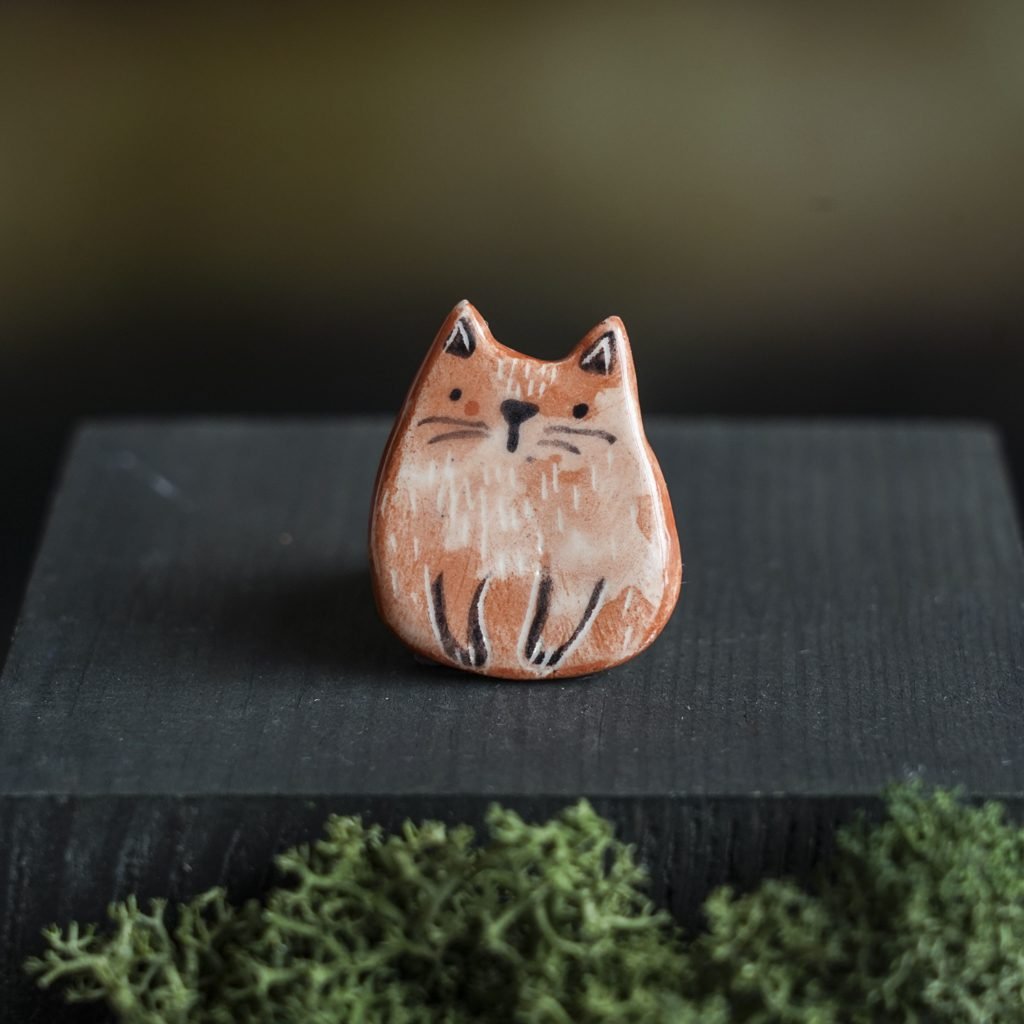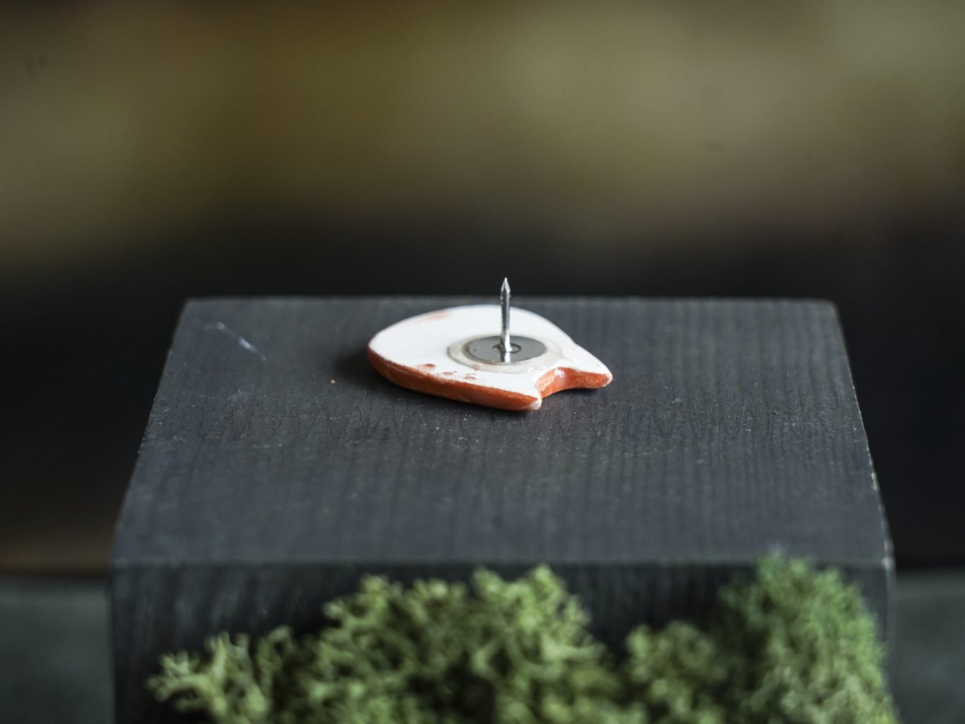 Ceramic parts are made from earthenware clay, fired at approx 1000 C, then hand-painted, glazed bright and fired again. Metal part of the pin is made from stainless steel.