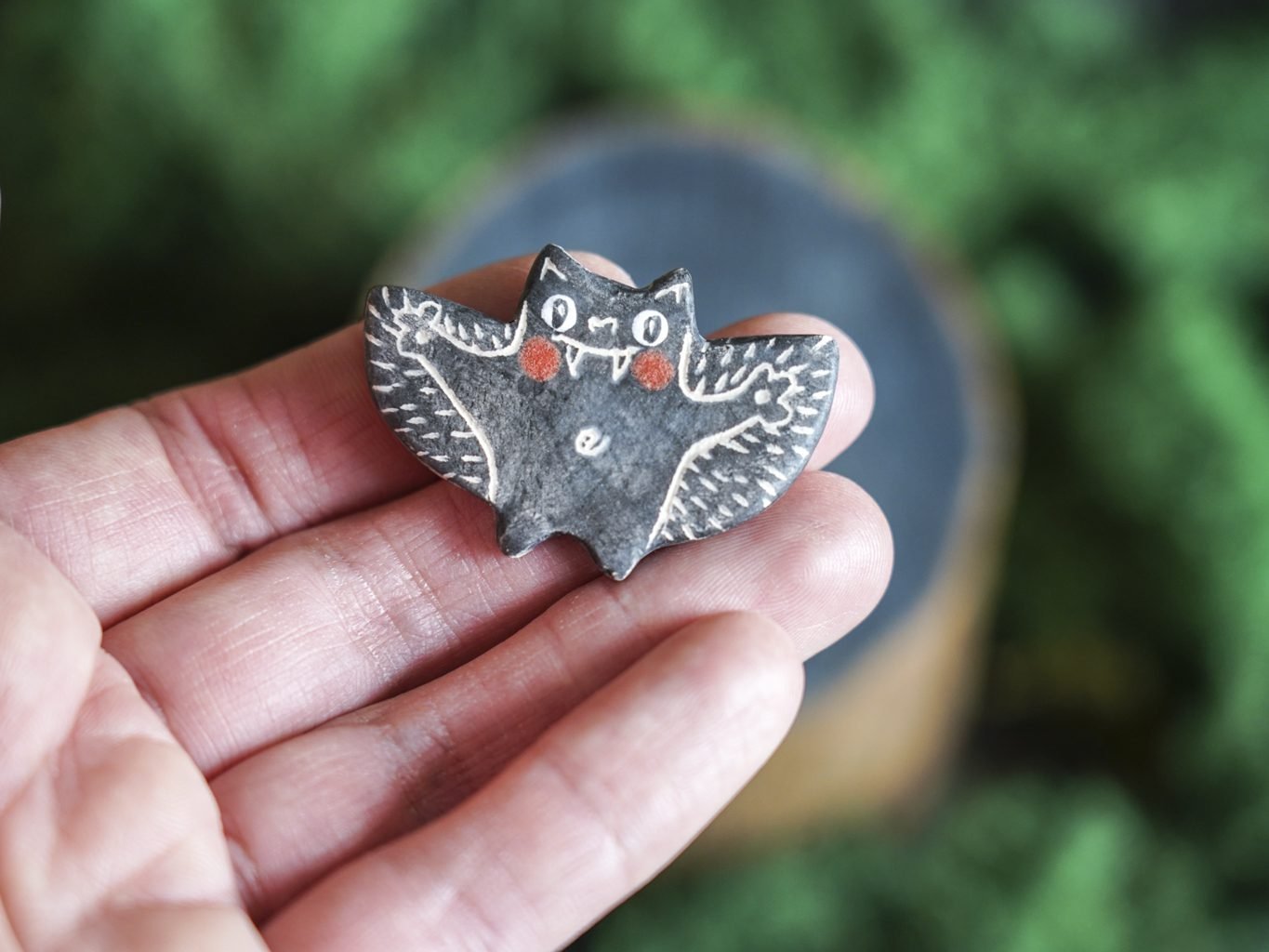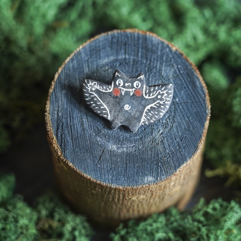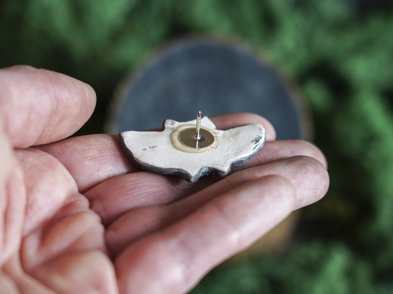 Papuošalai pagaminti iš keramikos. Iš molio nulipdytos formos išdegamos 1000 laipsnių temperatūroje, tada išpaišomos rankomis, padengiamos bespalve glazūra ir išdegamos antrąkart. Metalinė ženkliuko adatėlė pagaminta iš nerūdijančio plieno, kitoje pusėje užspaudžiama tvirta kietos gumos detale.