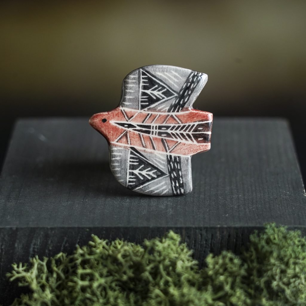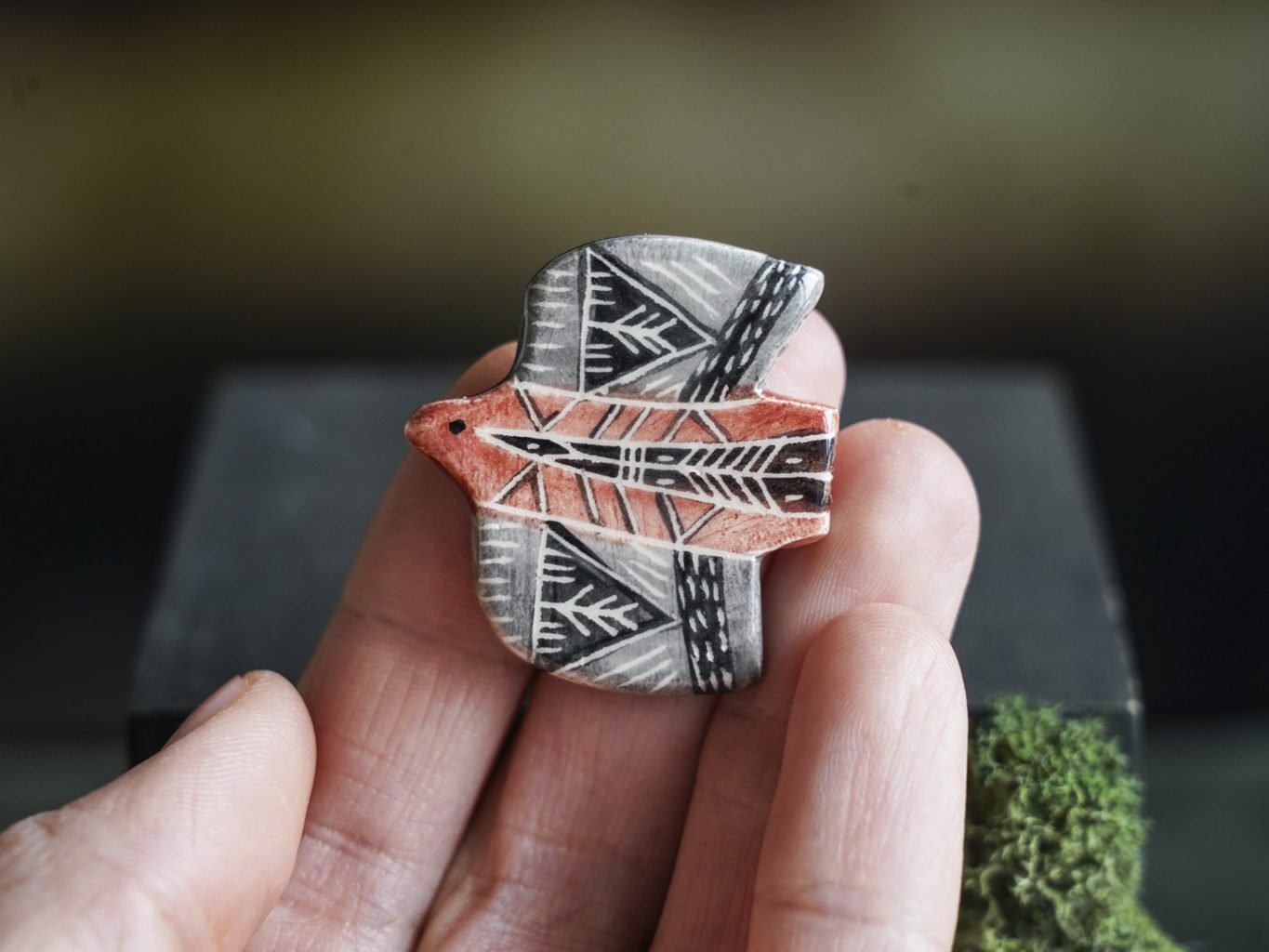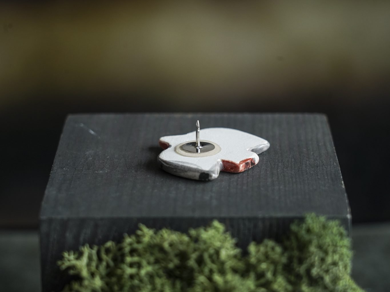 Papuošalai pagaminti iš keramikos. Iš balto molio nulipdytos formos išdegamos 1000 laipsnių temperatūroje, tada išpaišomos rankomis, padengiamos bespalve glazūra ir išdegamos antrąkart. Metalinė ženkliuko adatėlė pagaminta iš nerūdijančio plieno, kitoje pusėje užspaudžiama tvirta kietos gumos detale.