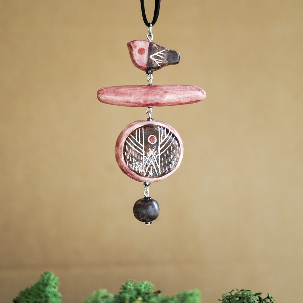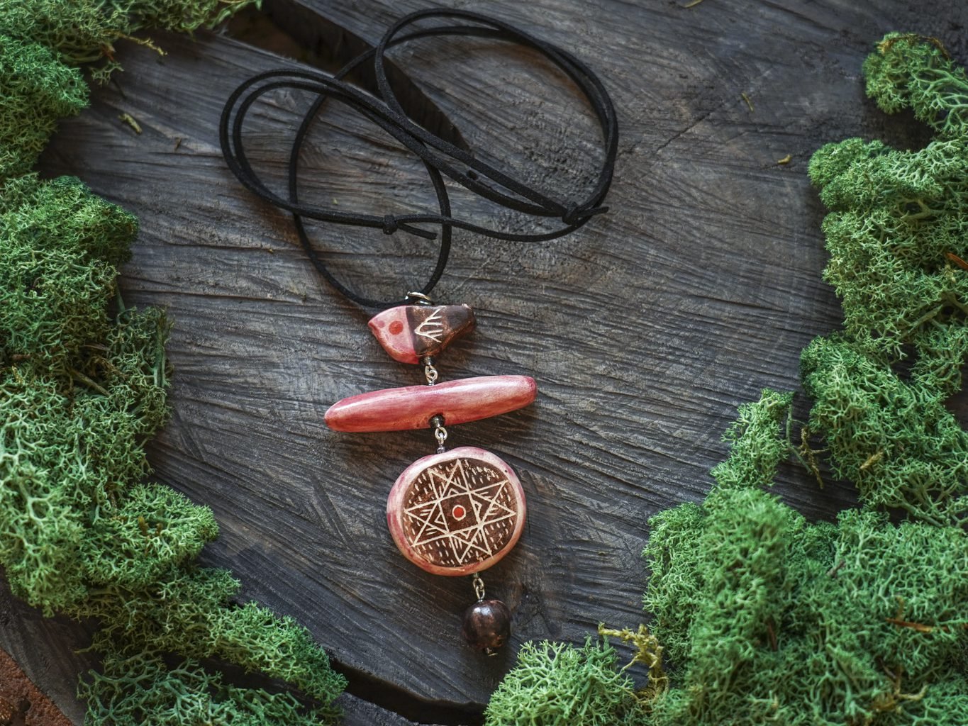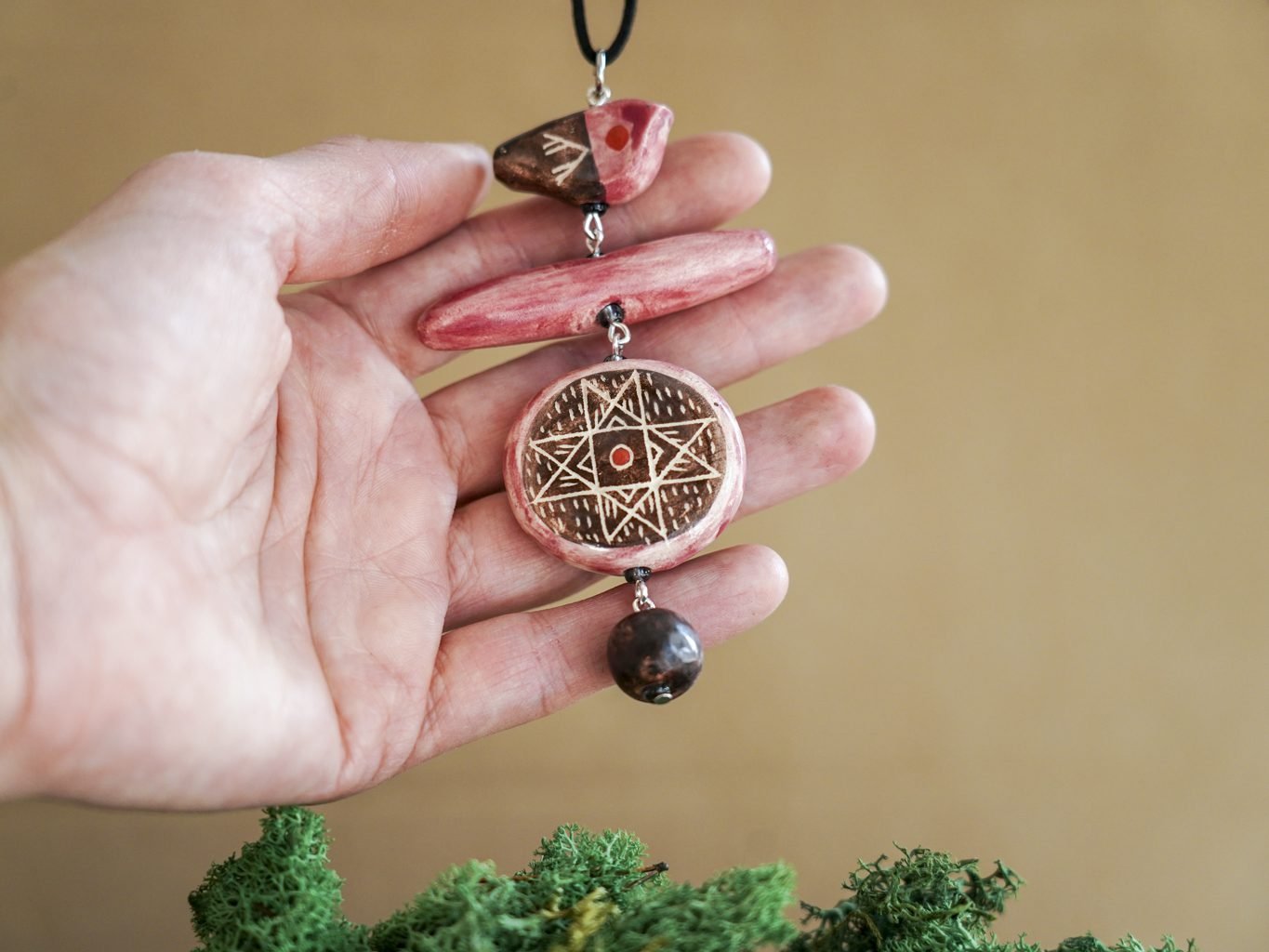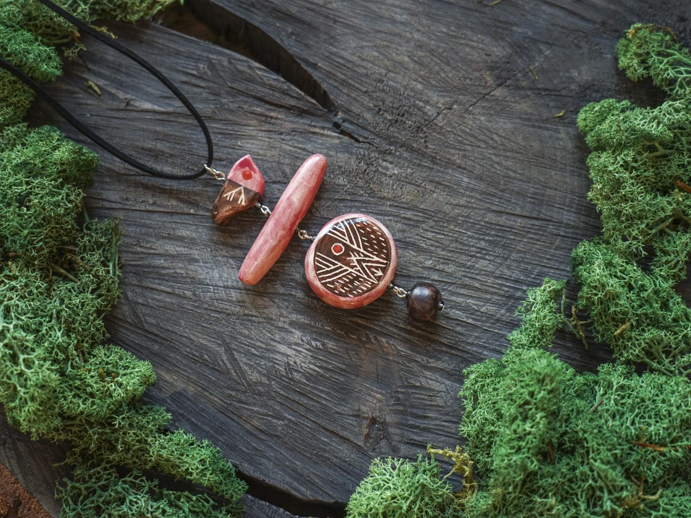 Papuošalai pagaminti iš keramikos. Iš balto molio nulipdytos formos išdegamos 1000 laipsnių temperatūroje, tada išpaišomos rankomis, padengiamos bespalve glazūra ir išdegamos antrąkart.
