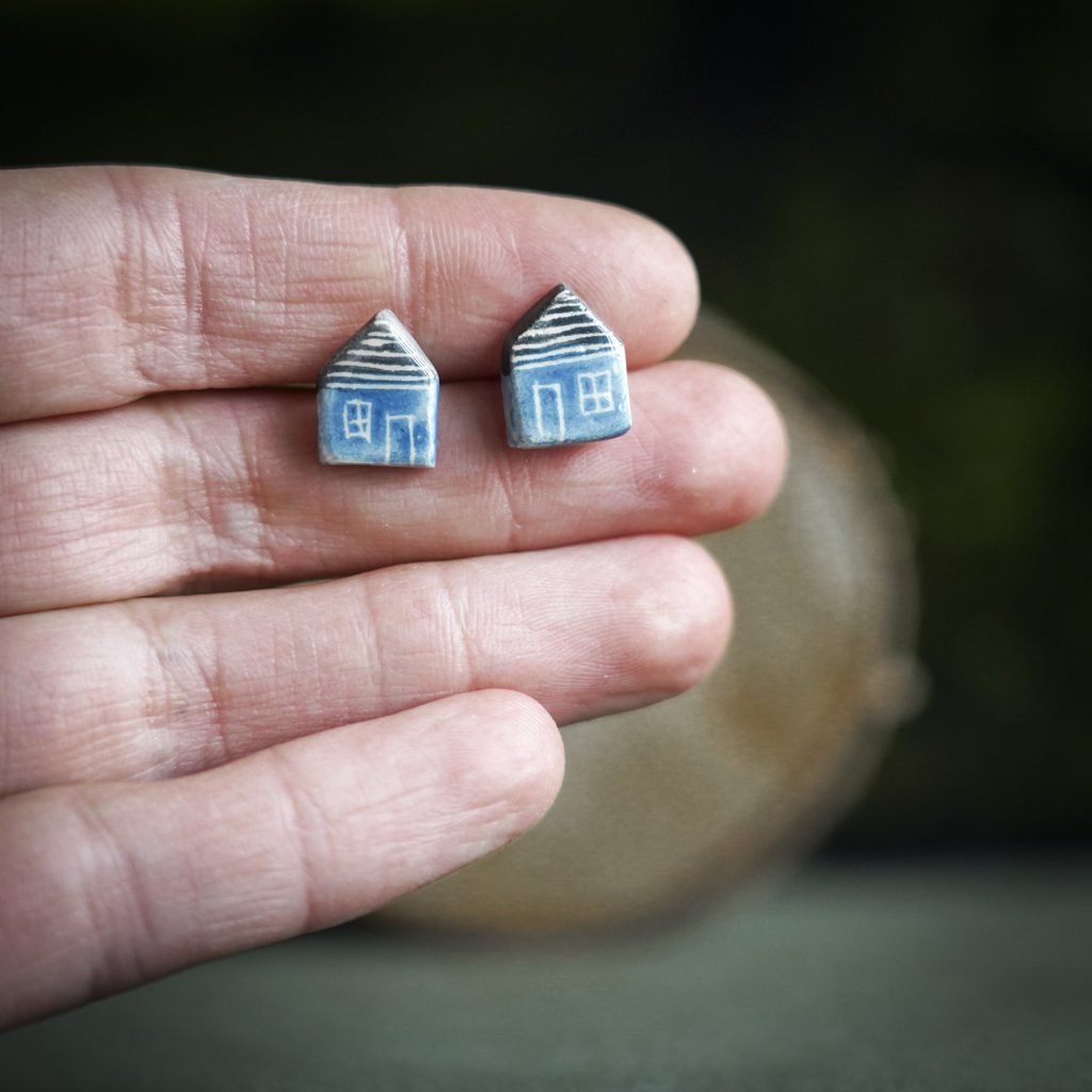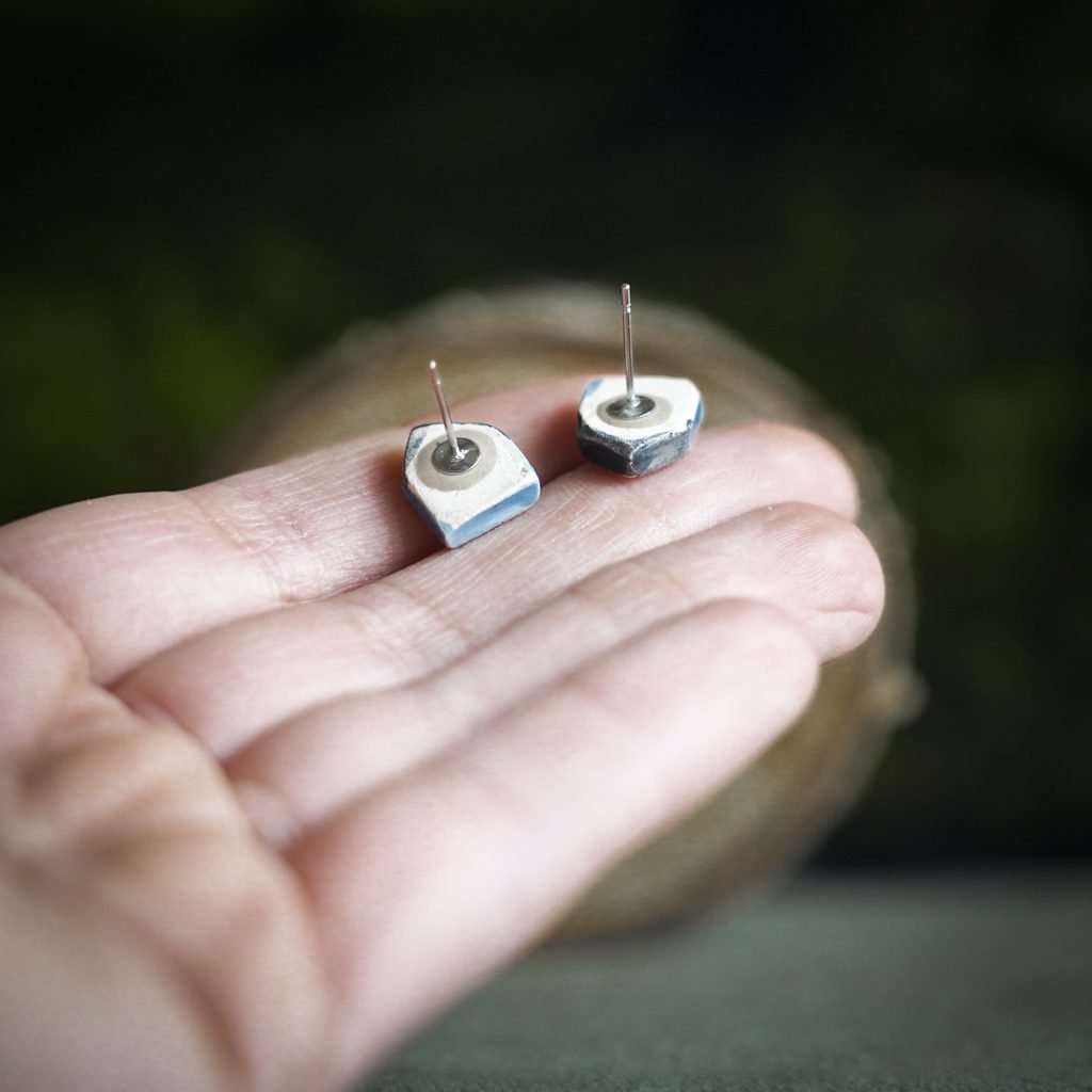 Papuošalai pagaminti iš keramikos. Iš balto molio nulipdytos formos išdegamos 1000 laipsnių temperatūroje, tada išpaišomos rankomis, padengiamos bespalve glazūra ir išdegamos antrąkart. Auskarų adatėlės pagamintos iš nerūdijančio plieno.