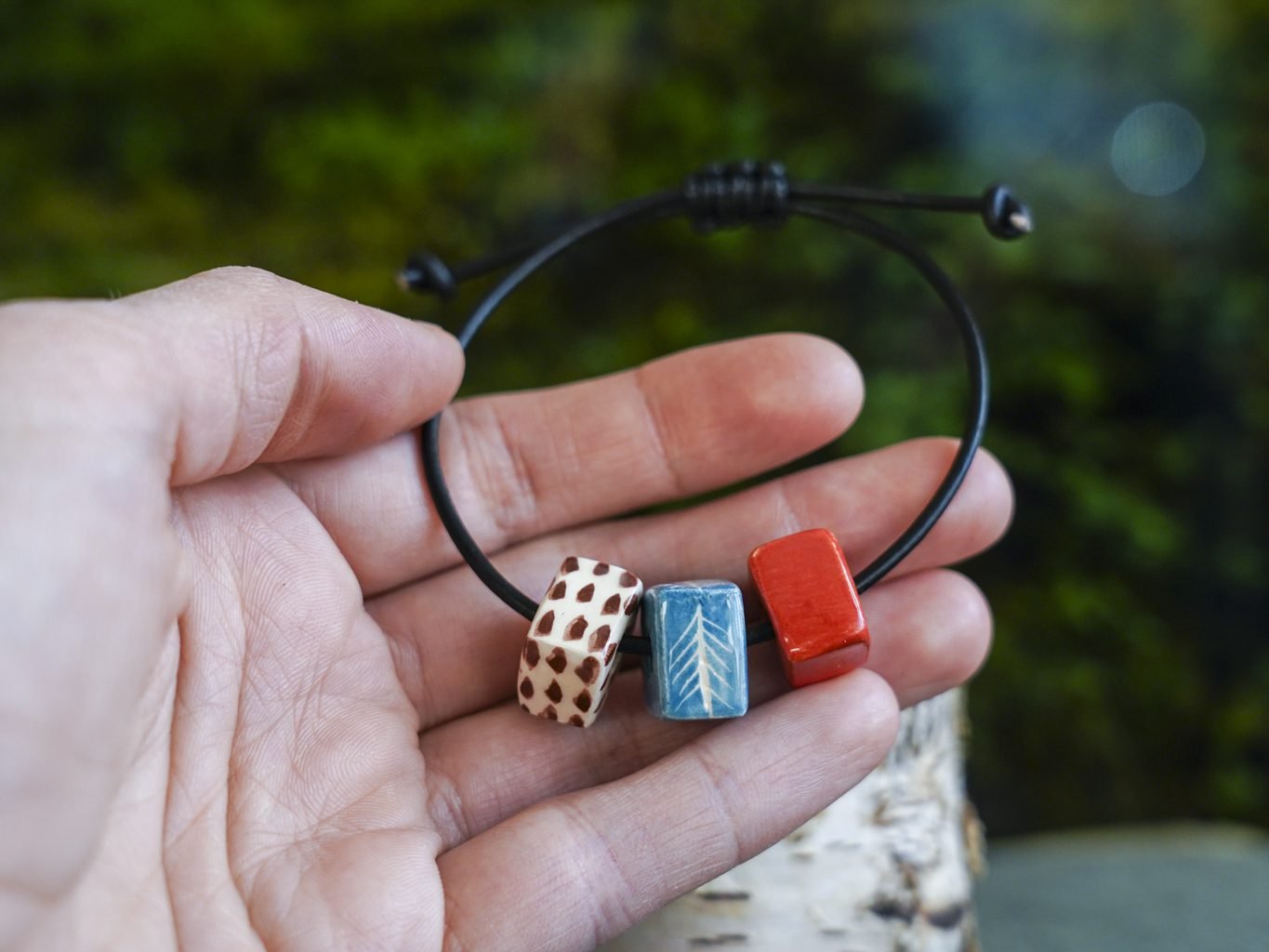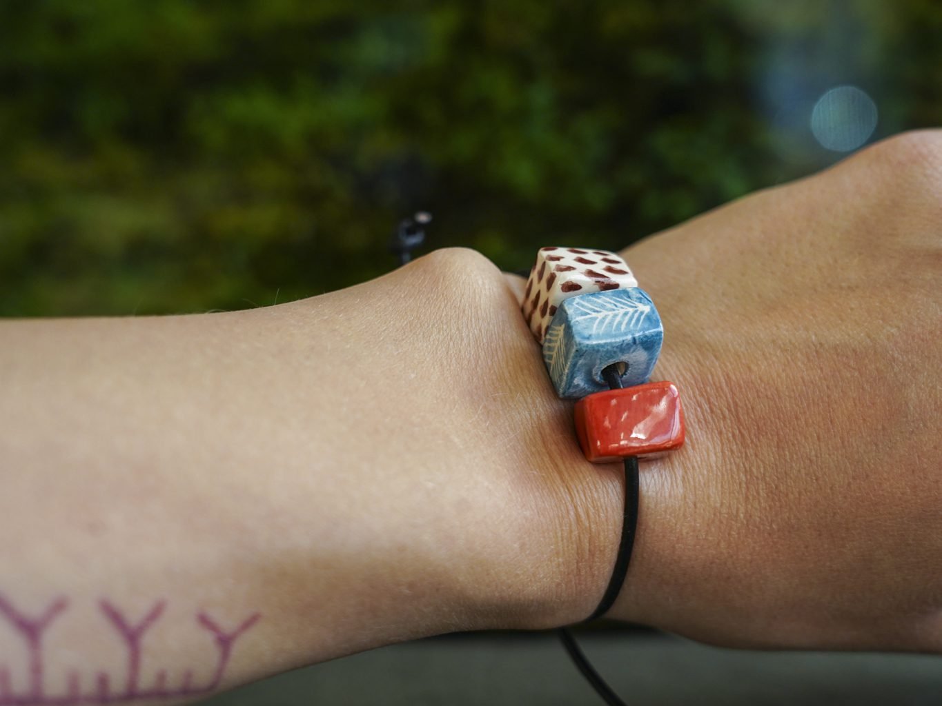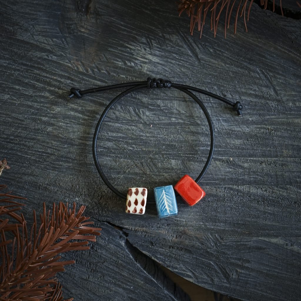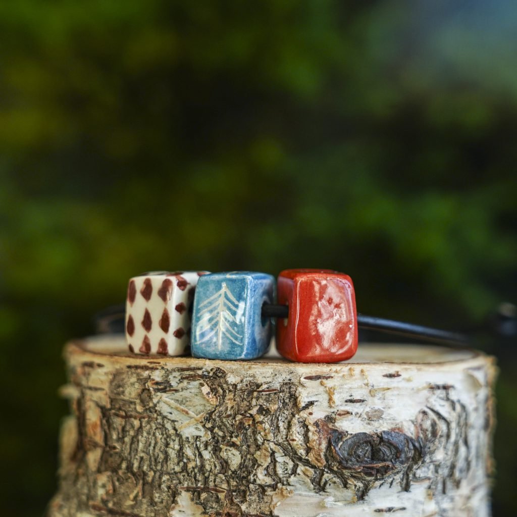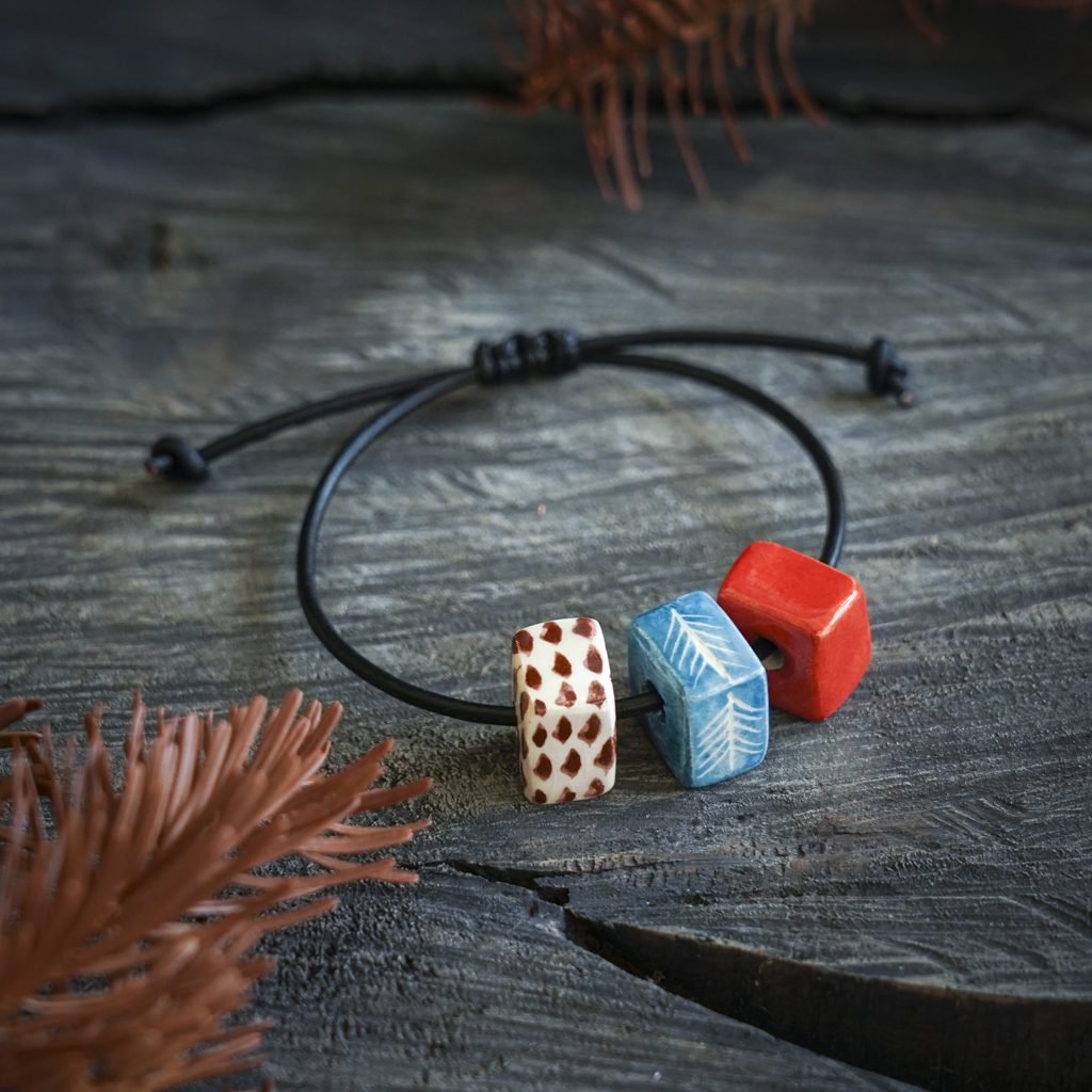Papuošalai pagaminti iš keramikos. Iš balto molio nulipdytos formos išdegamos 1000 laipsnių temperatūroje, tada išpaišomos rankomis, padengiamos bespalve glazūra ir išdegamos antrąkart.