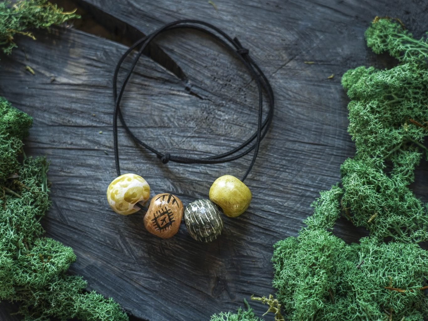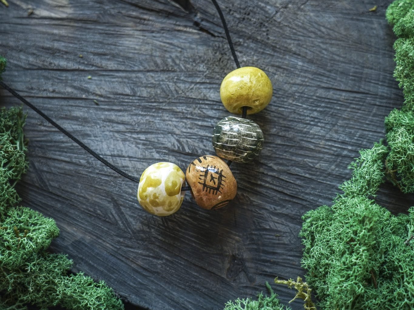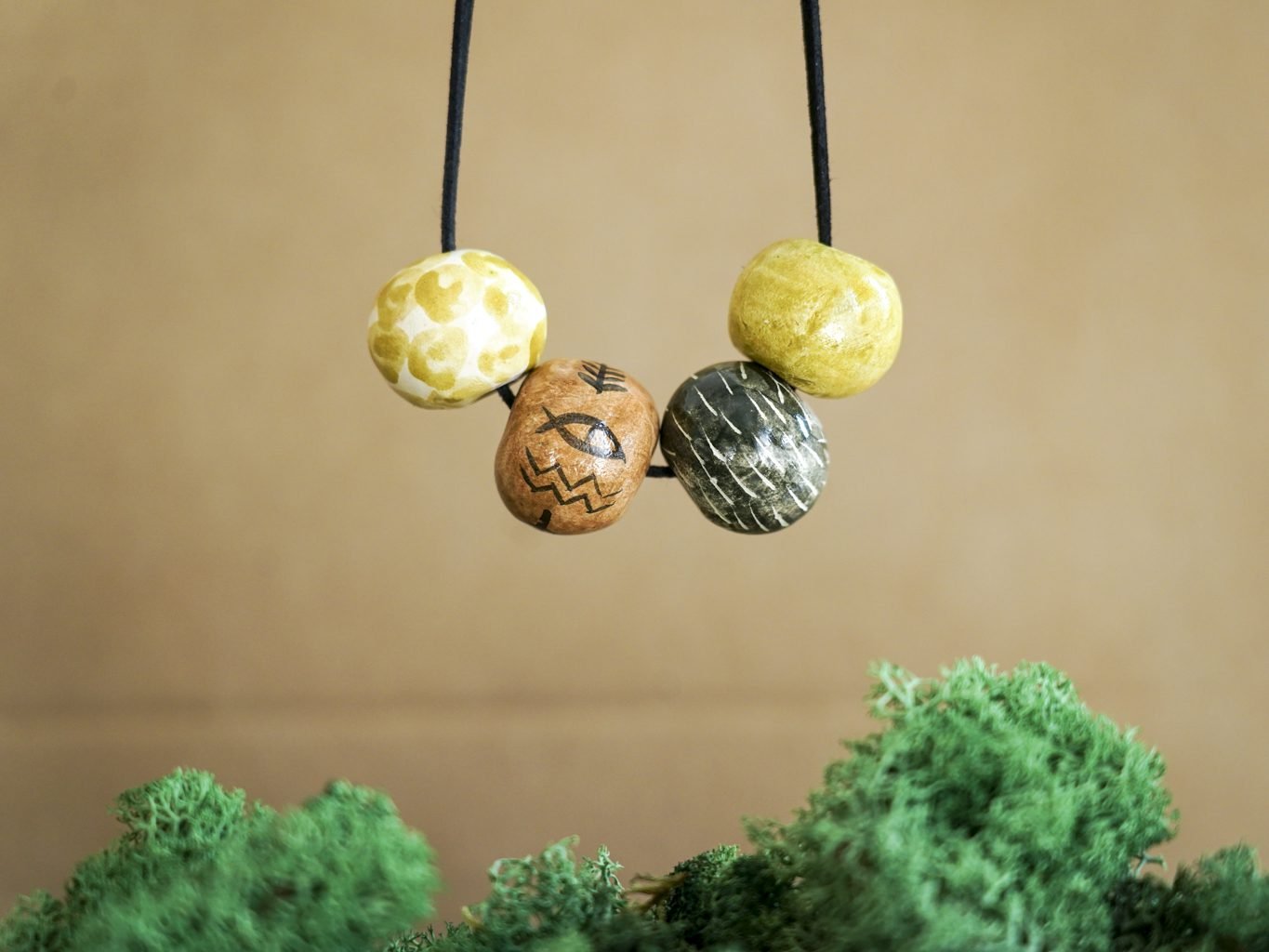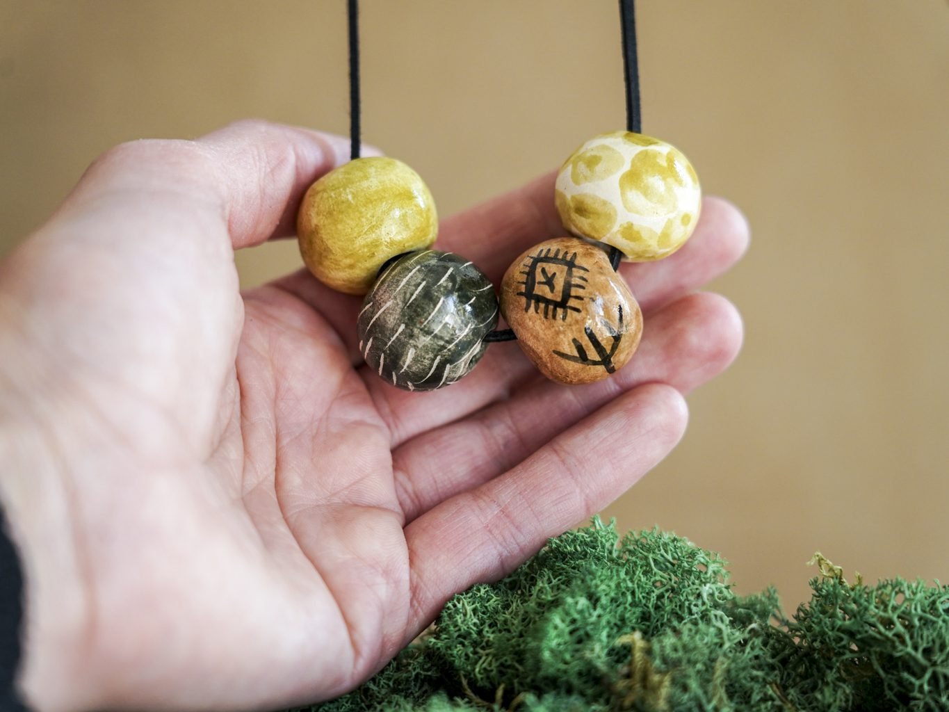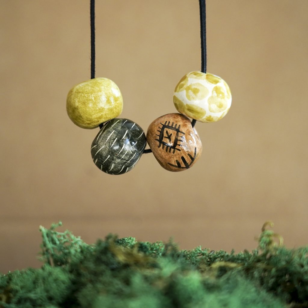 Papuošalai pagaminti iš keramikos. Iš balto molio nulipdytos formos išdegamos 1000 laipsnių temperatūroje, tada išpaišomos rankomis, padengiamos bespalve glazūra ir išdegamos antrąkart.