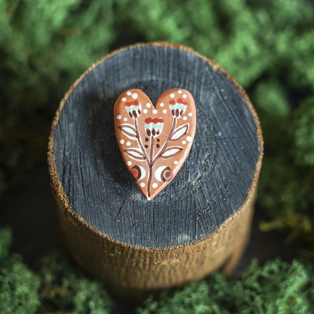 Papuošalai pagaminti iš keramikos. Iš molio nulipdytos formos išdegamos 1000 laipsnių temperatūroje, tada išpaišomos rankomis, padengiamos bespalve glazūra ir išdegamos antrąkart. Metalinė ženkliuko adatėlė pagaminta iš nerūdijančio plieno, kitoje pusėje užspaudžiama tvirta kietos gumos detale.
