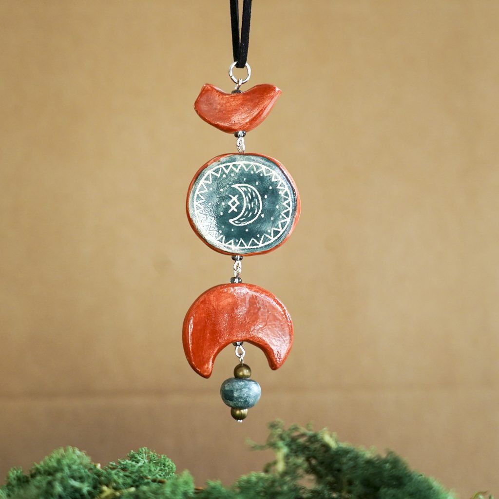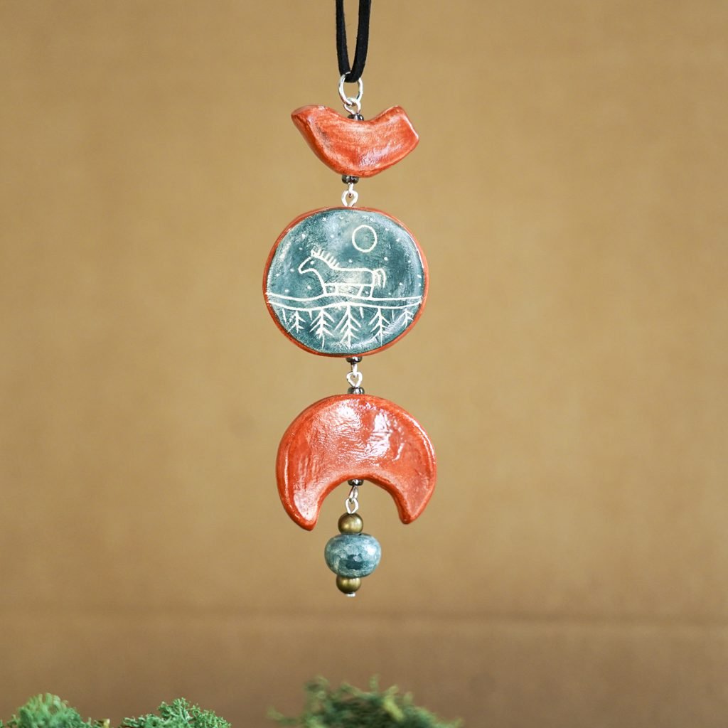 Papuošalai pagaminti iš keramikos. Iš balto molio nulipdytos formos išdegamos 1000 laipsnių temperatūroje, tada išpaišomos rankomis, padengiamos bespalve glazūra ir išdegamos antrąkart.