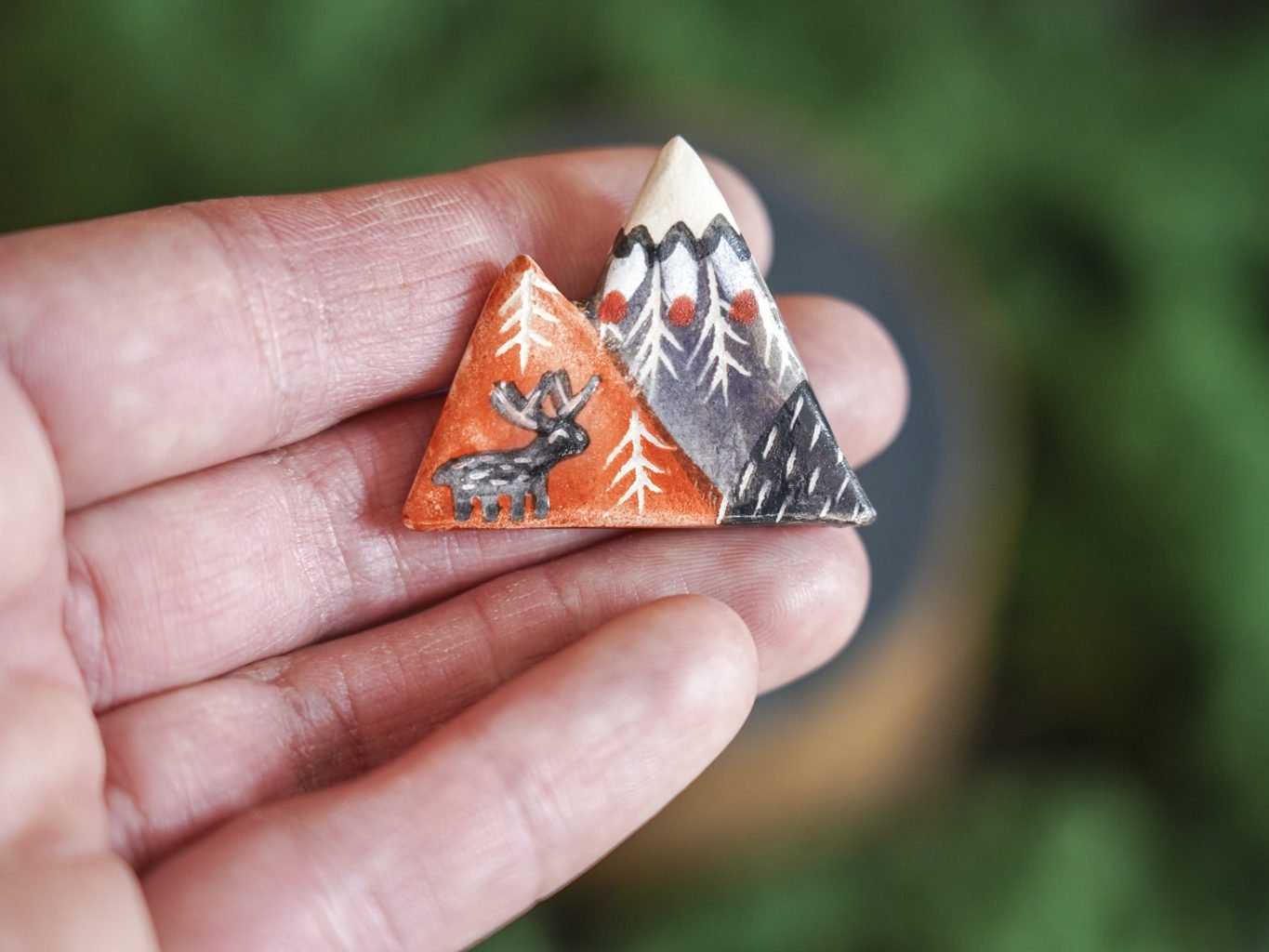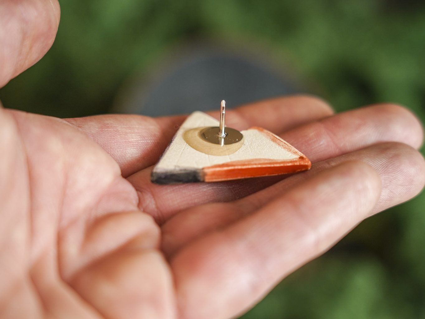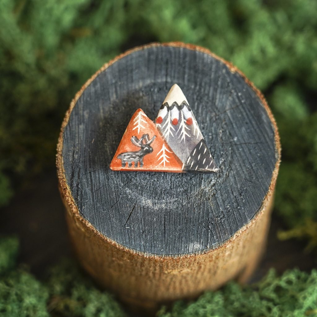 Papuošalai pagaminti iš keramikos. Iš molio nulipdytos formos išdegamos 1000 laipsnių temperatūroje, tada išpaišomos rankomis, padengiamos bespalve glazūra ir išdegamos antrąkart. Metalinė ženkliuko adatėlė pagaminta iš nerūdijančio plieno, kitoje pusėje užspaudžiama tvirta kietos gumos detale.
