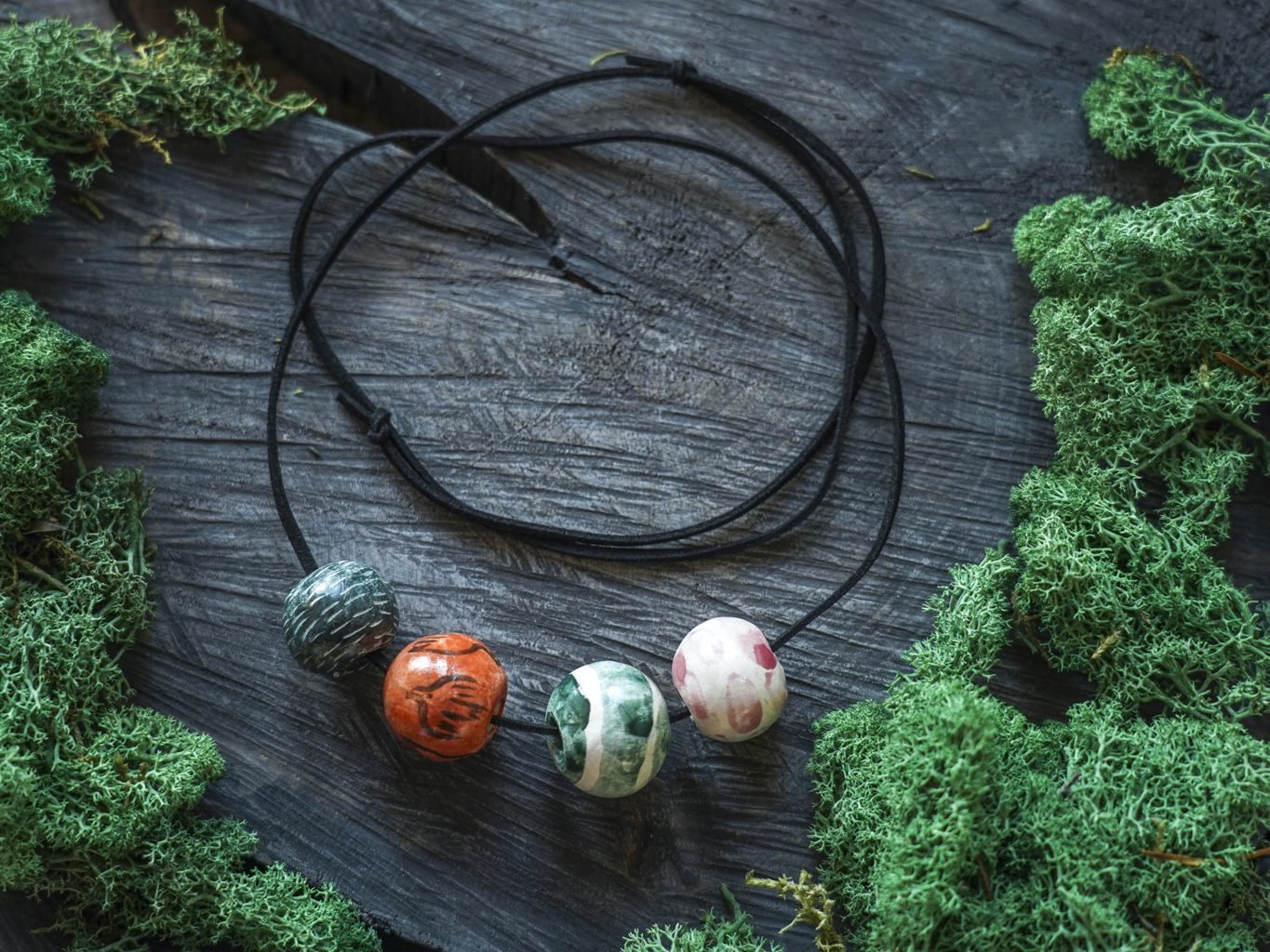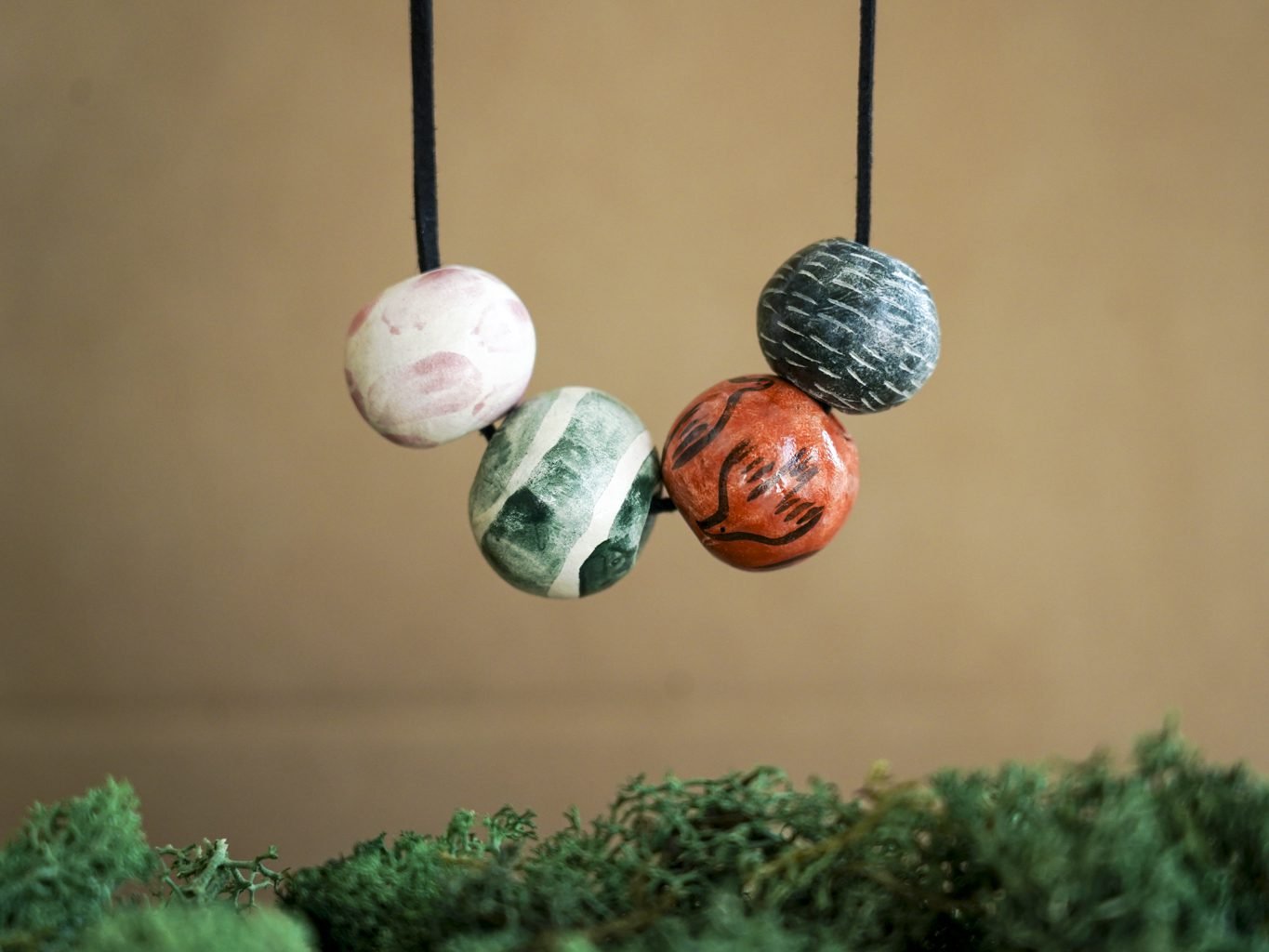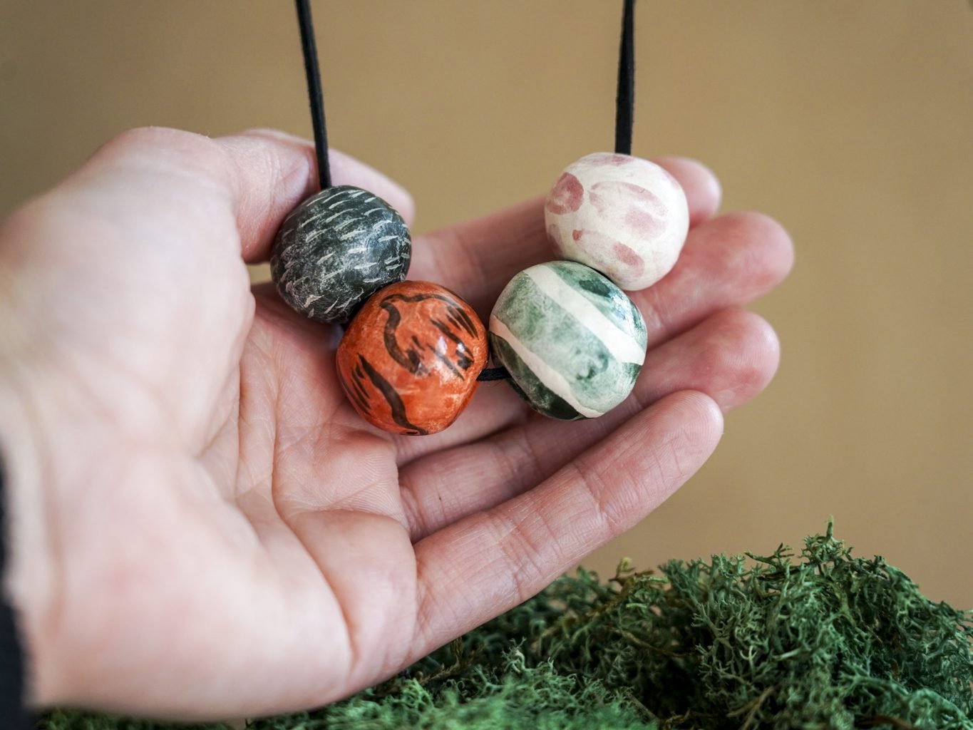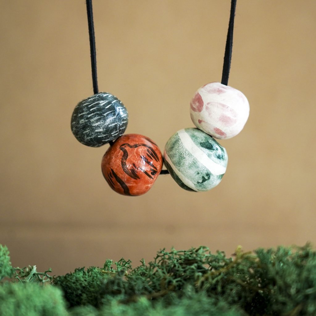 Papuošalai pagaminti iš keramikos. Iš balto molio nulipdytos formos išdegamos 1000 laipsnių temperatūroje, tada išpaišomos rankomis, padengiamos bespalve glazūra ir išdegamos antrąkart.