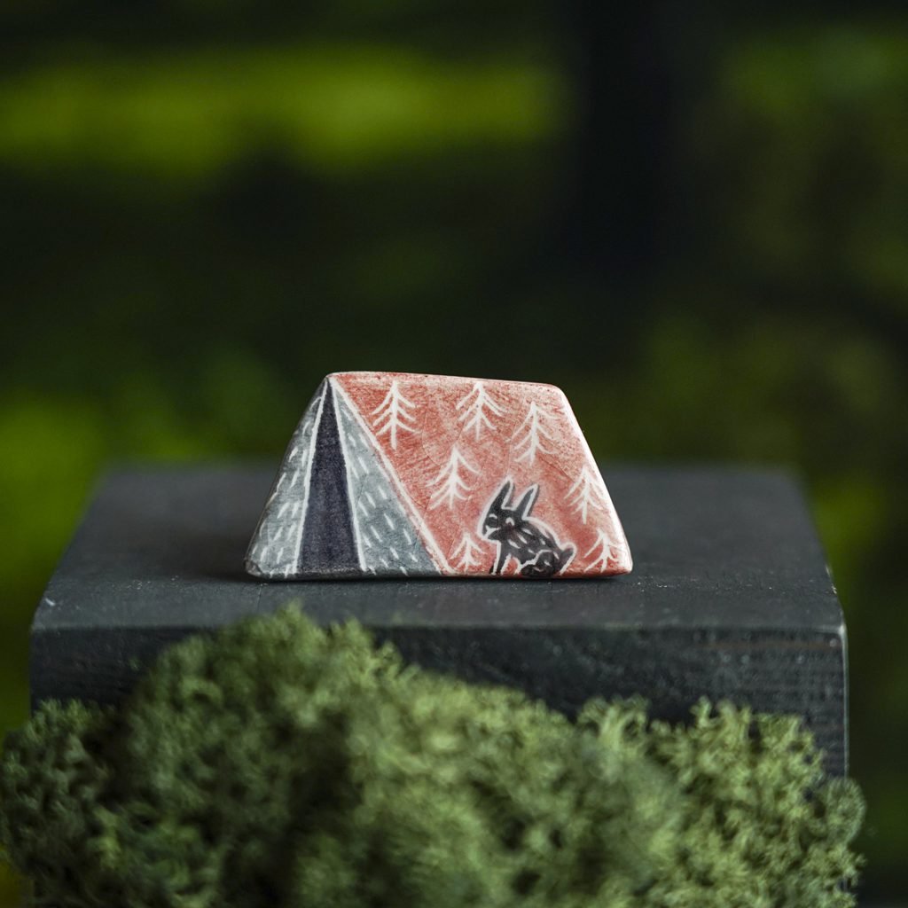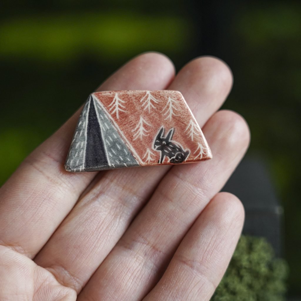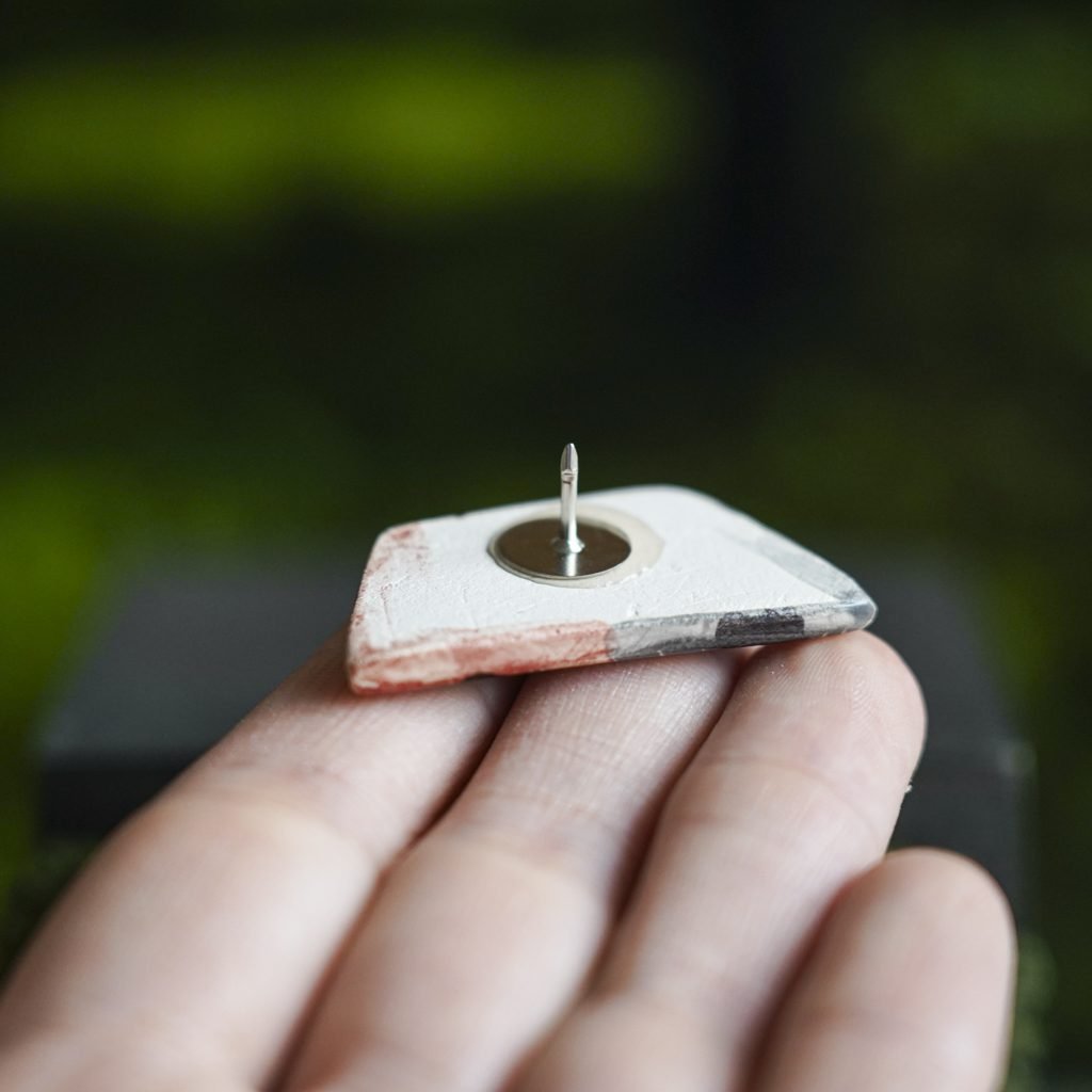 Papuošalai pagaminti iš keramikos. Iš balto molio nulipdytos formos išdegamos 1000 laipsnių temperatūroje, tada išpaišomos rankomis, padengiamos bespalve glazūra ir išdegamos antrąkart. Metalinė ženkliuko adatėlė pagaminta iš nerūdijančio plieno, kitoje pusėje užspaudžiama tvirta kietos gumos detale.