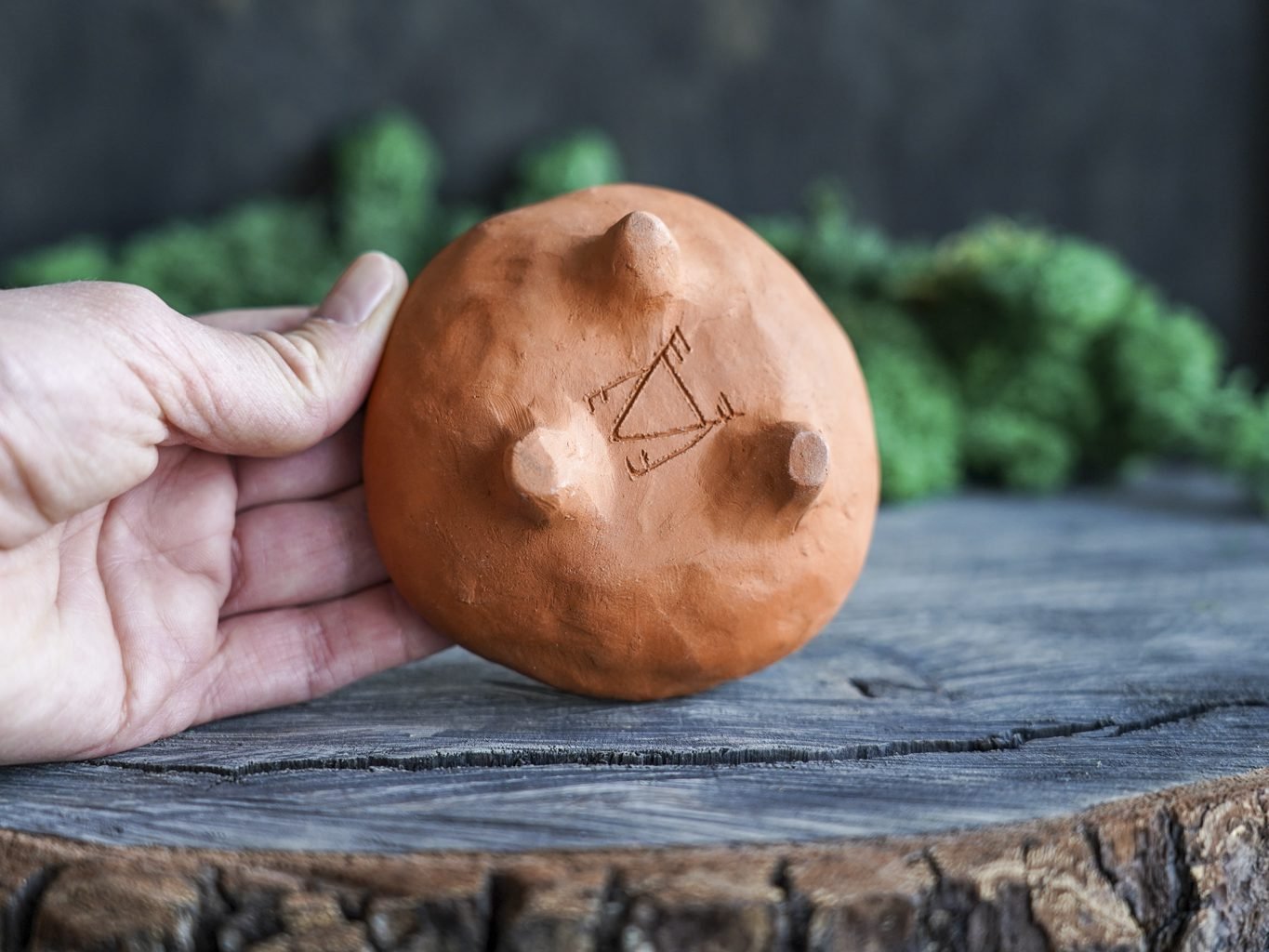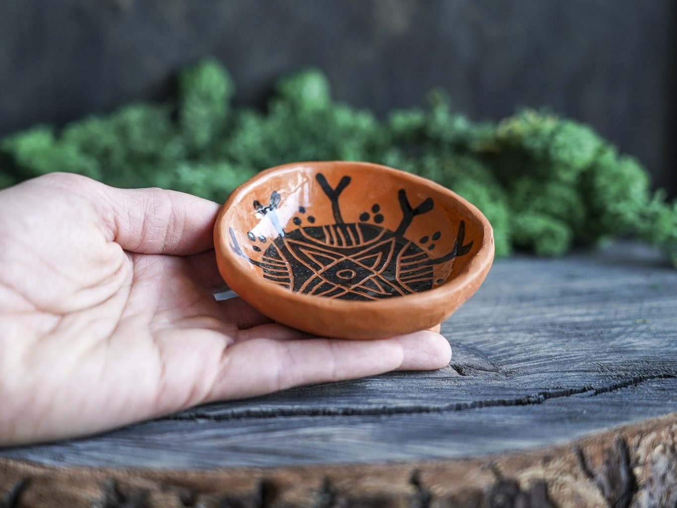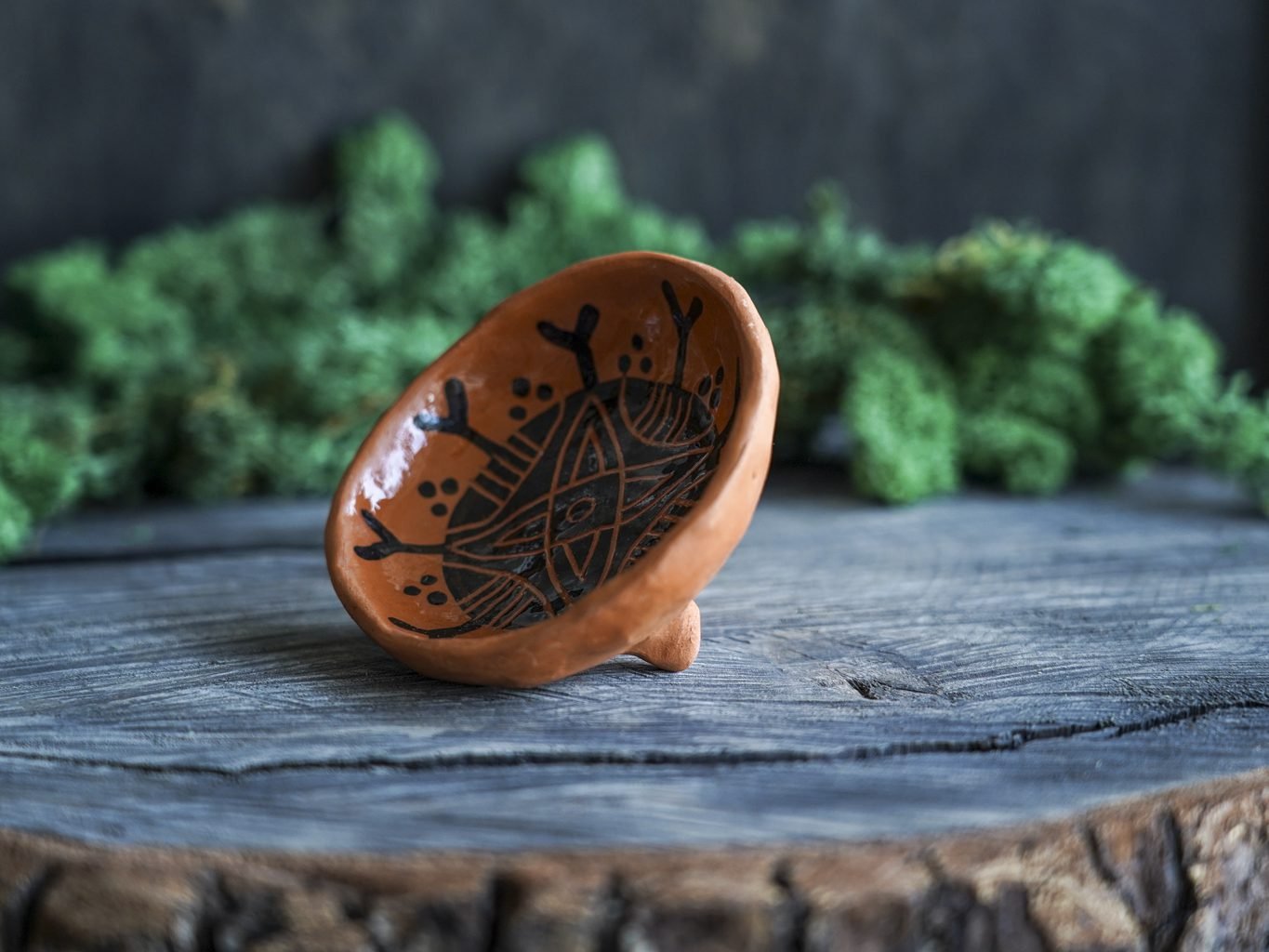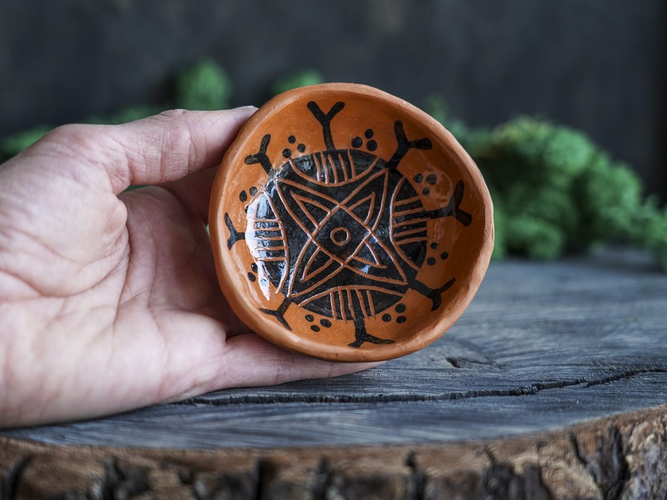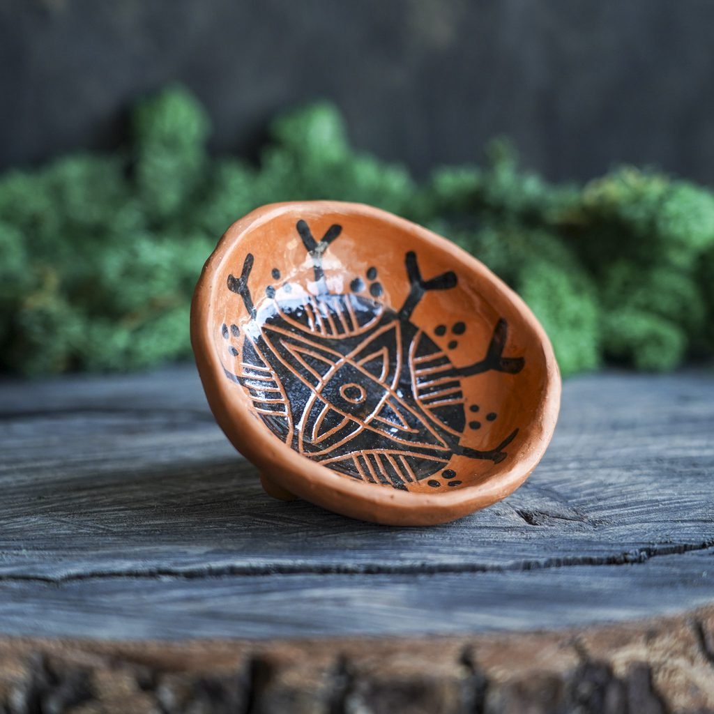 Šis indas lipdytas rankomis iš raudono molio. Tuomet išdegtas pirmąjį kartą keramikos krosnyje, išpieštas poglazūriniais dažais, nuglazūruotas indelio vidus ir antrą kartą išdegtas krosnyje. Dekoravimui naudota juodafigūrės keramikos technika, žinoma nuo seno, kai natūralaus raudono molio fone juodais dažais išpiešiamos figūros ir jos padekoruojamos išraižant piešinius rėžtuku. Indo išorė neglazūruota, natūralaus molio, nerekomenduojama plauti indaplovėje.