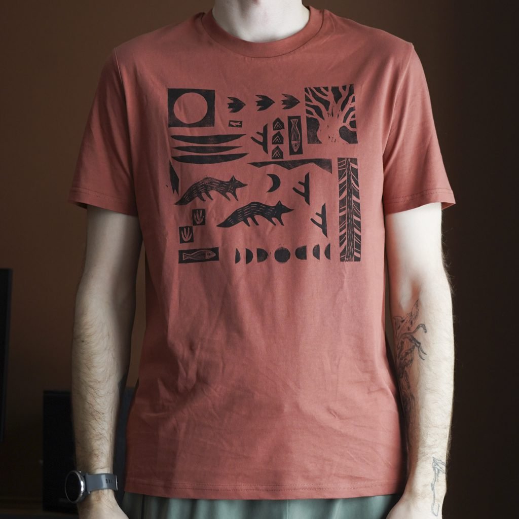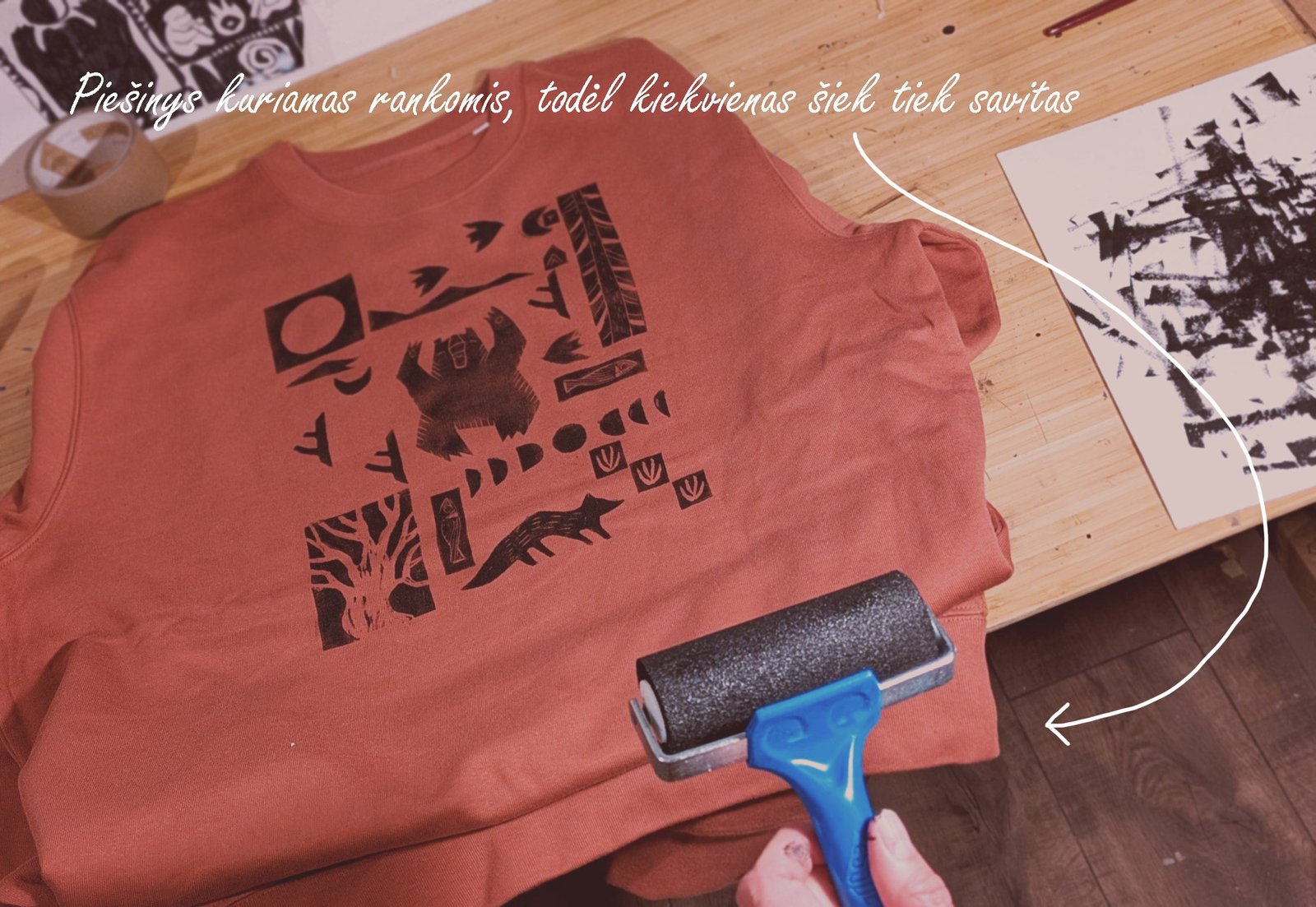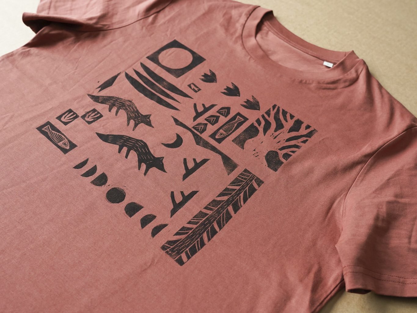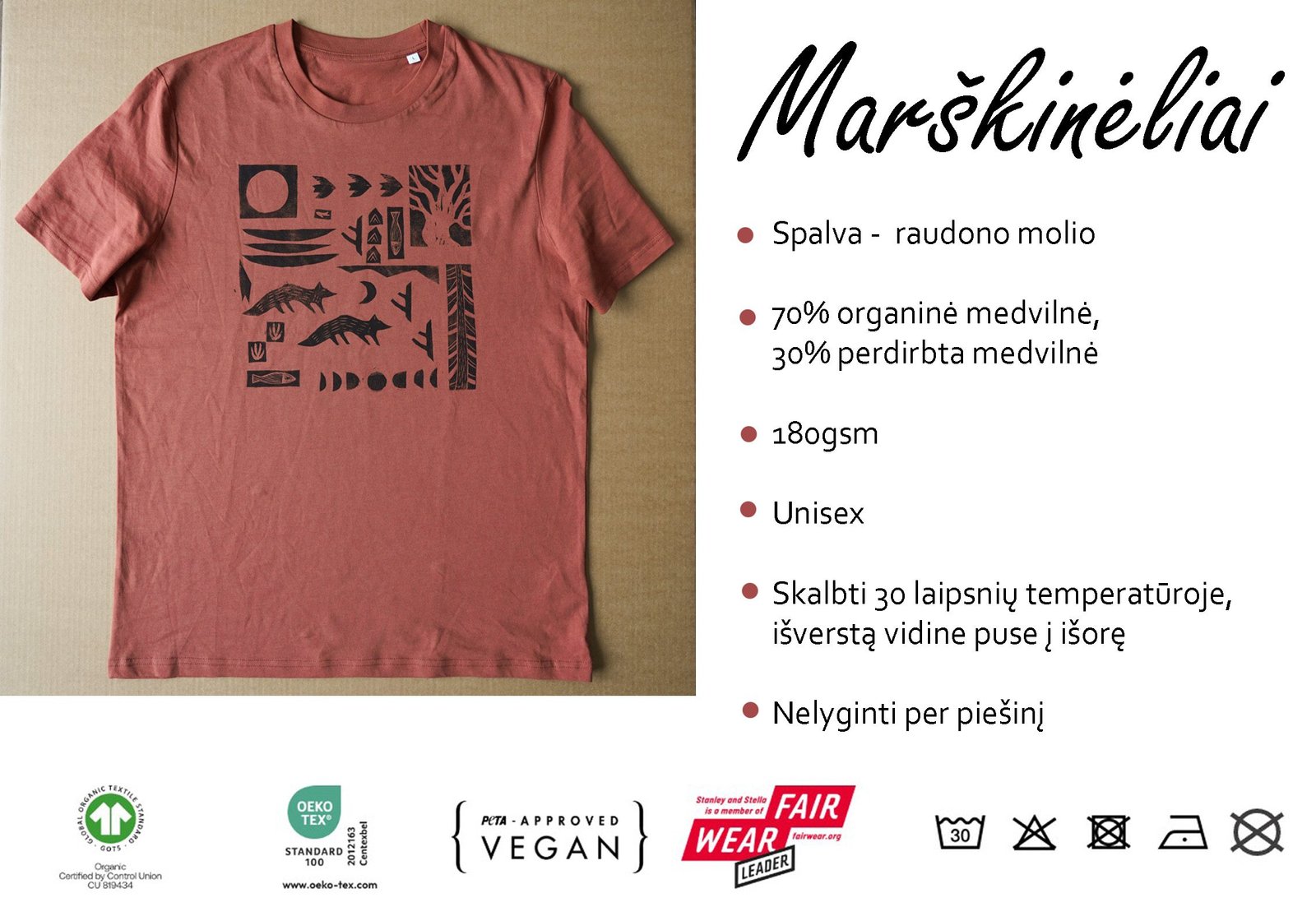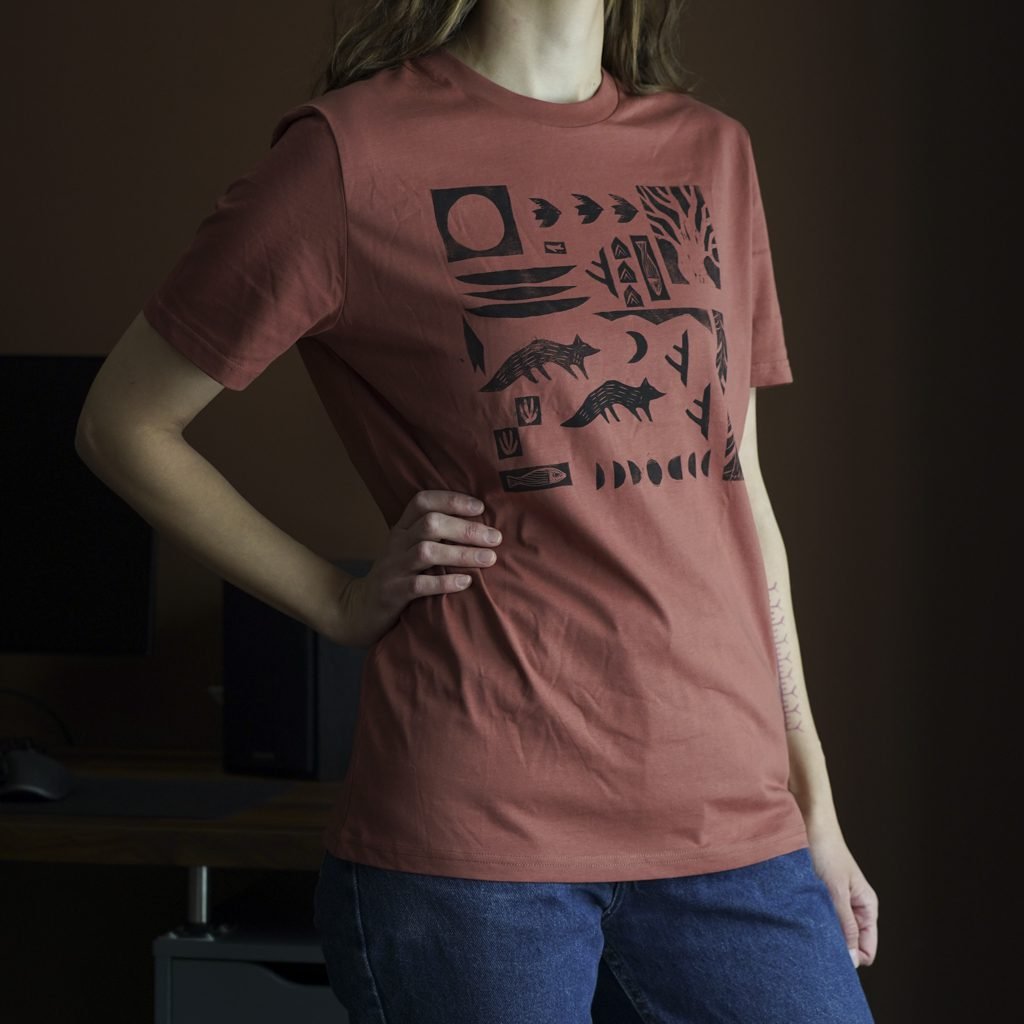 Ši tekstilės dekoro kolekcija gimė iš senos meilės terracotta(raudonojo molio) spalvai ir naujos meilės – lino raižinio spaudai. Marškinėlius dekoruoju savo rankomis sukurtais lino raižinio antspaudais. Piešinys gimsta pamažu kaip mozaika sukurtus žvėrelių ir gamtos motyvų spaudus dėliojant ir komponuojant. Kiekviena formelė atspaudžiama atskirai, todėl kiekvieni marškinėliai visuomet vos kitokie, jaučiamas rankų prisilietimas.