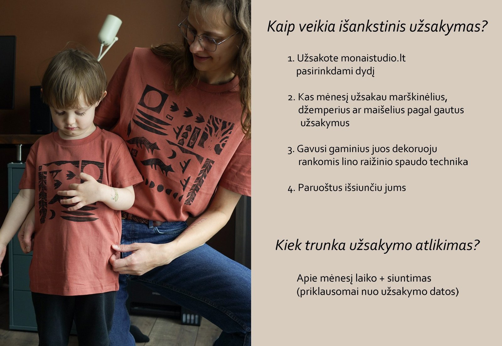 Gaminu tik išankstiniu užsakymu. Užsakymus renku kas mėnesį, mėnesio pirmą savaitę užsakau iš tiekėjo marškinėlius, o jiems atkeliavus dekoruoju ir ruošiu siuntimui.