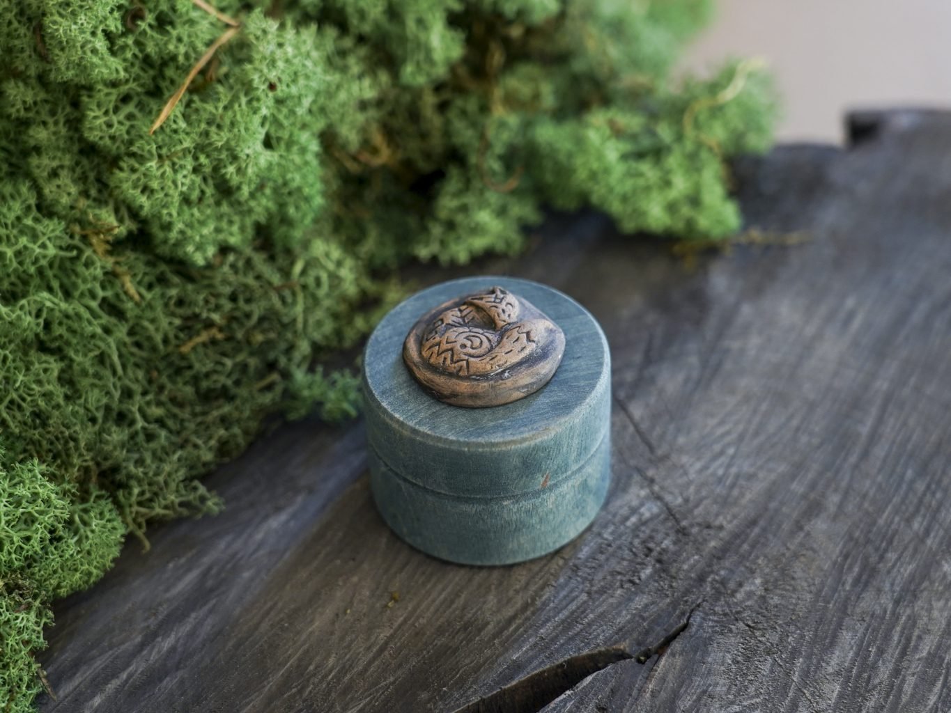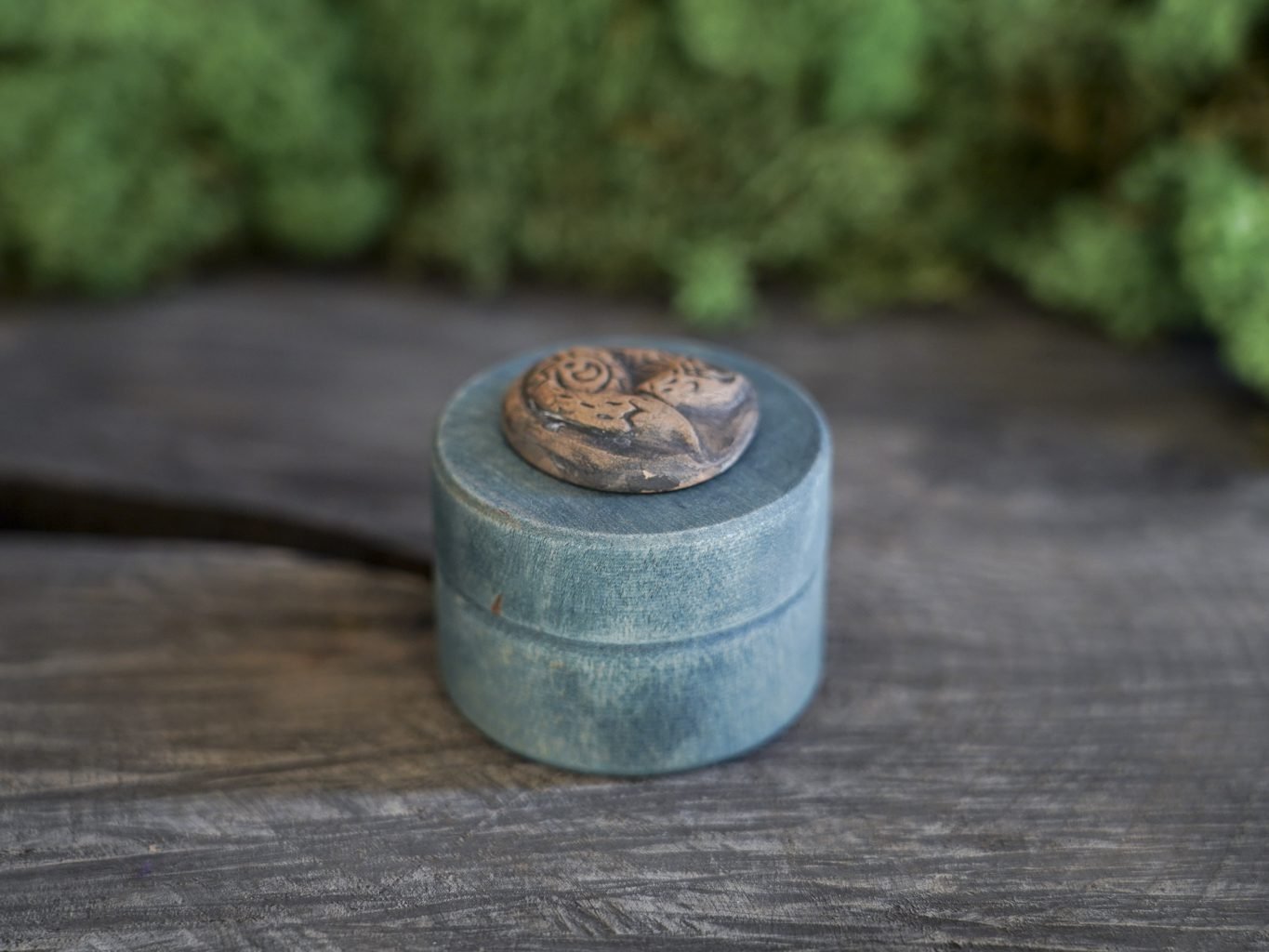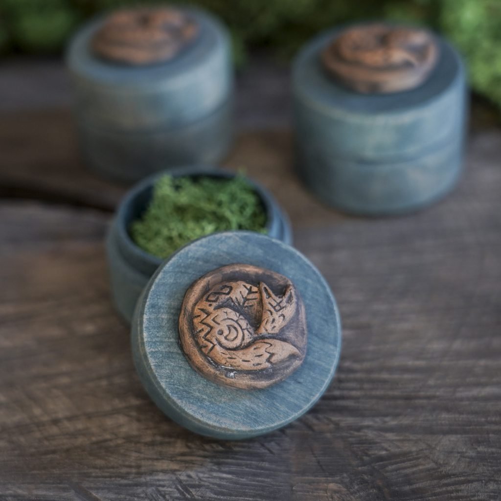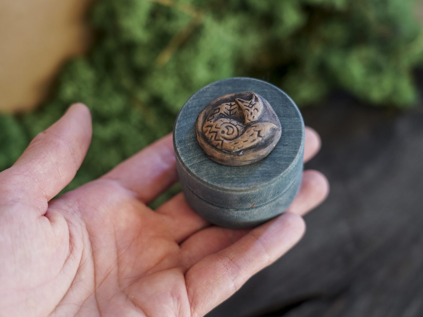 Ši maža dėžutė pagaminta iš medžio, dekoruota mano kurta keramikos detale – reljefine miegančia lape. Dėžutės vidus išklotas žaliomis impregnuotomis samanomis, kurios laikui bėgant nepraranda savo spalvos.
