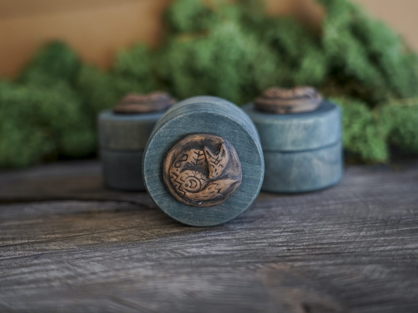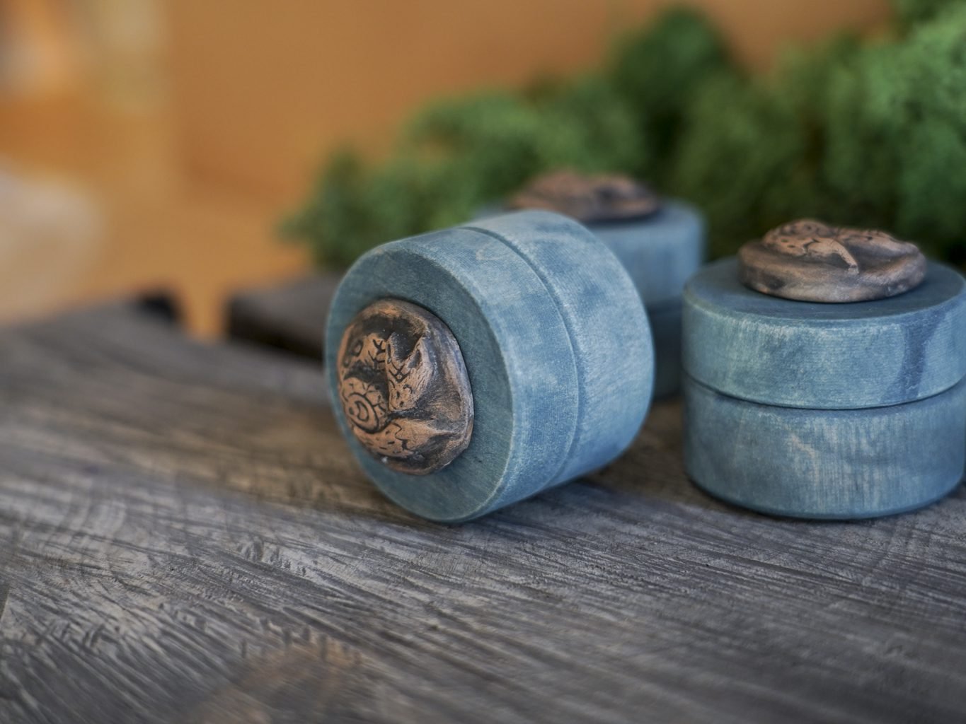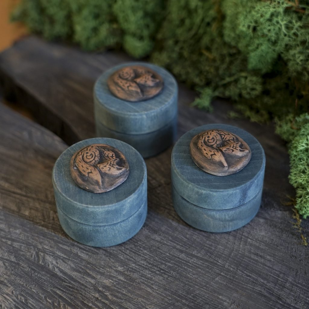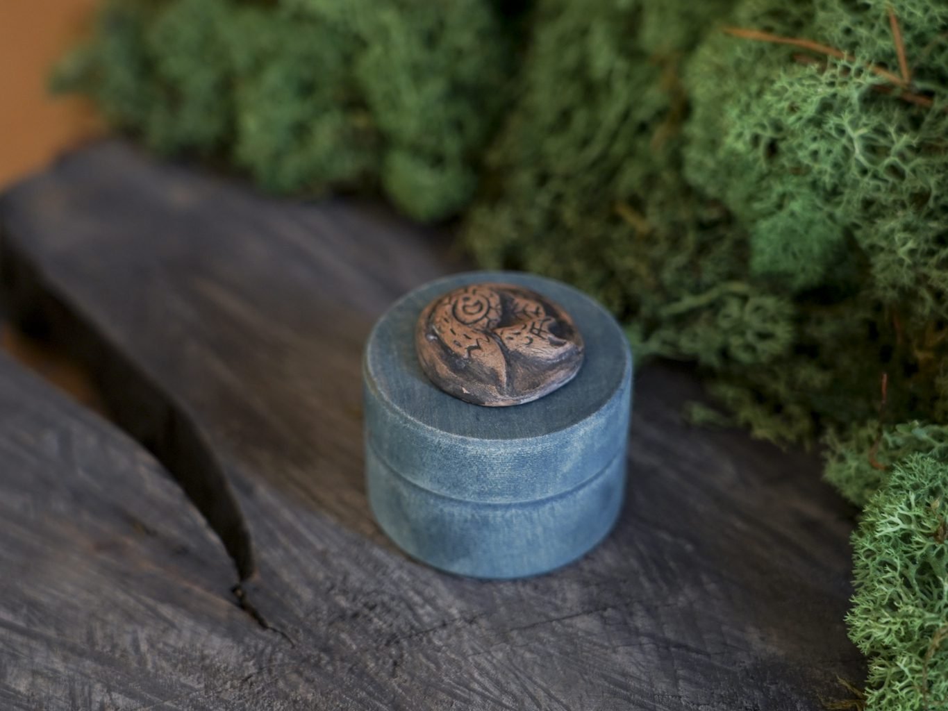 Ši maža dėžutė pagaminta iš medžio, dekoruota mano kurta keramikos detale – reljefine miegančia lape. Dėžutės vidus išklotas žaliomis impregnuotomis samanomis, kurios laikui bėgant nepraranda savo spalvos.