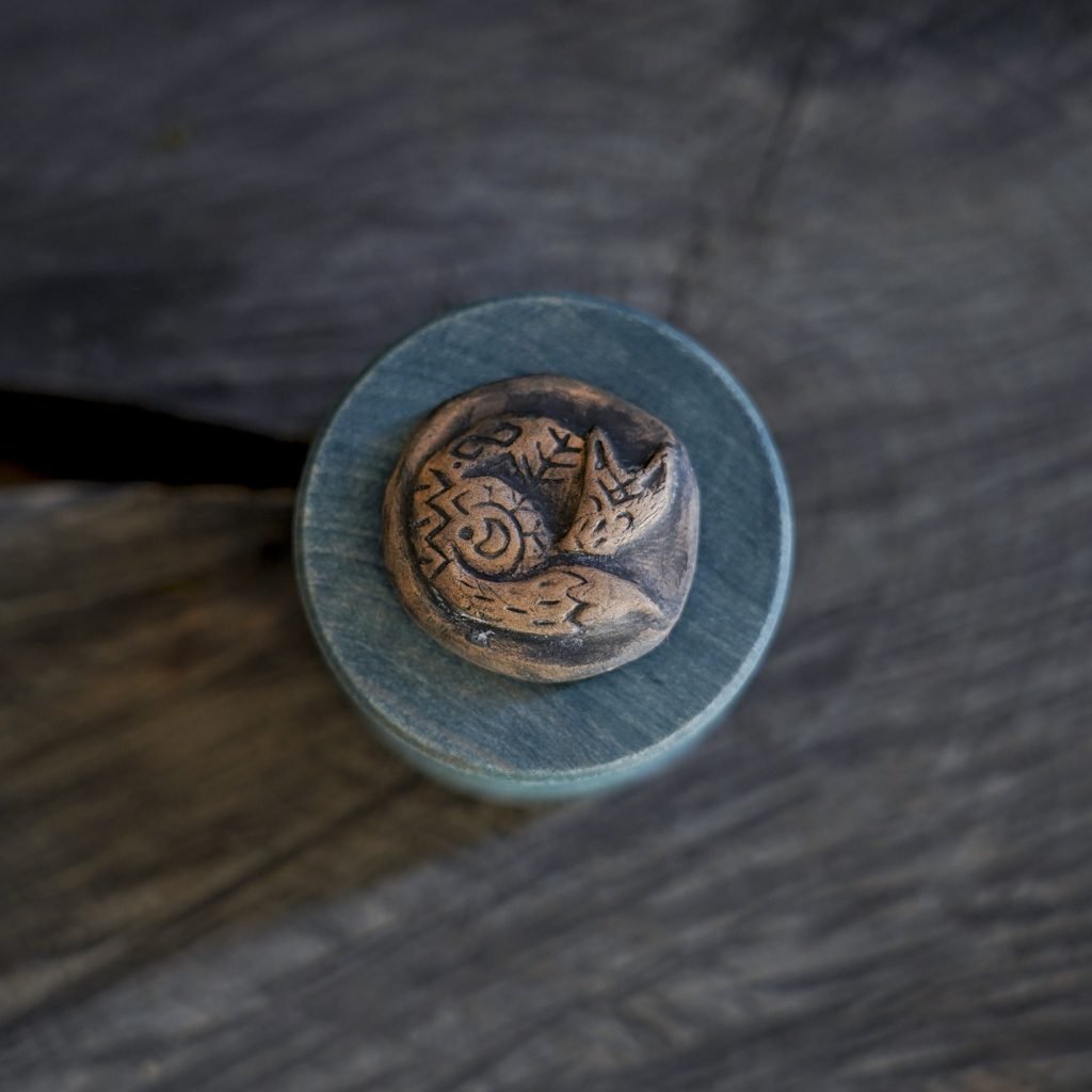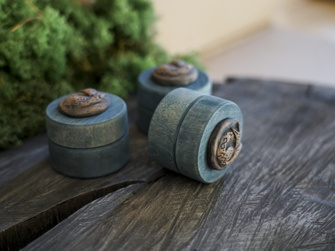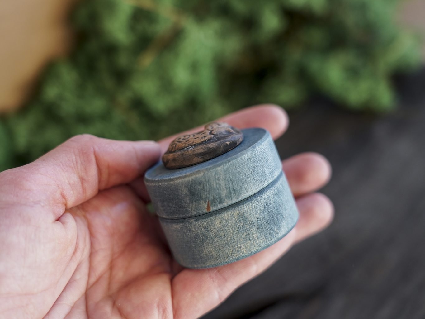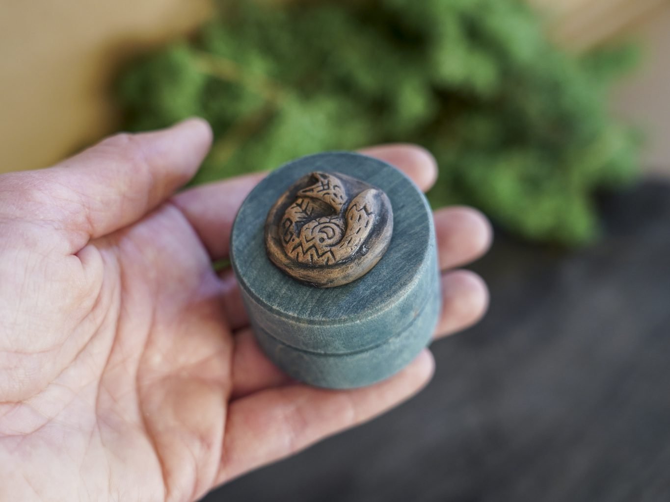 Ši maža dėžutė pagaminta iš medžio, dekoruota mano kurta keramikos detale – reljefine miegančia lape. Dėžutės vidus išklotas žaliomis impregnuotomis samanomis, kurios laikui bėgant nepraranda savo spalvos.