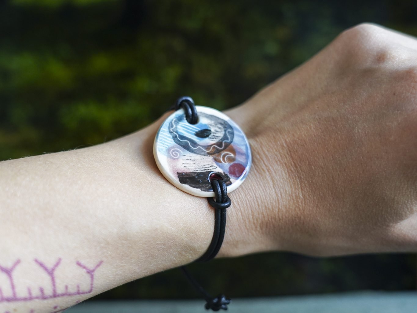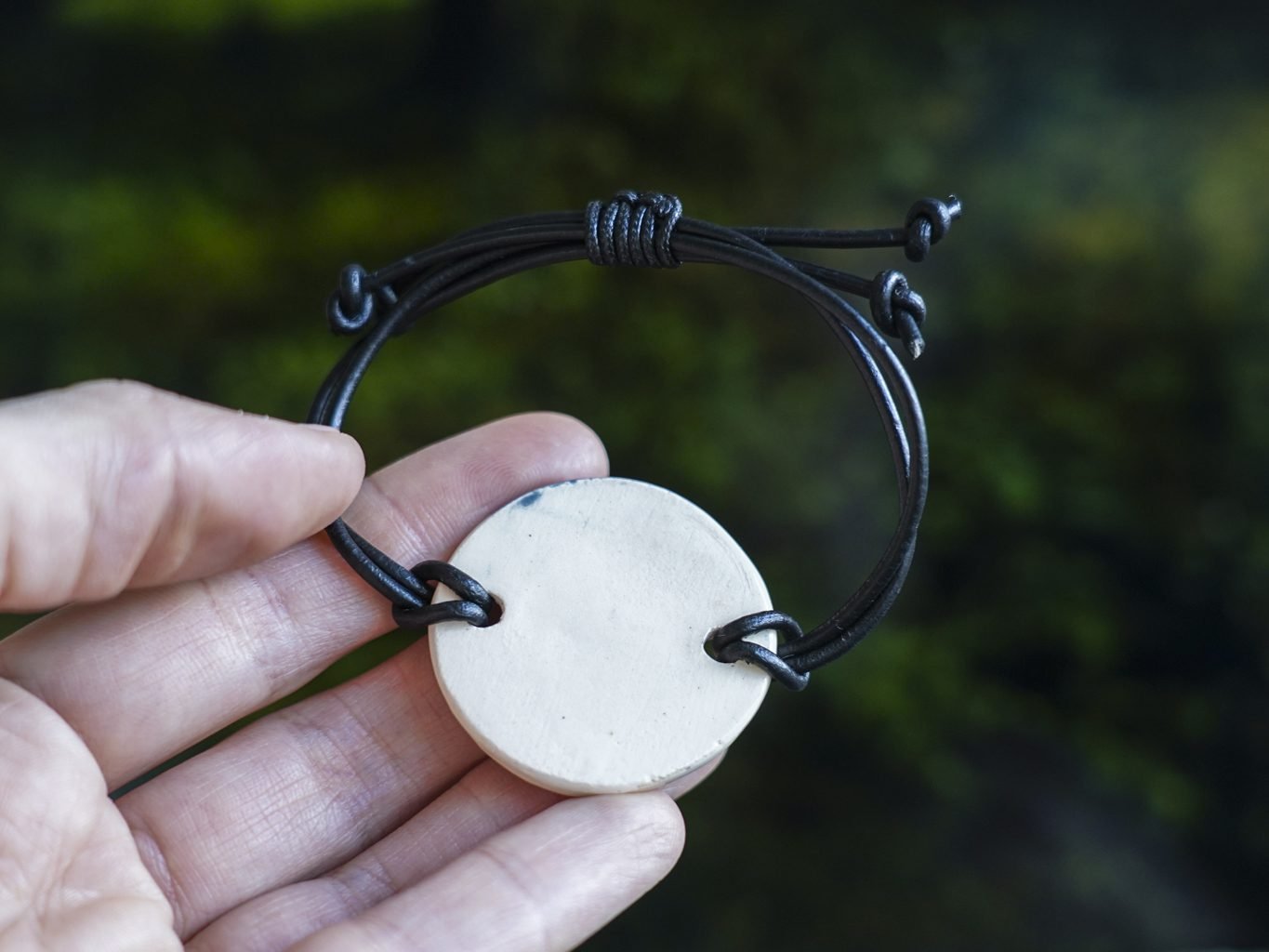 Papuošalai pagaminti iš keramikos. Iš balto molio nulipdytos formos išdegamos 1000 laipsnių temperatūroje, tada išpaišomos rankomis, padengiamos bespalve glazūra ir išdegamos antrąkart.