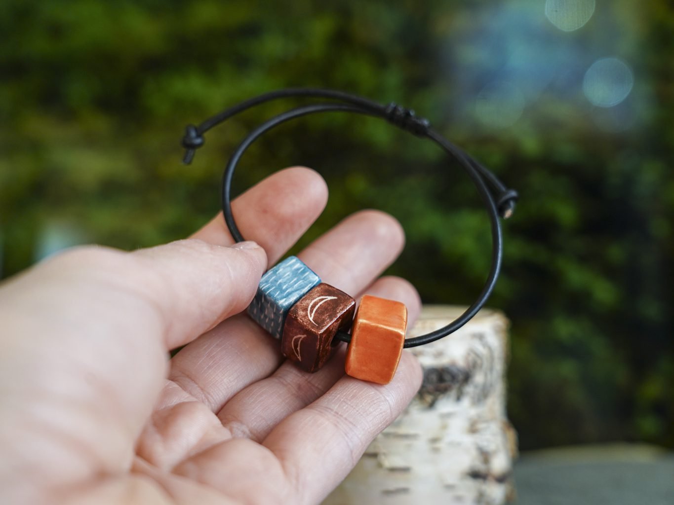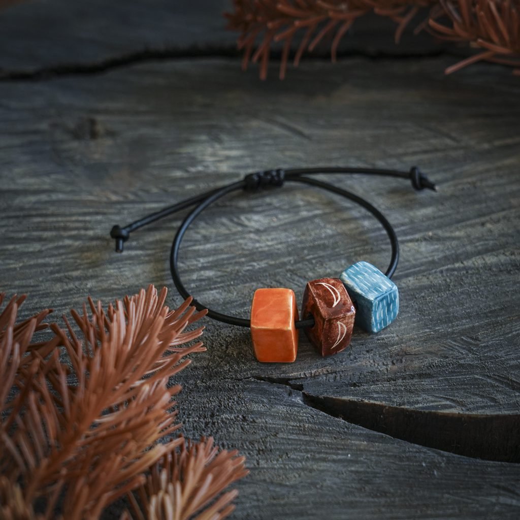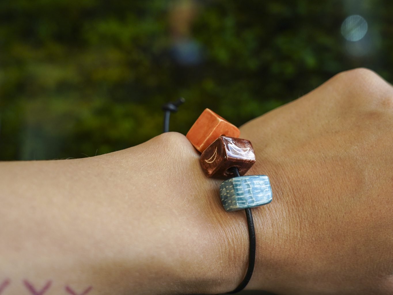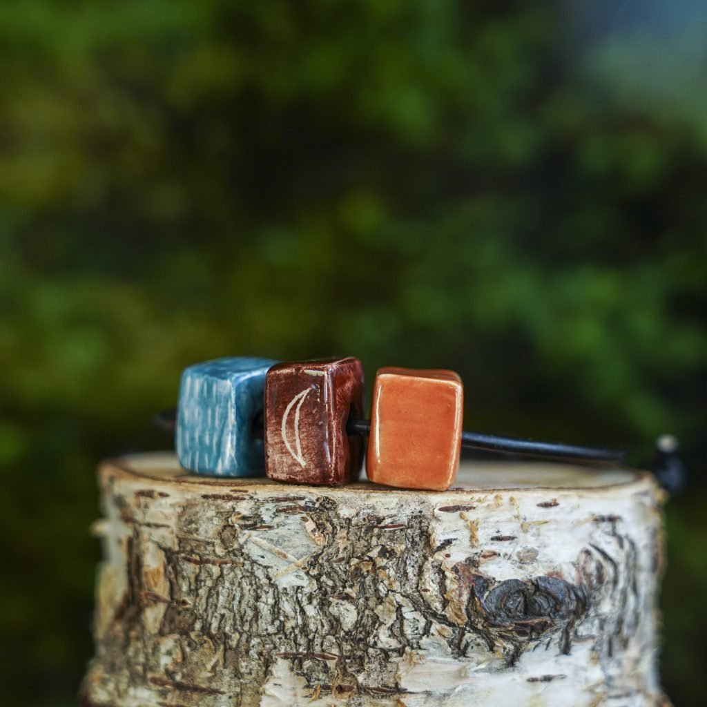 Papuošalai pagaminti iš keramikos. Iš balto molio nulipdytos formos išdegamos 1000 laipsnių temperatūroje, tada išpaišomos rankomis, padengiamos bespalve glazūra ir išdegamos antrąkart.
