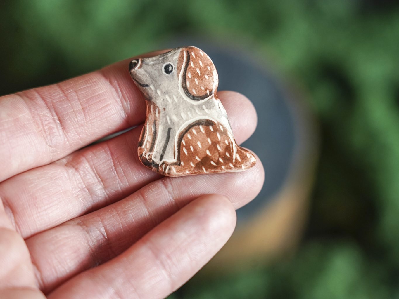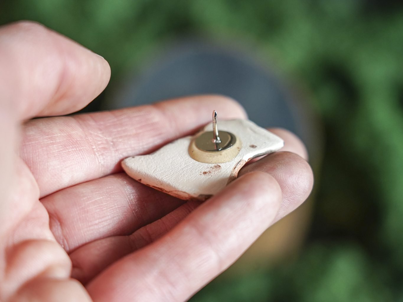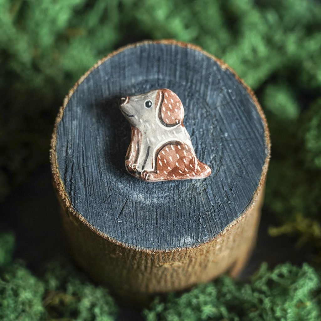 Papuošalai pagaminti iš keramikos. Iš molio nulipdytos formos išdegamos 1000 laipsnių temperatūroje, tada išpaišomos rankomis, padengiamos bespalve glazūra ir išdegamos antrąkart. Metalinė ženkliuko adatėlė pagaminta iš nerūdijančio plieno, kitoje pusėje užspaudžiama tvirta kietos gumos detale.