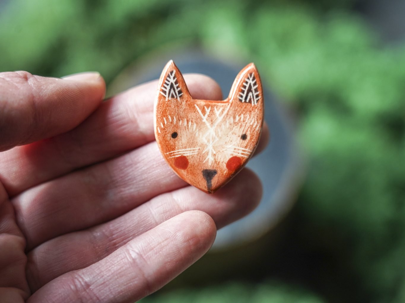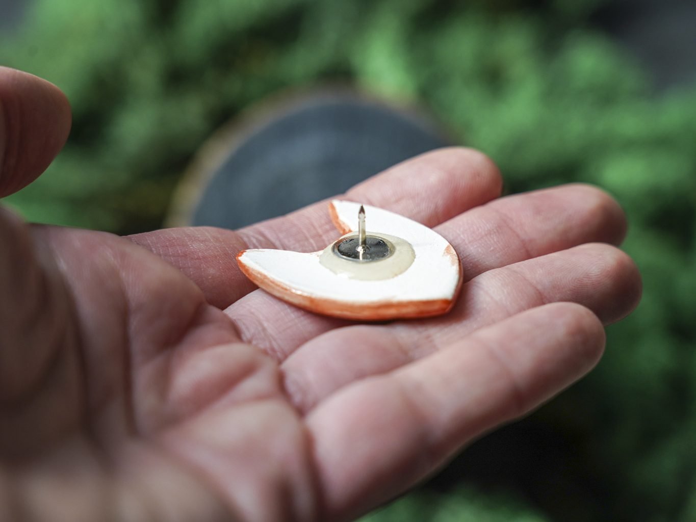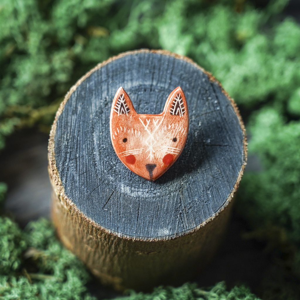 Papuošalai pagaminti iš keramikos. Iš molio nulipdytos formos išdegamos 1000 laipsnių temperatūroje, tada išpaišomos rankomis, padengiamos bespalve glazūra ir išdegamos antrąkart. Metalinė ženkliuko adatėlė pagaminta iš nerūdijančio plieno, kitoje pusėje užspaudžiama tvirta kietos gumos detale.