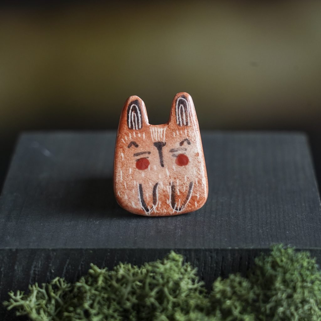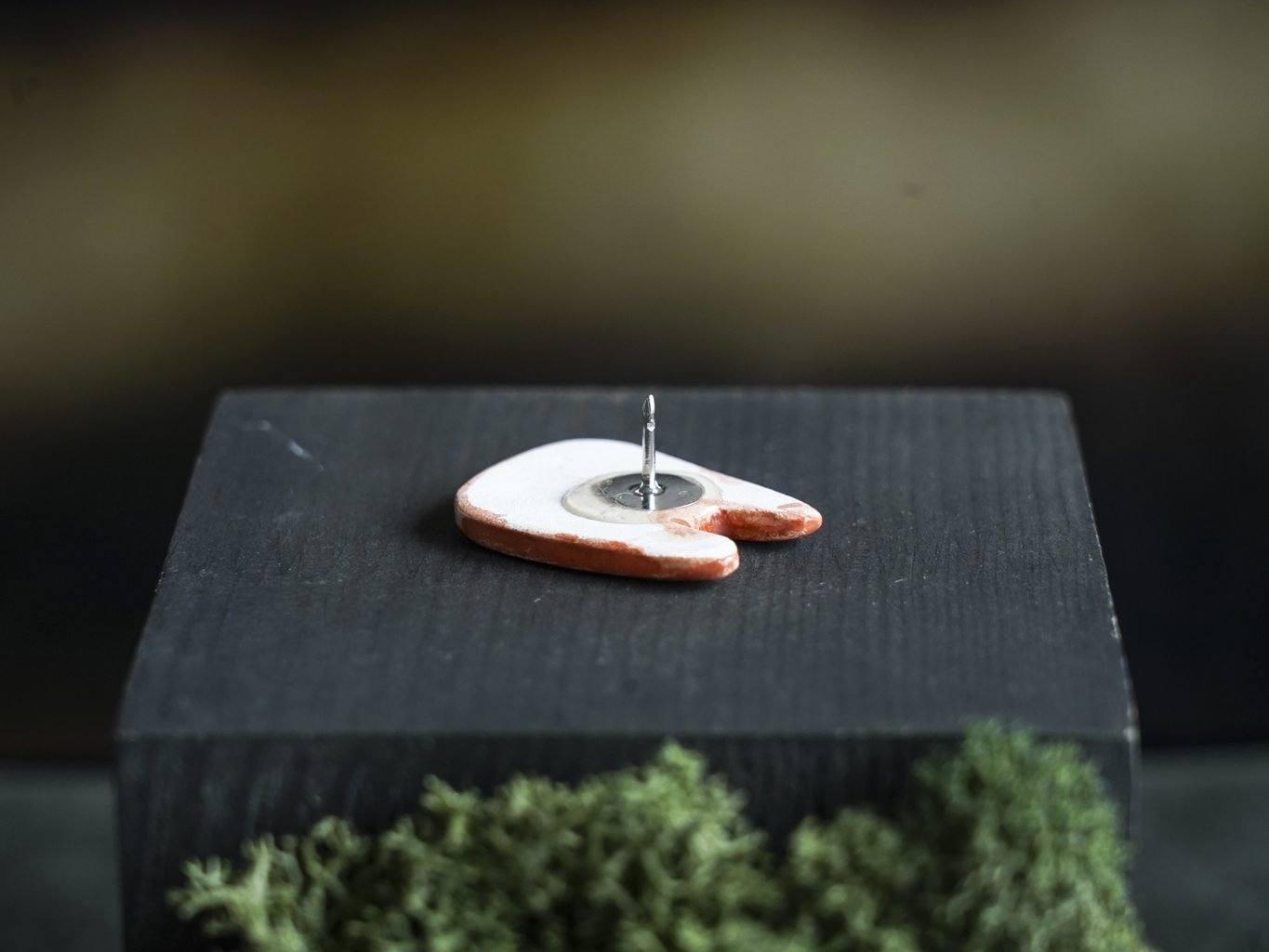 Papuošalai pagaminti iš keramikos. Iš balto molio nulipdytos formos išdegamos 1000 laipsnių temperatūroje, tada išpaišomos rankomis, padengiamos bespalve glazūra ir išdegamos antrąkart. Metalinė ženkliuko adatėlė pagaminta iš nerūdijančio plieno, kitoje pusėje užspaudžiama tvirta kietos gumos detale.