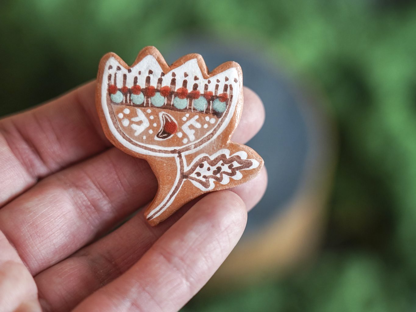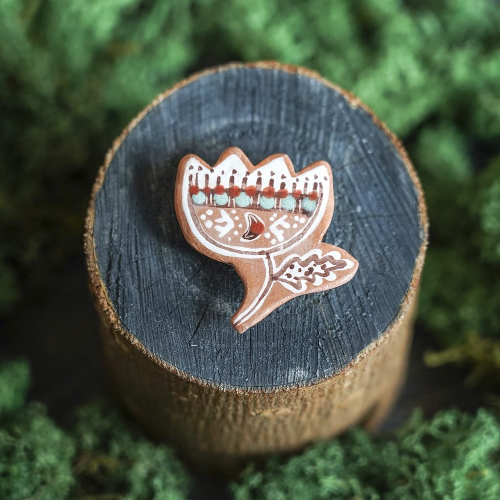 Papuošalai pagaminti iš keramikos. Iš molio nulipdytos formos išdegamos 1000 laipsnių temperatūroje, tada išpaišomos rankomis, padengiamos bespalve glazūra ir išdegamos antrąkart. Metalinė ženkliuko adatėlė pagaminta iš nerūdijančio plieno, kitoje pusėje užspaudžiama tvirta kietos gumos detale.