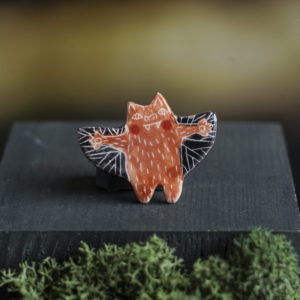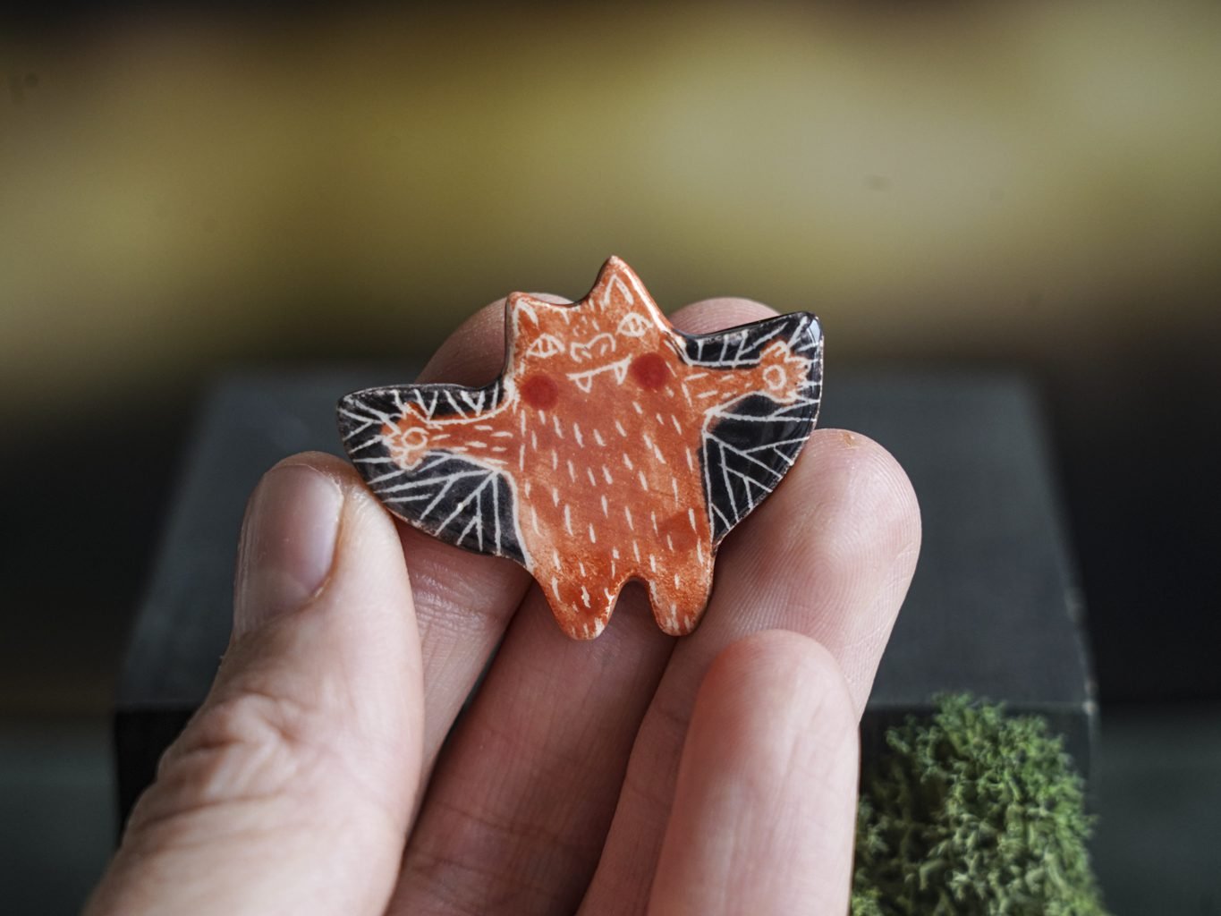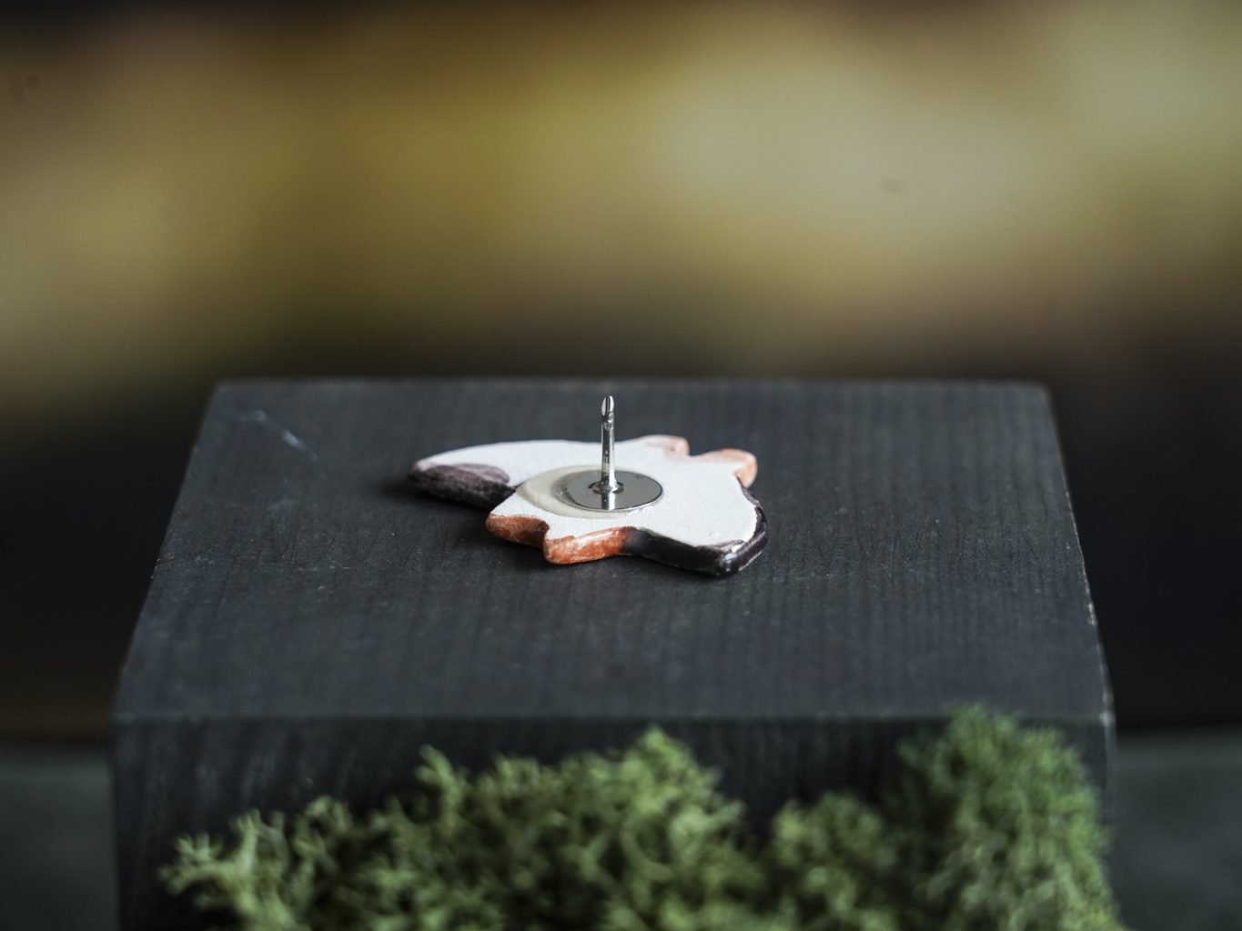 Papuošalai pagaminti iš keramikos. Iš balto molio nulipdytos formos išdegamos 1000 laipsnių temperatūroje, tada išpaišomos rankomis, padengiamos bespalve glazūra ir išdegamos antrąkart. Metalinė ženkliuko adatėlė pagaminta iš nerūdijančio plieno, kitoje pusėje užspaudžiama tvirta kietos gumos detale.