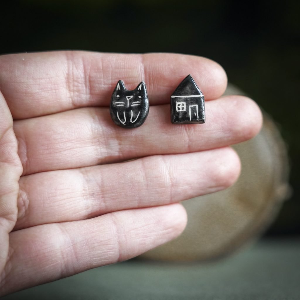 Papuošalai pagaminti iš keramikos. Iš balto molio nulipdytos formos išdegamos 1000 laipsnių temperatūroje, tada išpaišomos rankomis, padengiamos bespalve glazūra ir išdegamos antrąkart. Auskarų adatėlės pagamintos iš nerūdijančio plieno.