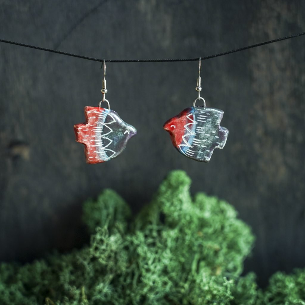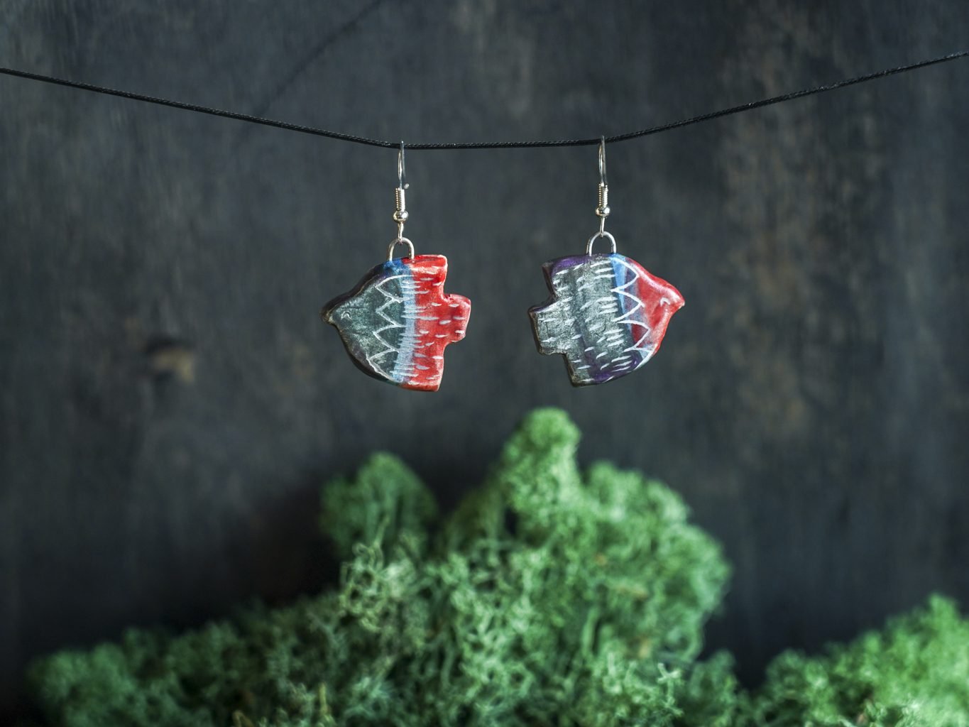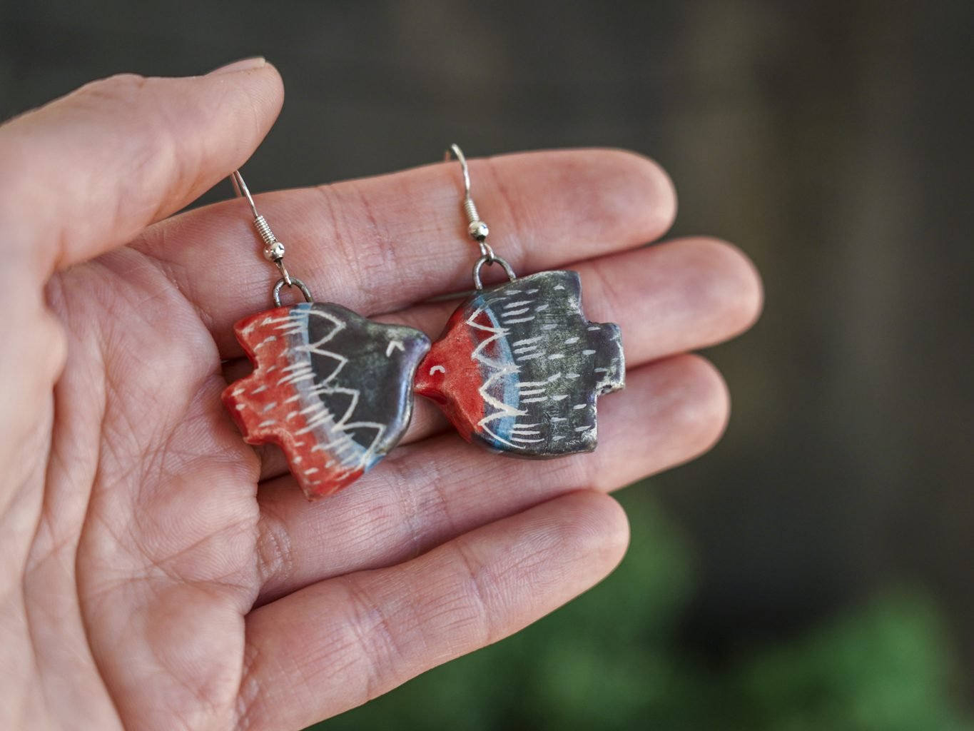 Papuošalai pagaminti iš keramikos. Iš molio nulipdytos formos išdegamos 1000 laipsnių temperatūroje, tada išpaišomos rankomis, padengiamos bespalve glazūra ir išdegamos antrąkart. Auskarų kabliukai pagaminti iš nerūdijančio plieno.