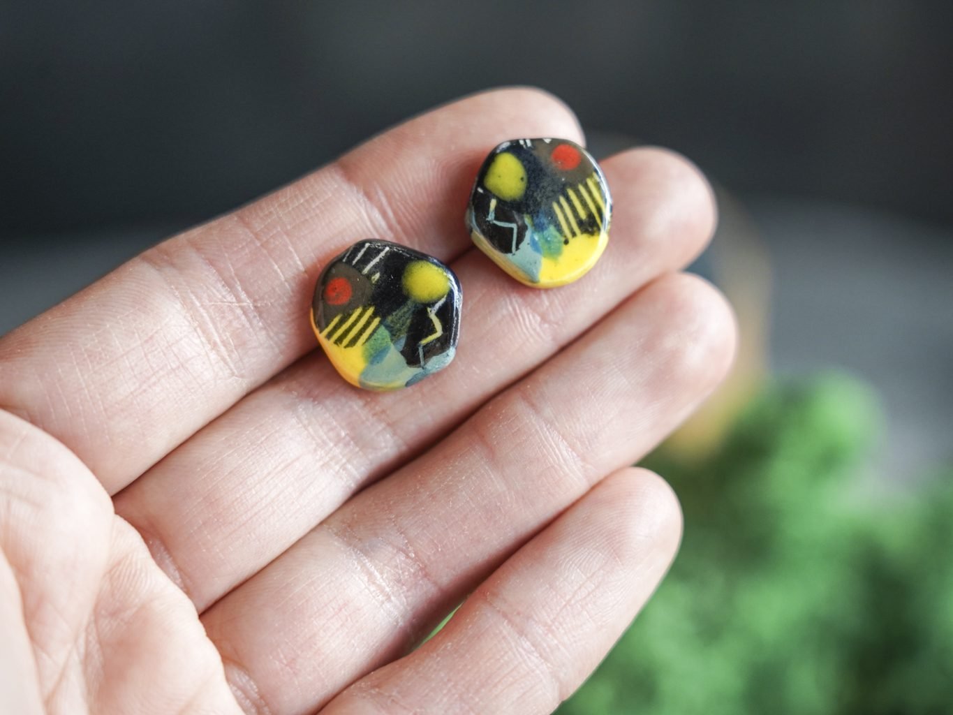 Papuošalai pagaminti iš keramikos. Iš molio nulipdytos formos išdegamos 1000 laipsnių temperatūroje, tada išpaišomos rankomis, padengiamos bespalve glazūra ir išdegamos antrąkart. Auskarų adatėlės pagamintos iš nerūdijančio plieno.