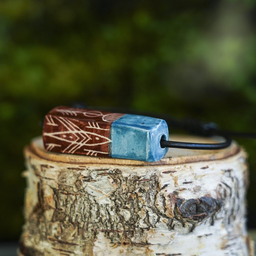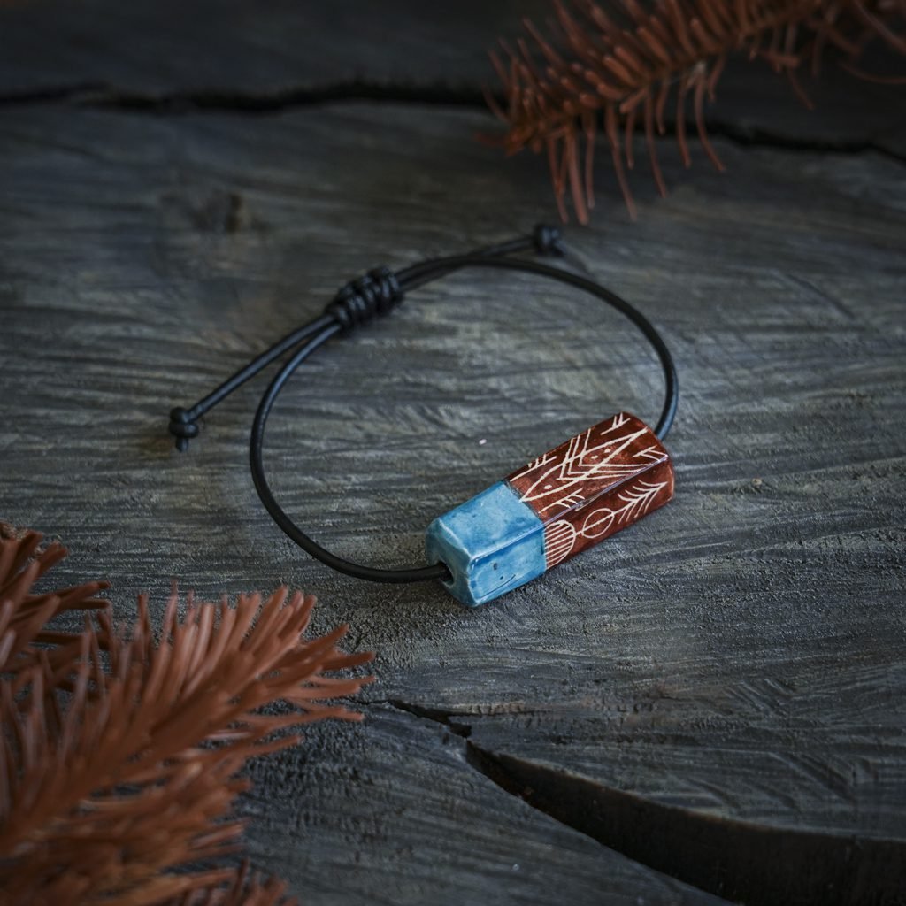 Papuošalai pagaminti iš keramikos. Iš balto molio nulipdytos formos išdegamos 1000 laipsnių temperatūroje, tada išpaišomos rankomis, padengiamos bespalve glazūra ir išdegamos antrąkart.