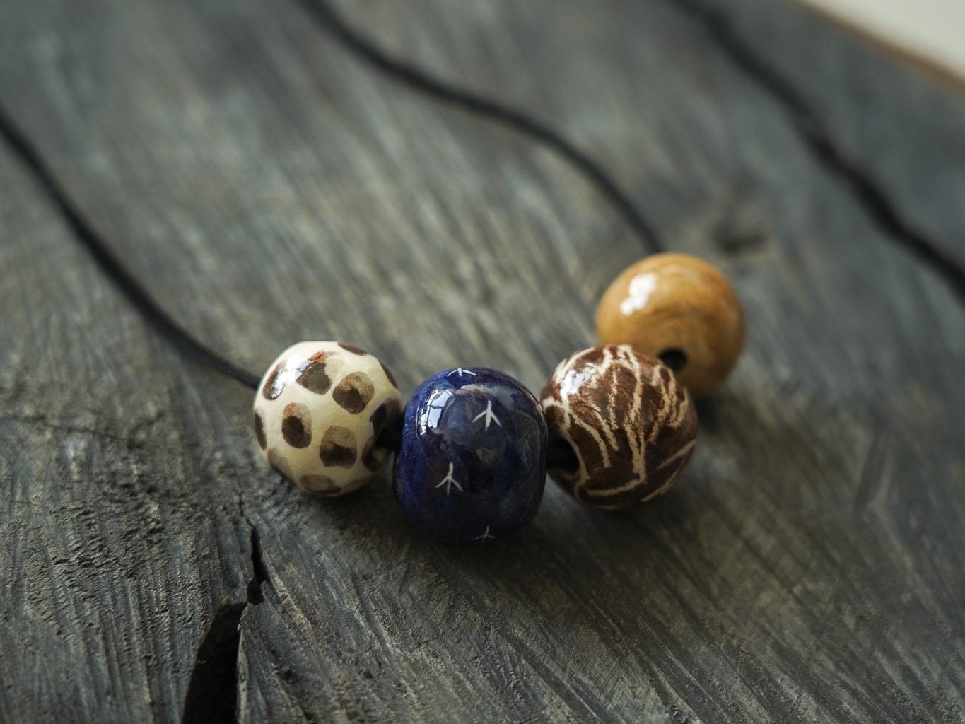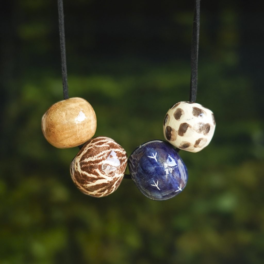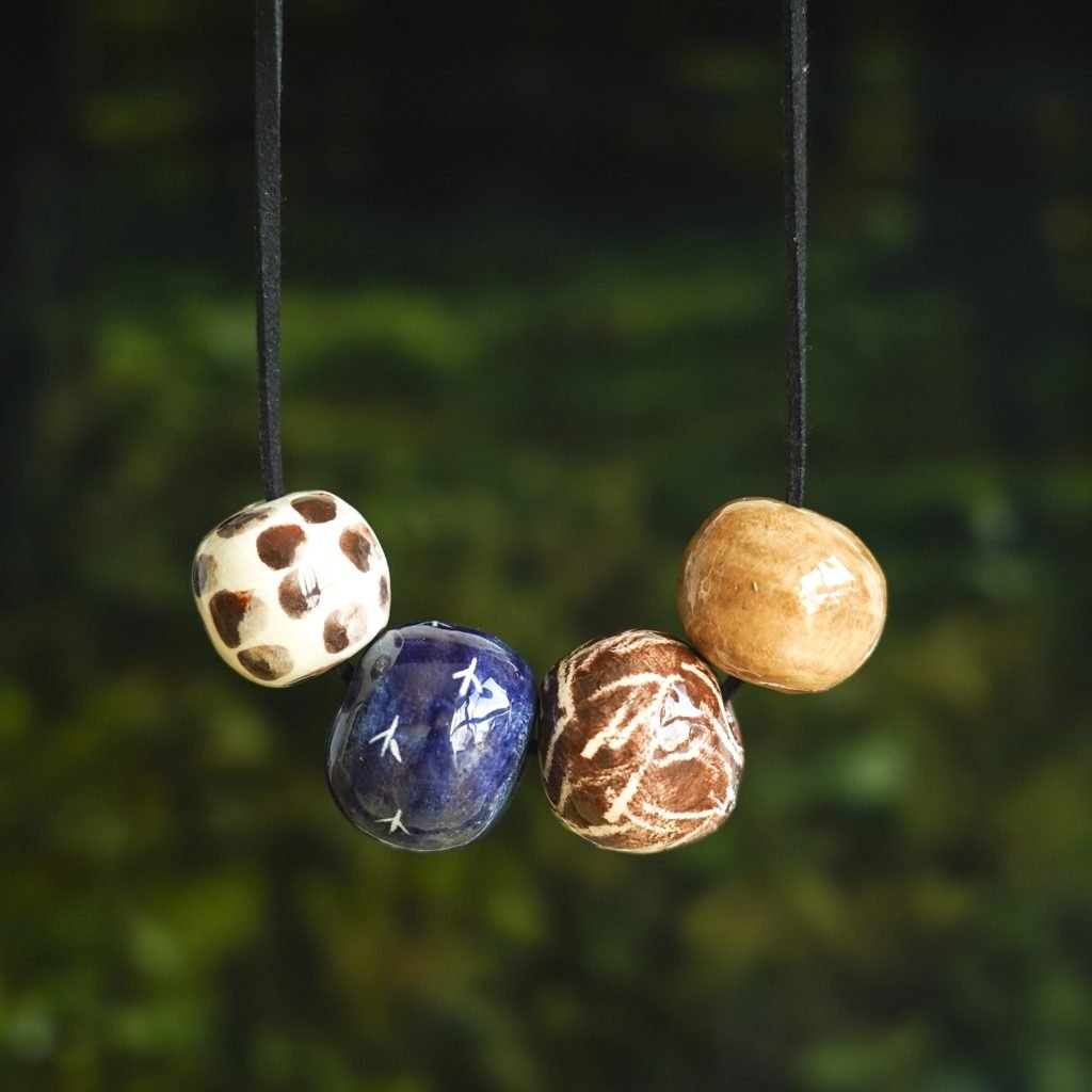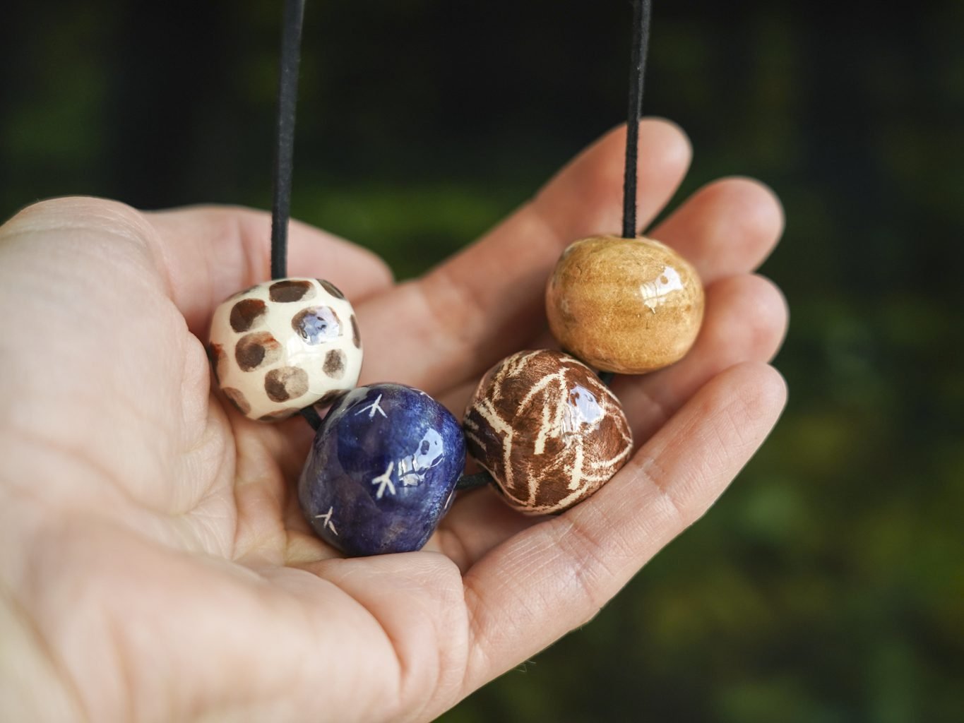 Papuošalai pagaminti iš keramikos. Iš balto molio nulipdytos formos išdegamos 1000 laipsnių temperatūroje, tada išpaišomos rankomis, padengiamos bespalve glazūra ir išdegamos antrąkart.