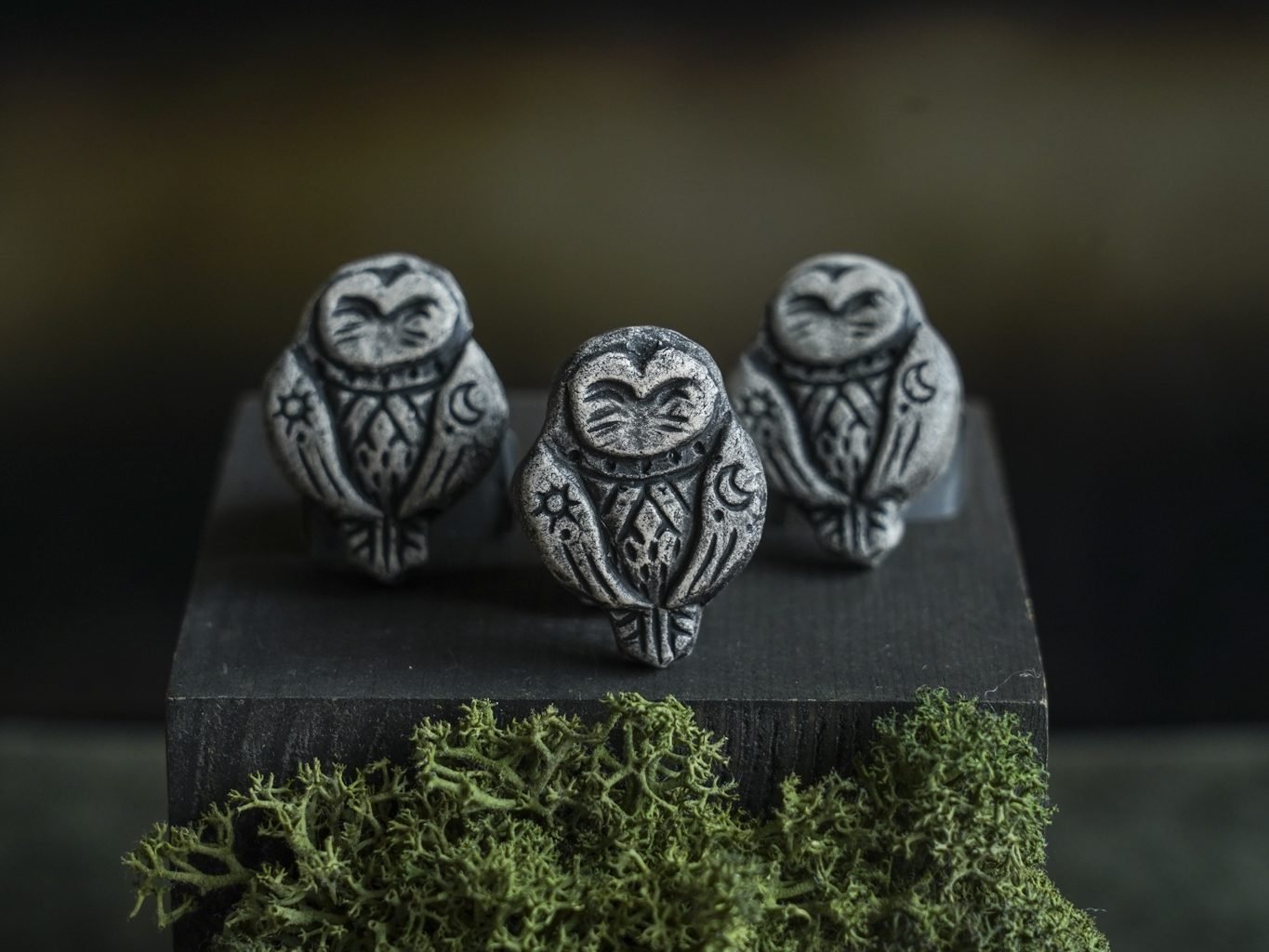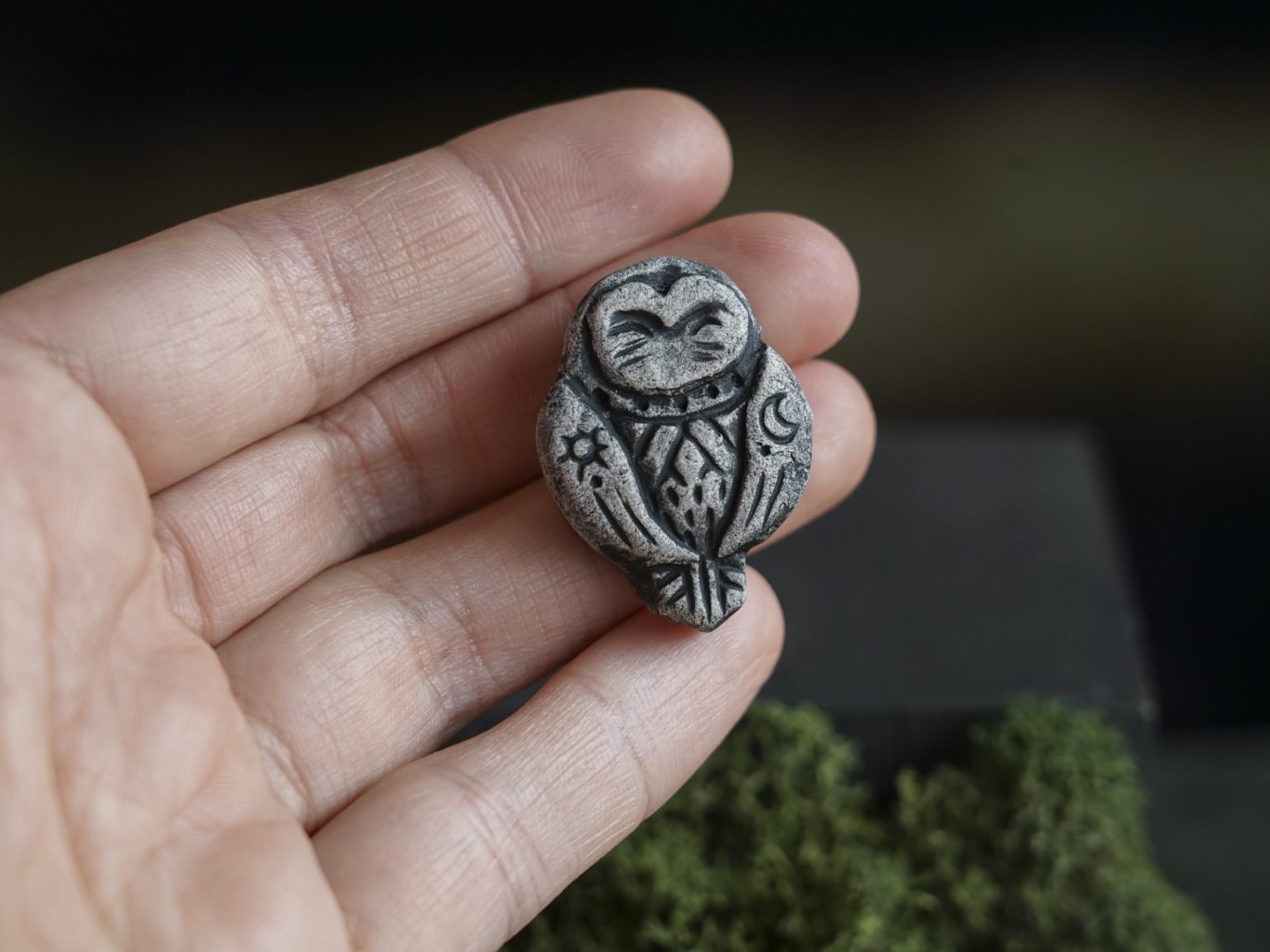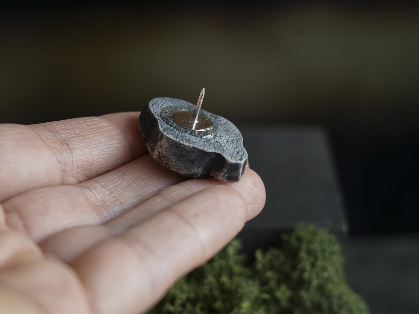 Papuošalai pagaminti iš keramikos. Iš balto molio nulipdytos formos išdegamos 1000 laipsnių temperatūroje, tada tonuojamos rankomis. Metalinė ženkliuko adatėlė pagaminta iš nerūdijančio plieno, kitoje pusėje užspaudžiama tvirta kietos gumos detale.
