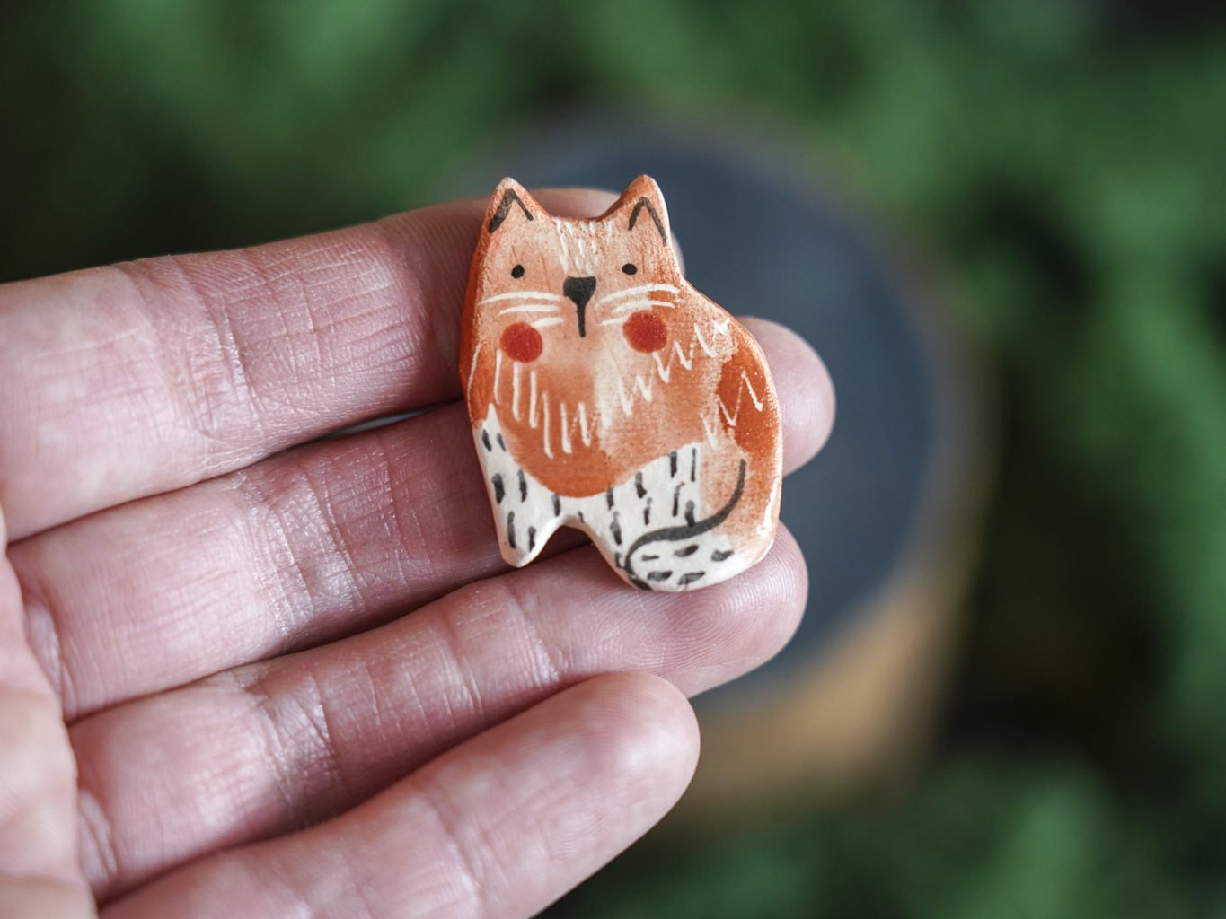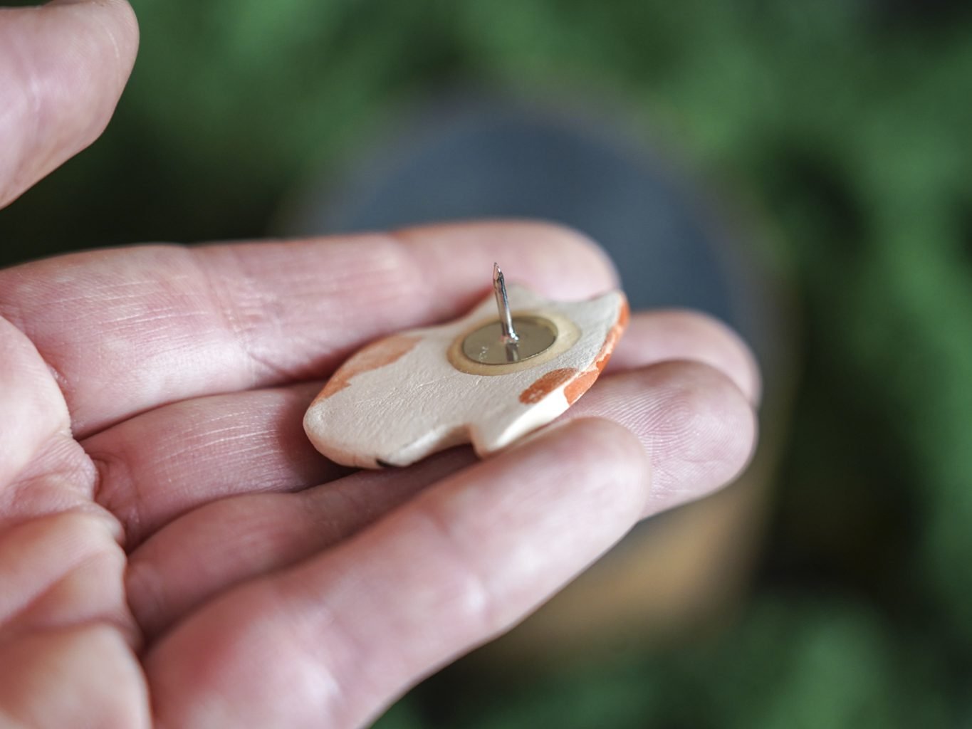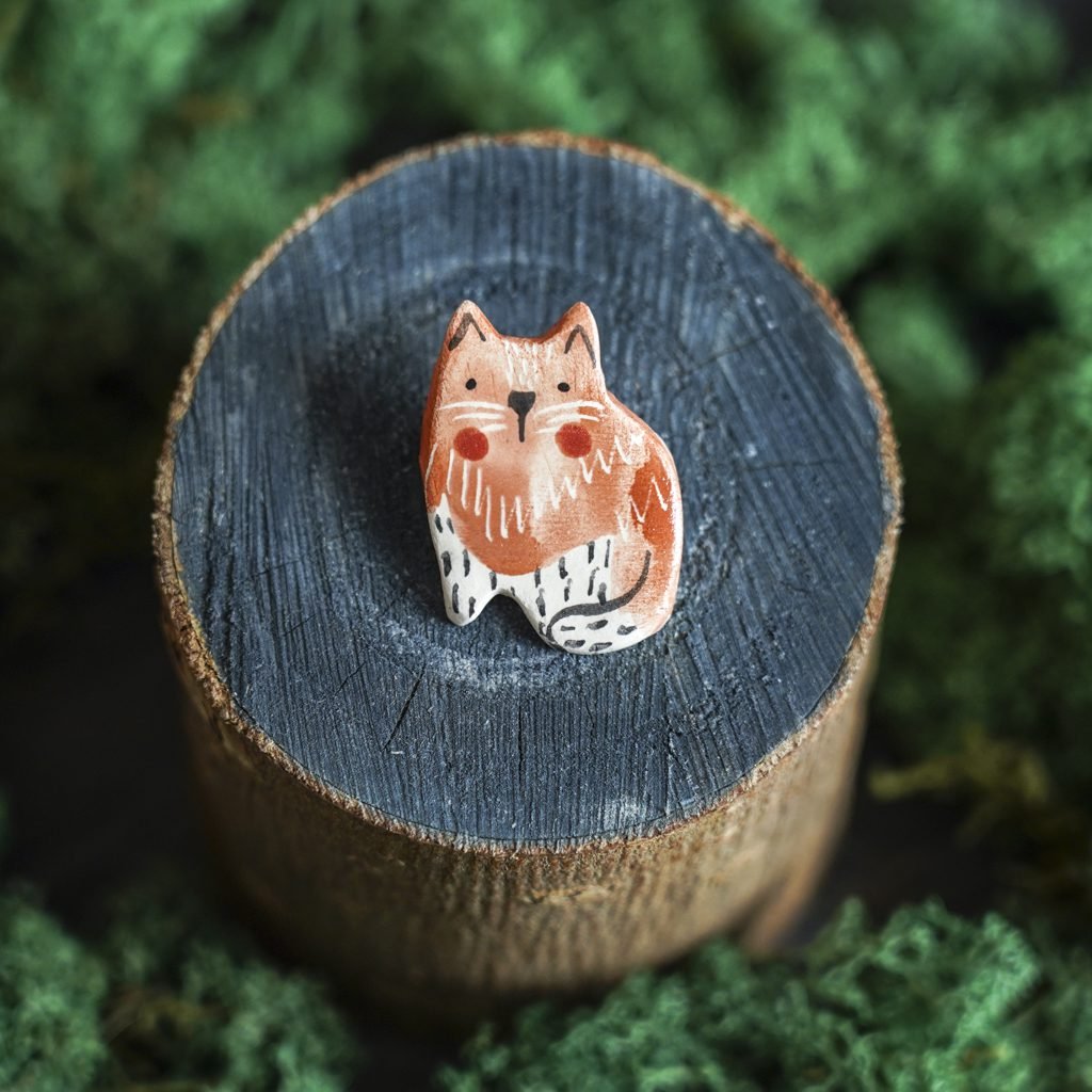 Papuošalai pagaminti iš keramikos. Iš molio nulipdytos formos išdegamos 1000 laipsnių temperatūroje, tada išpaišomos rankomis, padengiamos bespalve glazūra ir išdegamos antrąkart. Metalinė ženkliuko adatėlė pagaminta iš nerūdijančio plieno, kitoje pusėje užspaudžiama tvirta kietos gumos detale.
