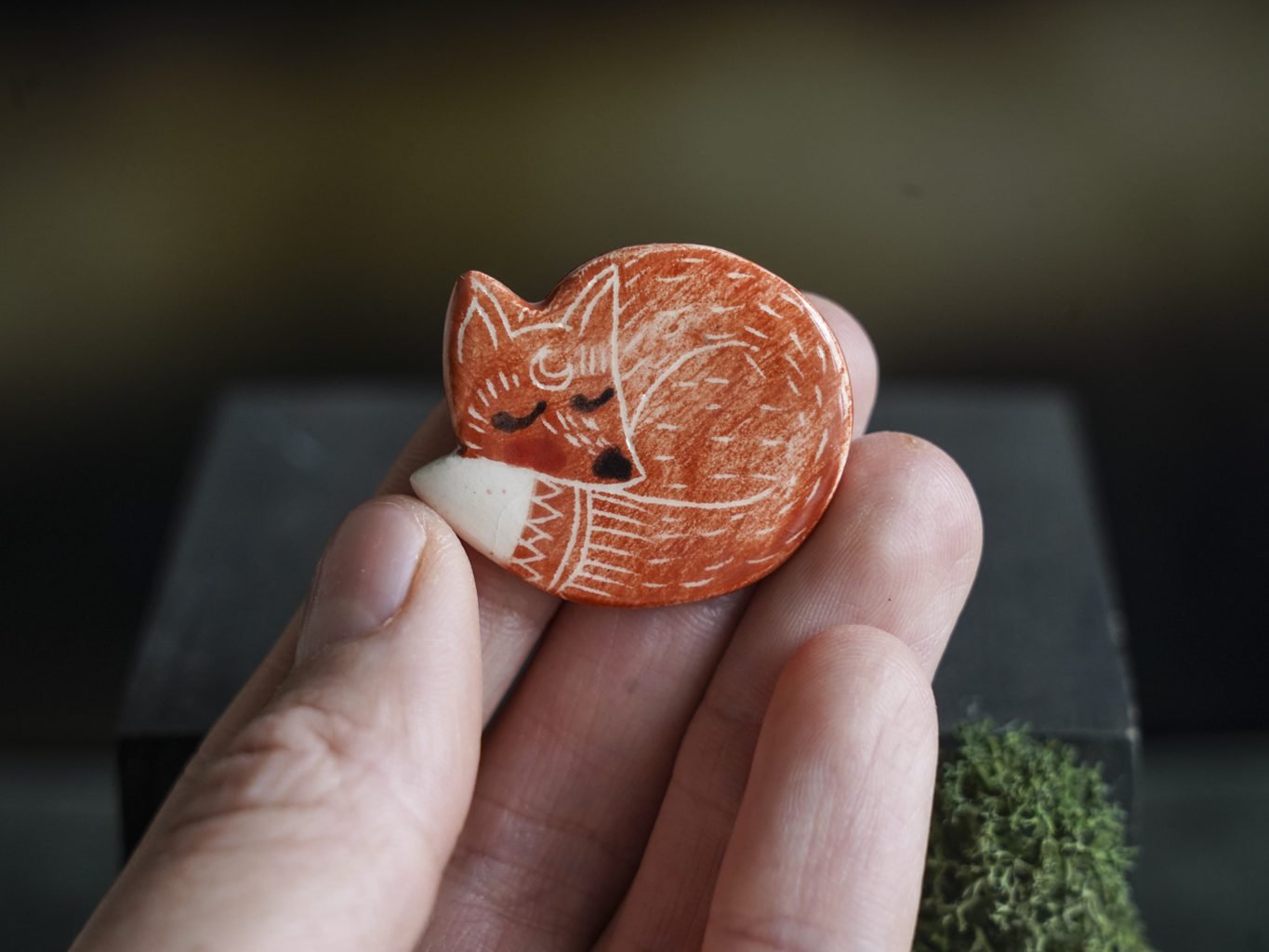 Papuošalai pagaminti iš keramikos. Iš balto molio nulipdytos formos išdegamos 1000 laipsnių temperatūroje, tada išpaišomos rankomis, padengiamos bespalve glazūra ir išdegamos antrąkart. Metalinė ženkliuko adatėlė pagaminta iš nerūdijančio plieno, kitoje pusėje užspaudžiama tvirta kietos gumos detale.