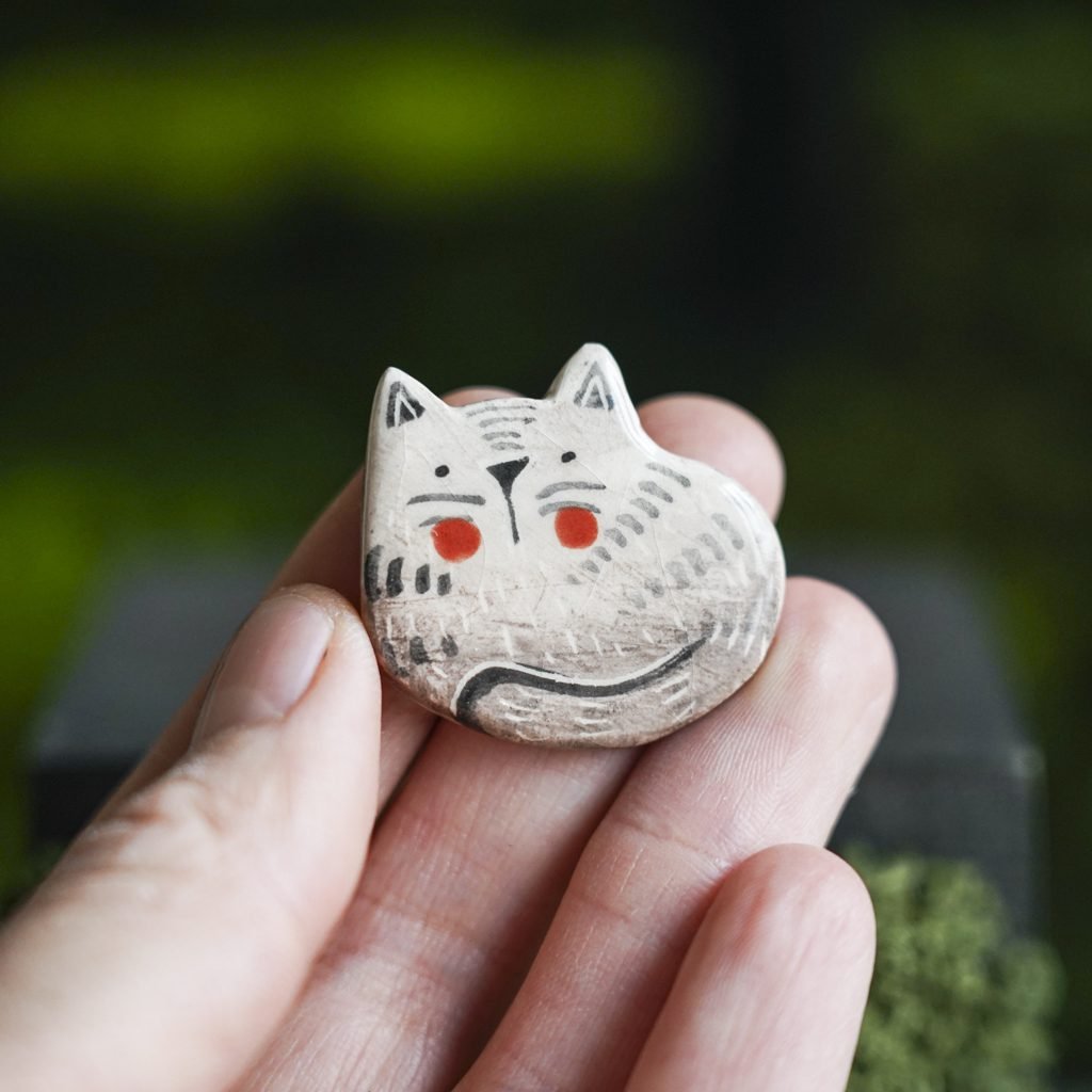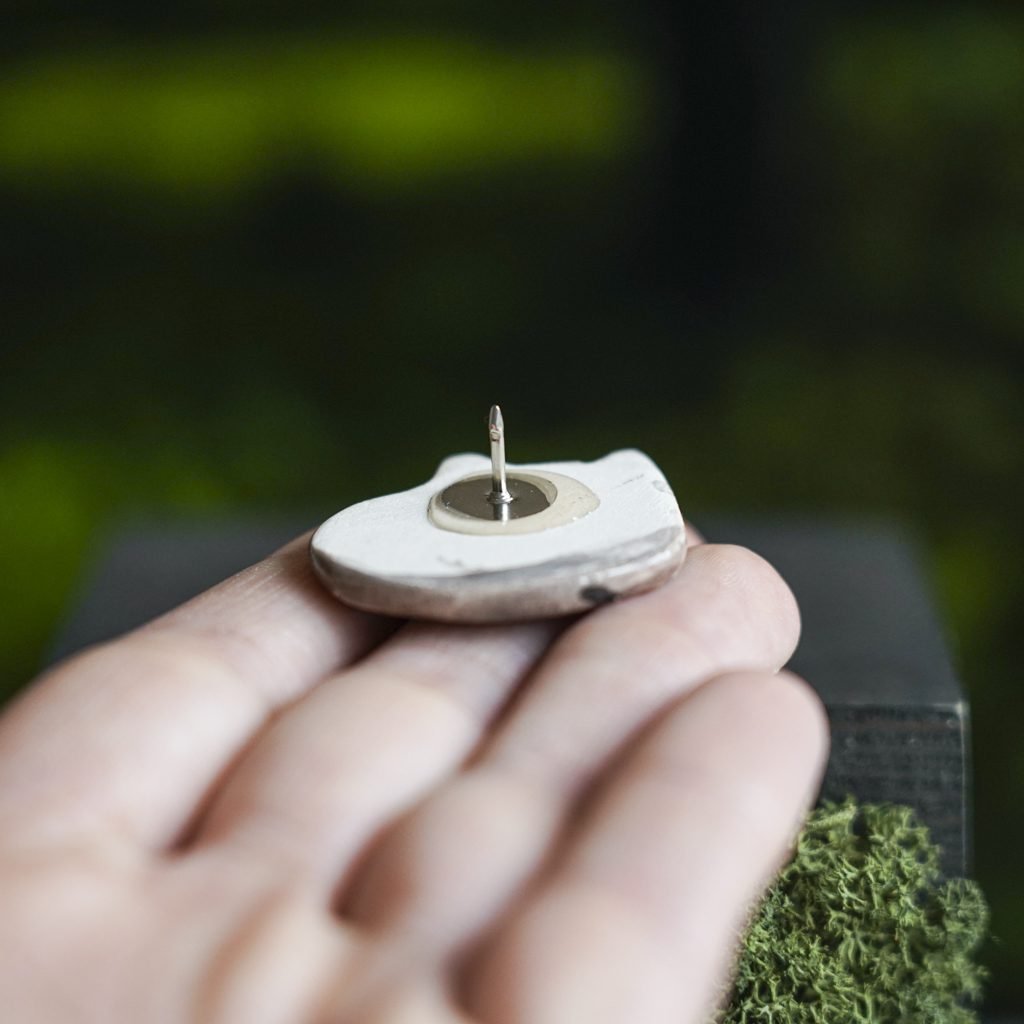 Papuošalai pagaminti iš keramikos. Iš balto molio nulipdytos formos išdegamos 1000 laipsnių temperatūroje, tada išpaišomos rankomis, padengiamos bespalve glazūra ir išdegamos antrąkart. Metalinė ženkliuko adatėlė pagaminta iš nerūdijančio plieno, kitoje pusėje užspaudžiama tvirta kietos gumos detale.