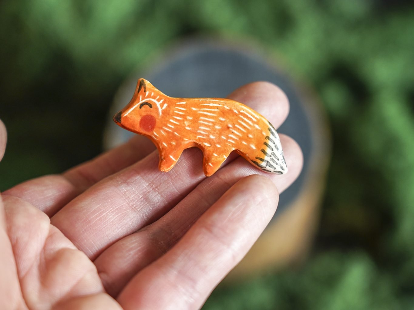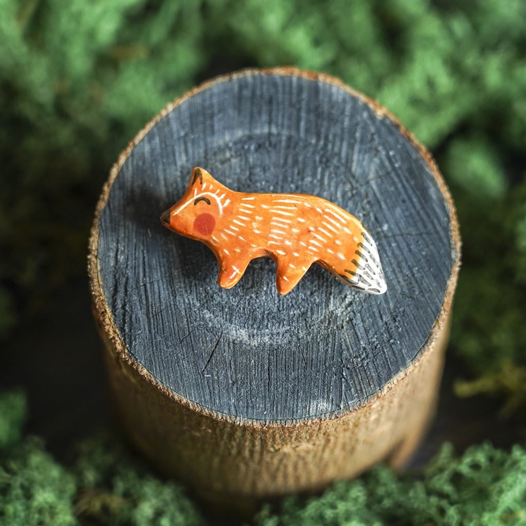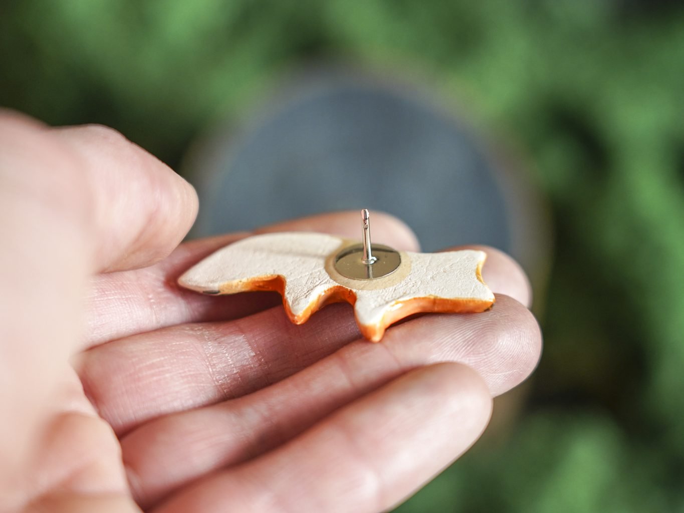 Papuošalai pagaminti iš keramikos. Iš molio nulipdytos formos išdegamos 1000 laipsnių temperatūroje, tada išpaišomos rankomis, padengiamos bespalve glazūra ir išdegamos antrąkart. Metalinė ženkliuko adatėlė pagaminta iš nerūdijančio plieno, kitoje pusėje užspaudžiama tvirta kietos gumos detale.