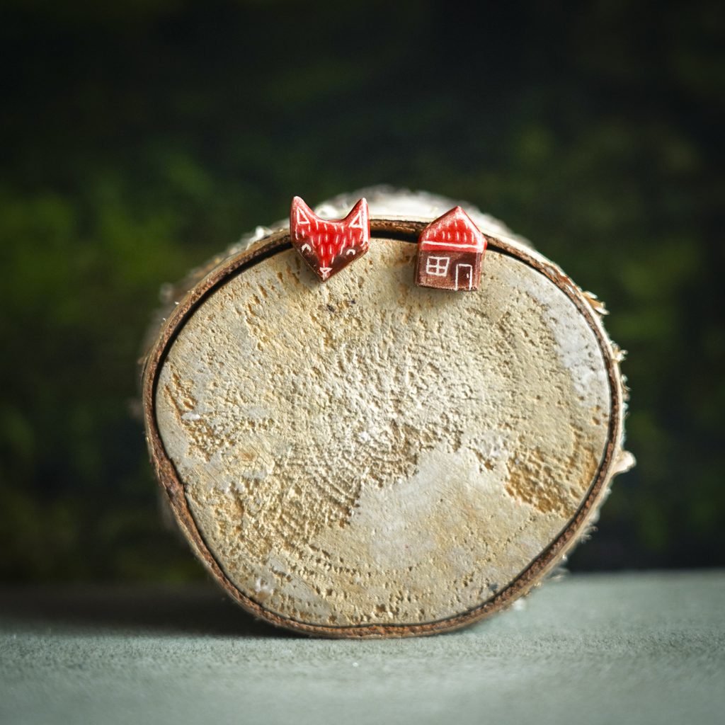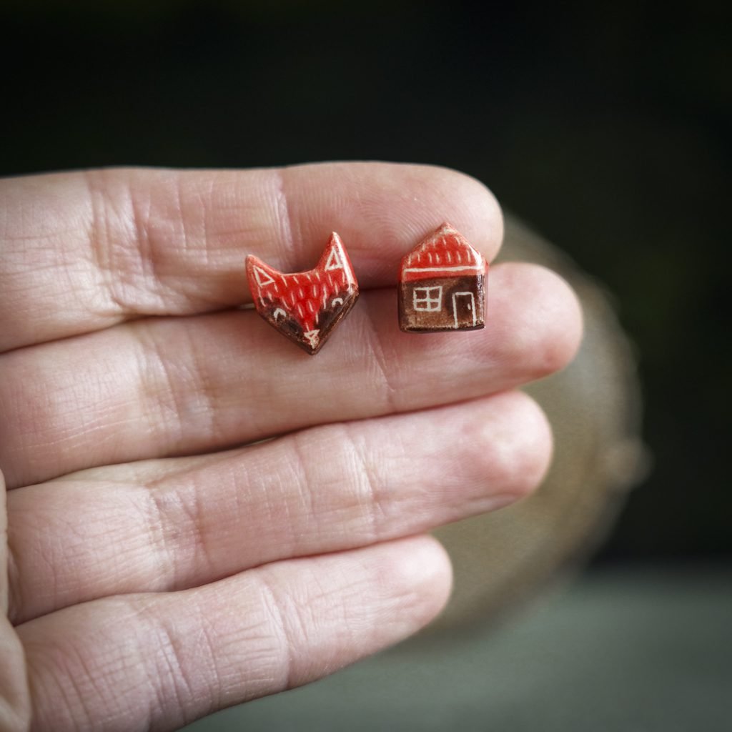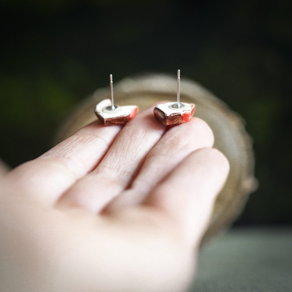 Papuošalai pagaminti iš keramikos. Iš balto molio nulipdytos formos išdegamos 1000 laipsnių temperatūroje, tada išpaišomos rankomis, padengiamos bespalve glazūra ir išdegamos antrąkart. Auskarų adatėlės pagamintos iš nerūdijančio plieno.