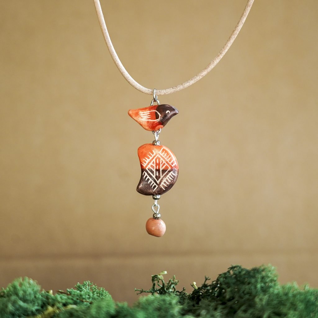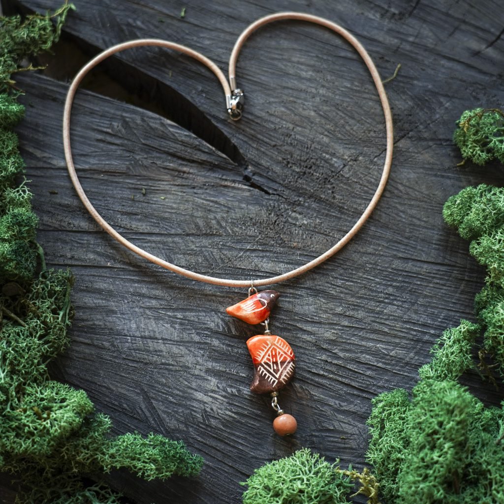 Papuošalai pagaminti iš keramikos. Iš balto molio nulipdytos formos išdegamos 1000 laipsnių temperatūroje, tada išpaišomos rankomis, padengiamos bespalve glazūra ir išdegamos antrąkart.