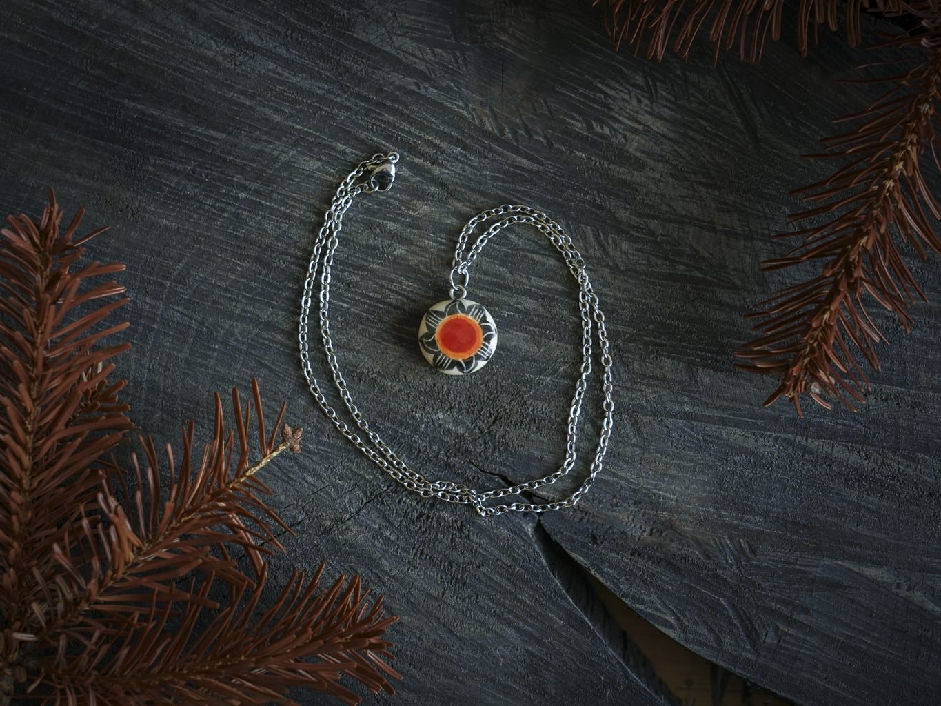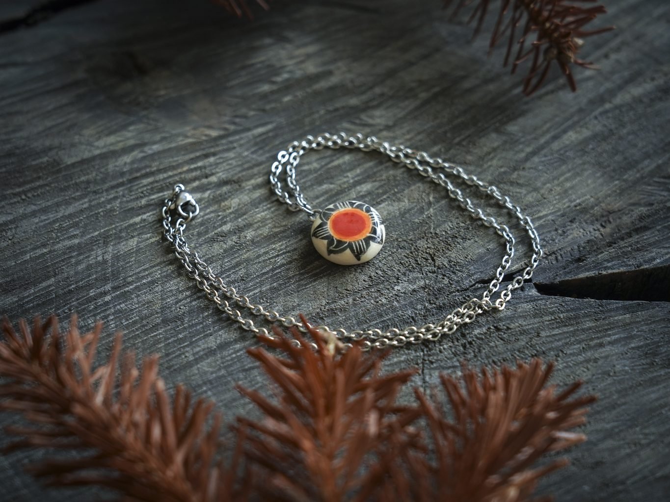 Papuošalai pagaminti iš keramikos. Iš balto molio nulipdytos formos išdegamos 1000 laipsnių temperatūroje, tada išpaišomos rankomis, padengiamos bespalve glazūra ir išdegamos antrąkart.