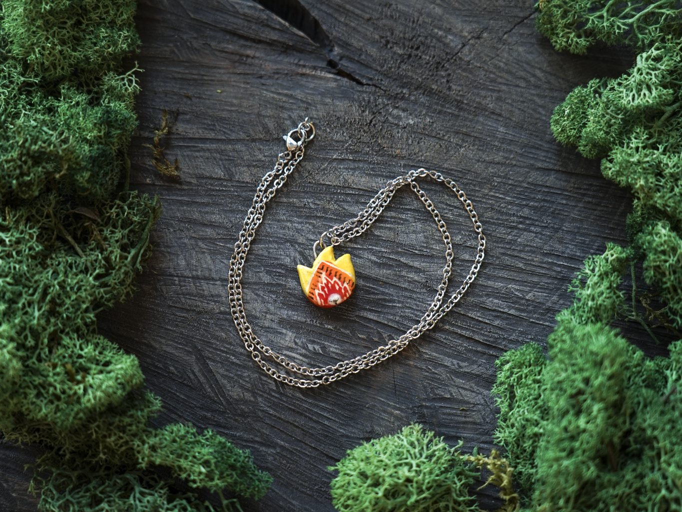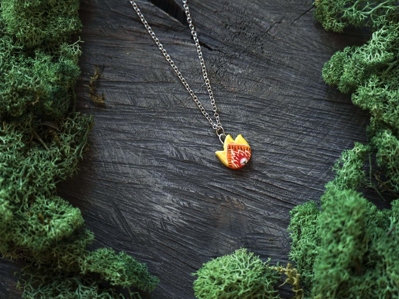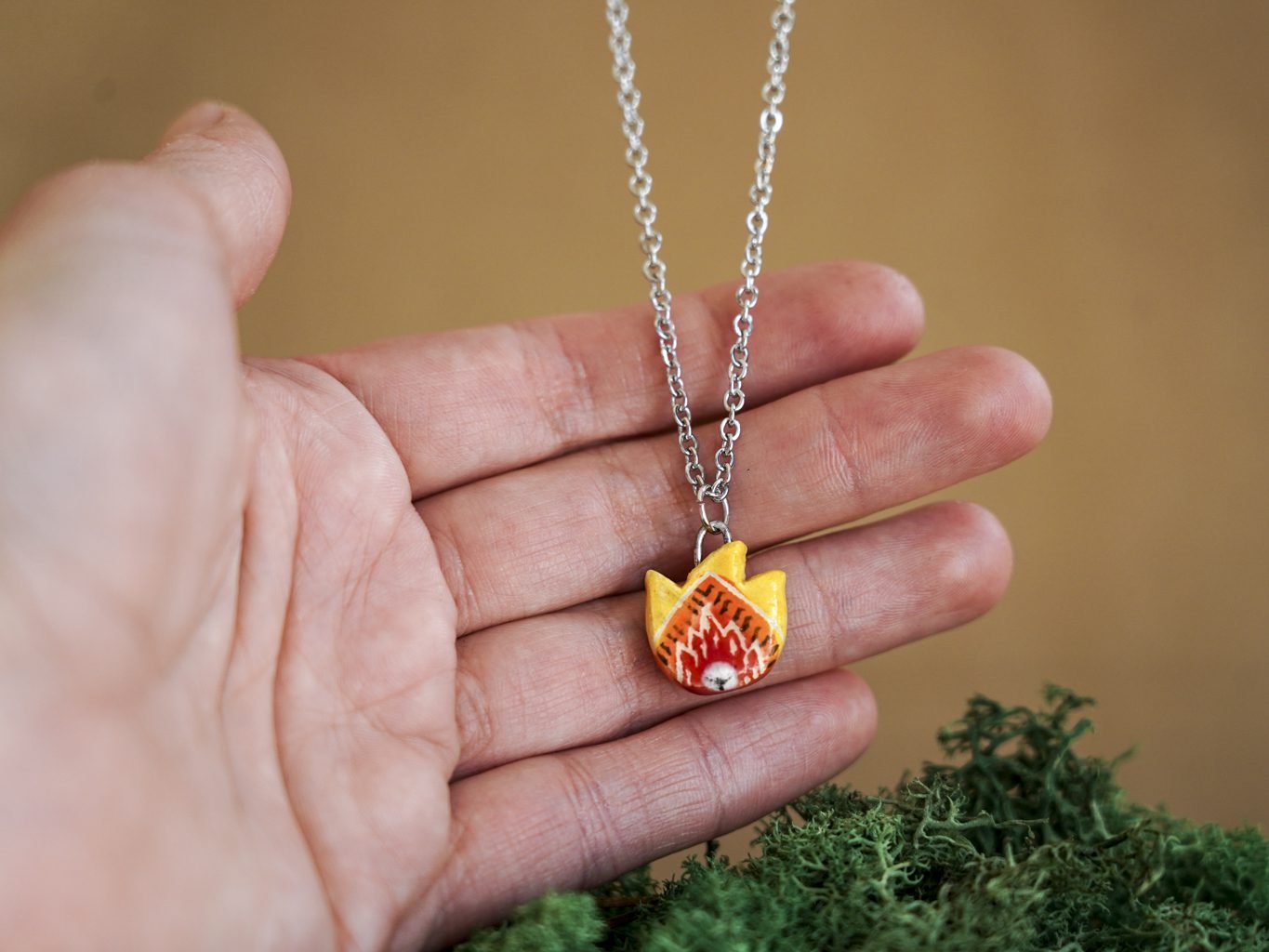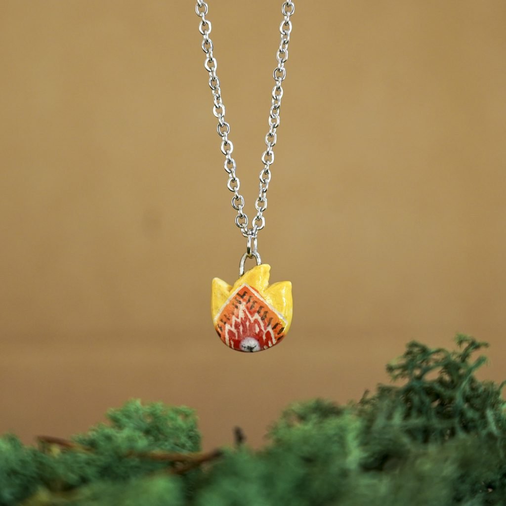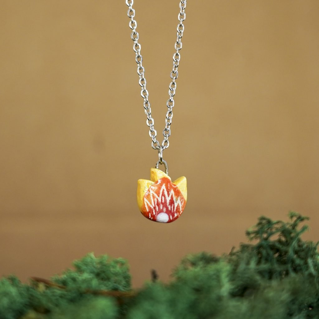 Papuošalai pagaminti iš keramikos. Iš balto molio nulipdytos formos išdegamos 1000 laipsnių temperatūroje, tada išpaišomos rankomis, padengiamos bespalve glazūra ir išdegamos antrąkart.