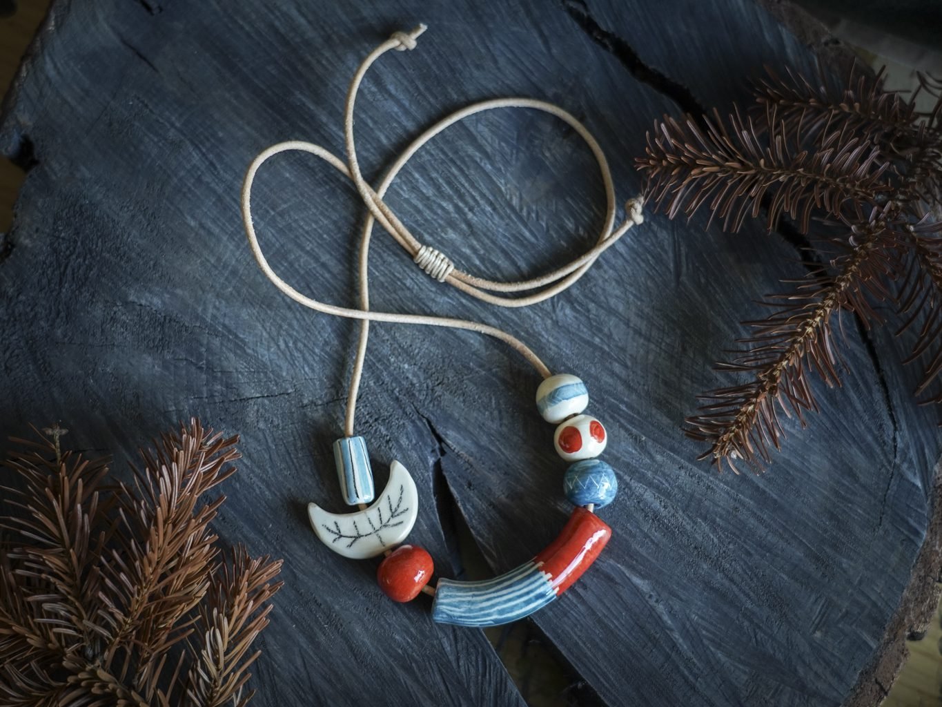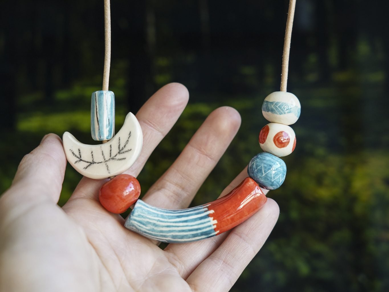 Papuošalai pagaminti iš keramikos. Iš balto molio nulipdytos formos išdegamos 1000 laipsnių temperatūroje, tada išpaišomos rankomis, padengiamos bespalve glazūra ir išdegamos antrąkart.