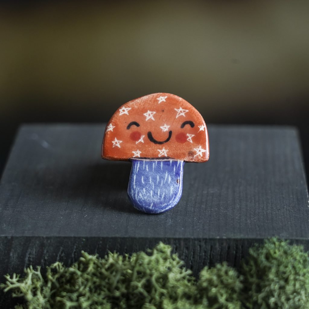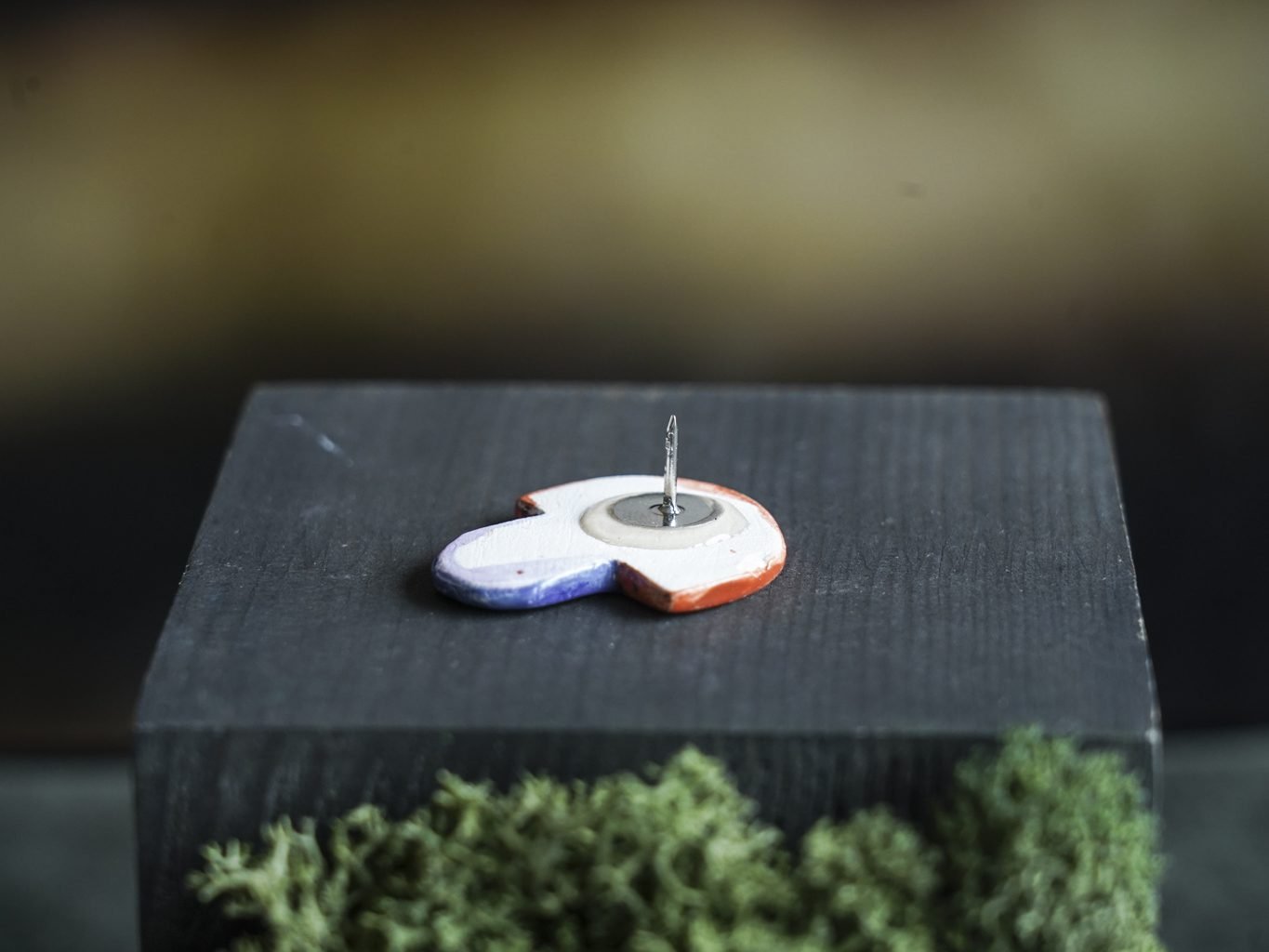 Papuošalai pagaminti iš keramikos. Iš balto molio nulipdytos formos išdegamos 1000 laipsnių temperatūroje, tada išpaišomos rankomis, padengiamos bespalve glazūra ir išdegamos antrąkart. Metalinė ženkliuko adatėlė pagaminta iš nerūdijančio plieno, kitoje pusėje užspaudžiama tvirta kietos gumos detale.