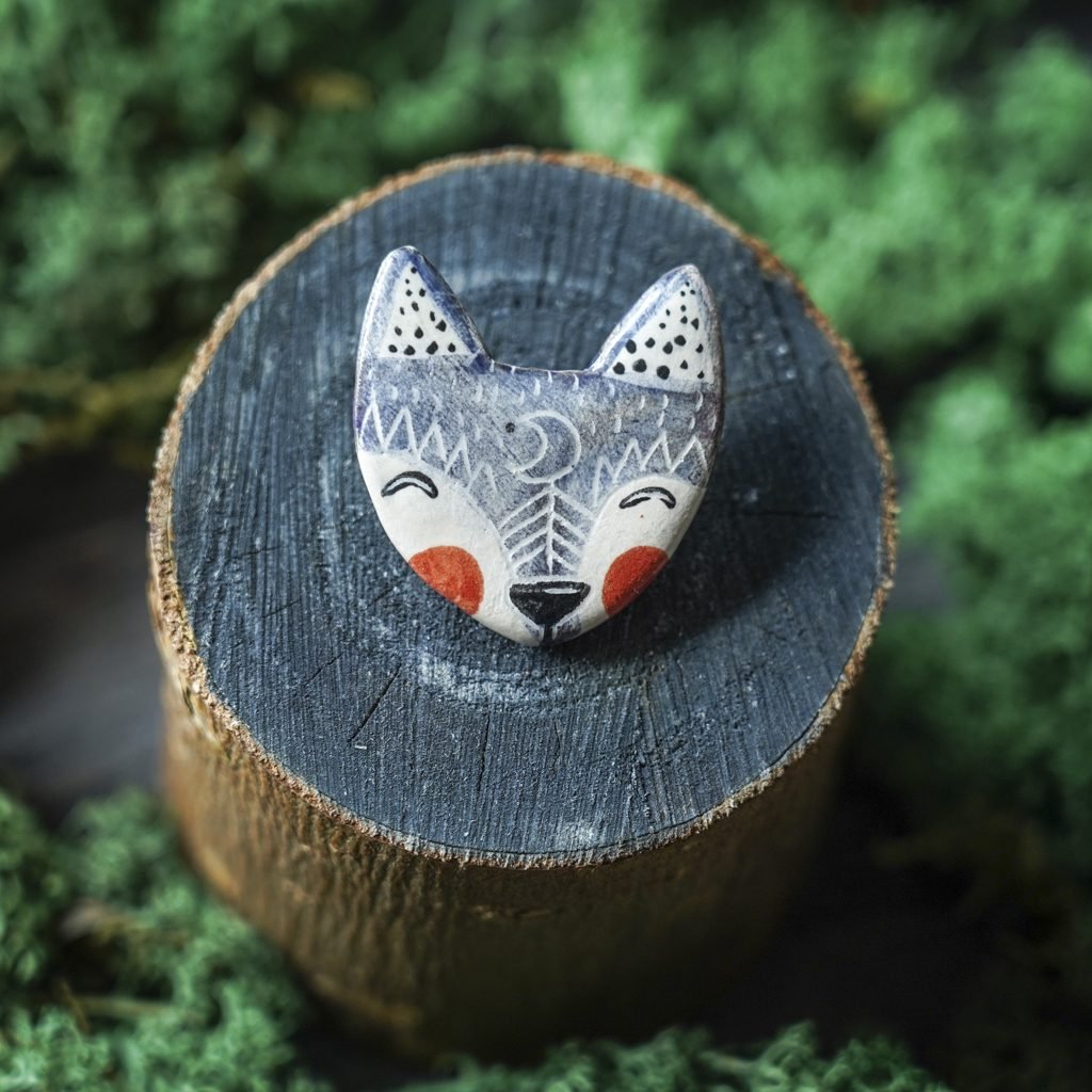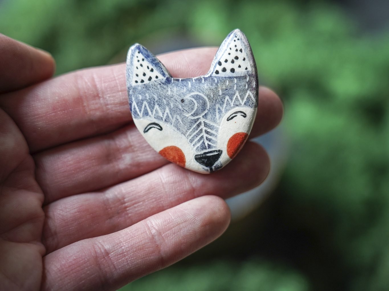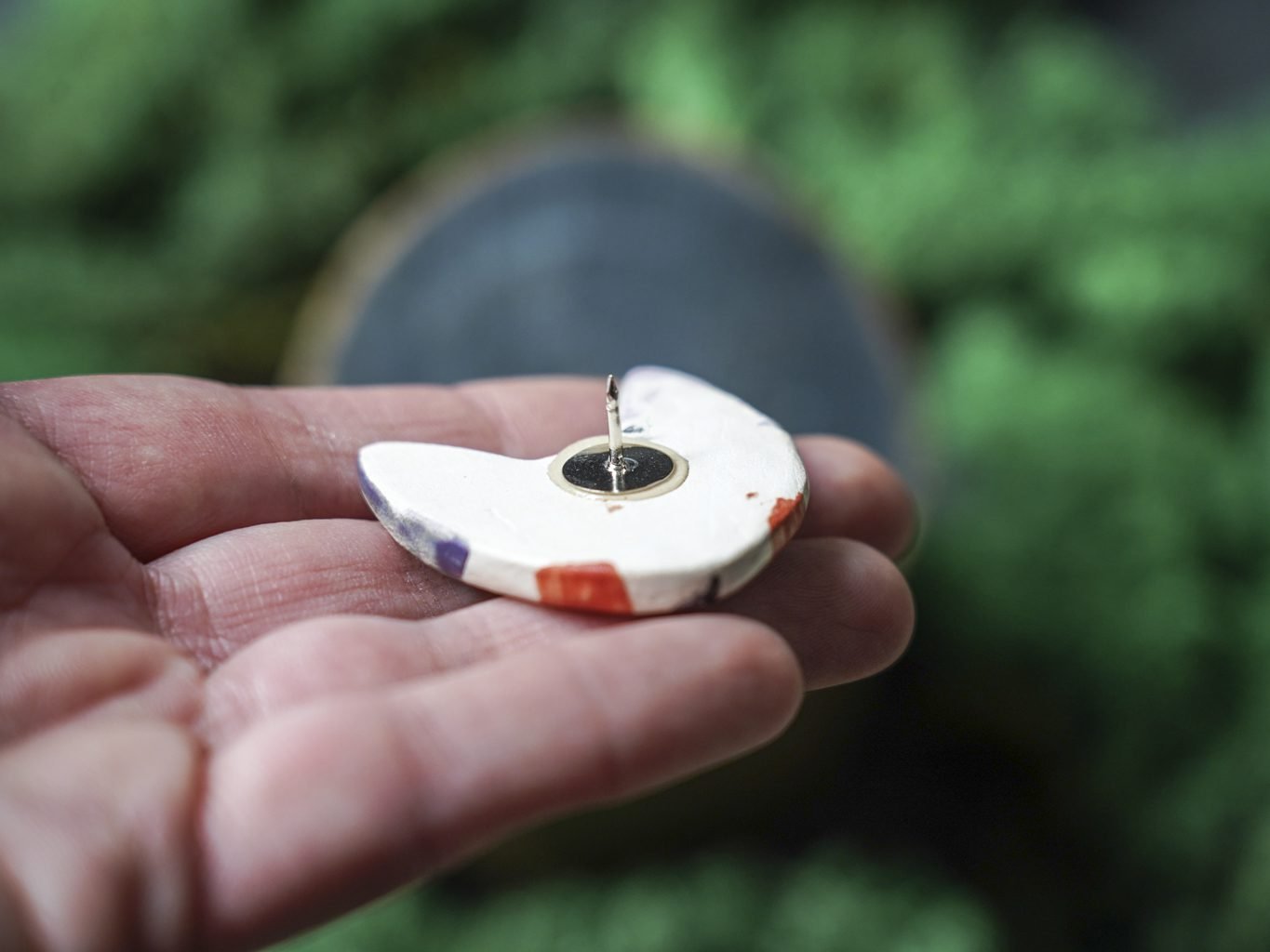 Papuošalai pagaminti iš keramikos. Iš molio nulipdytos formos išdegamos 1000 laipsnių temperatūroje, tada išpaišomos rankomis, padengiamos bespalve glazūra ir išdegamos antrąkart. Metalinė ženkliuko adatėlė pagaminta iš nerūdijančio plieno, kitoje pusėje užspaudžiama tvirta kietos gumos detale.